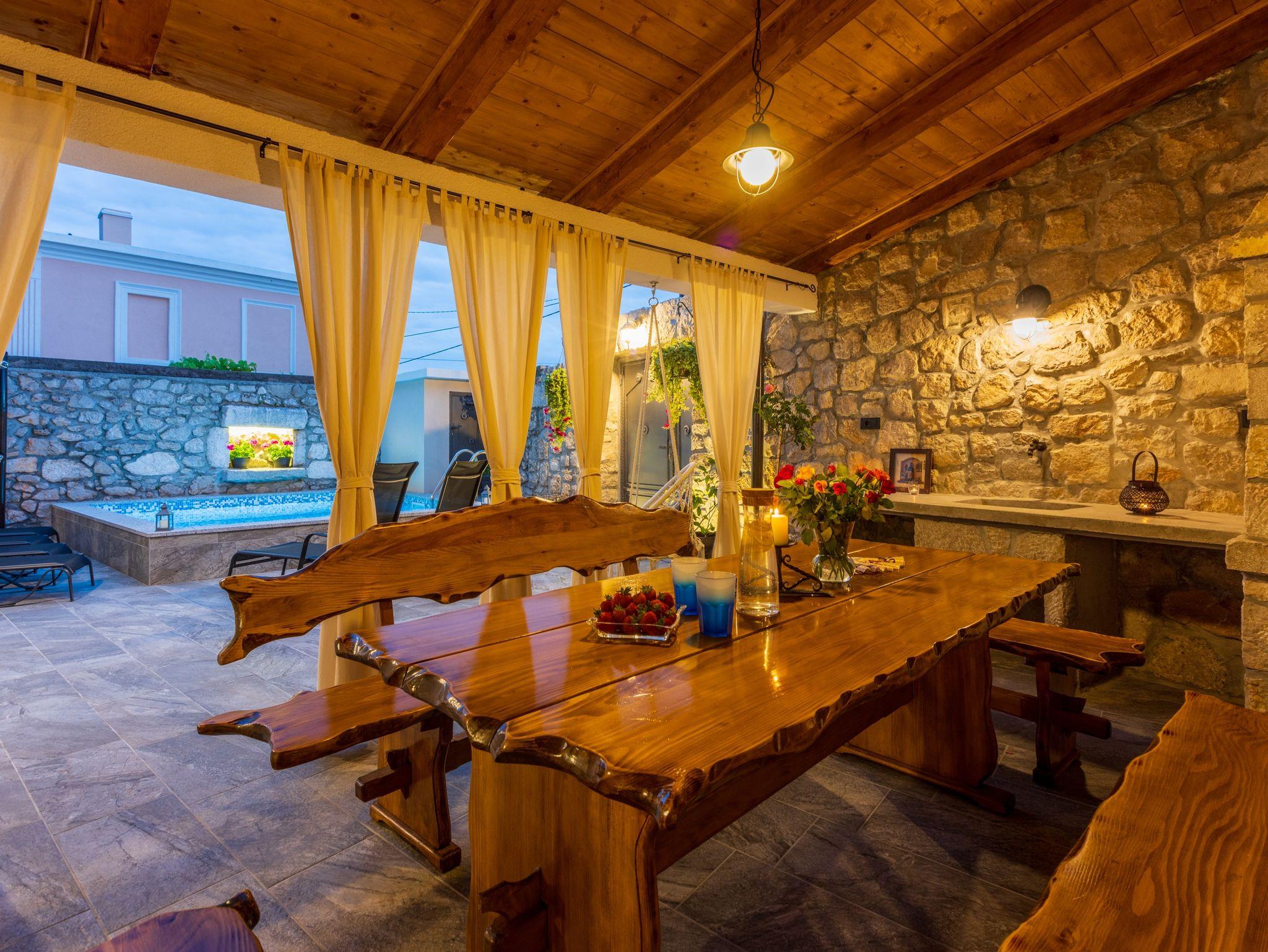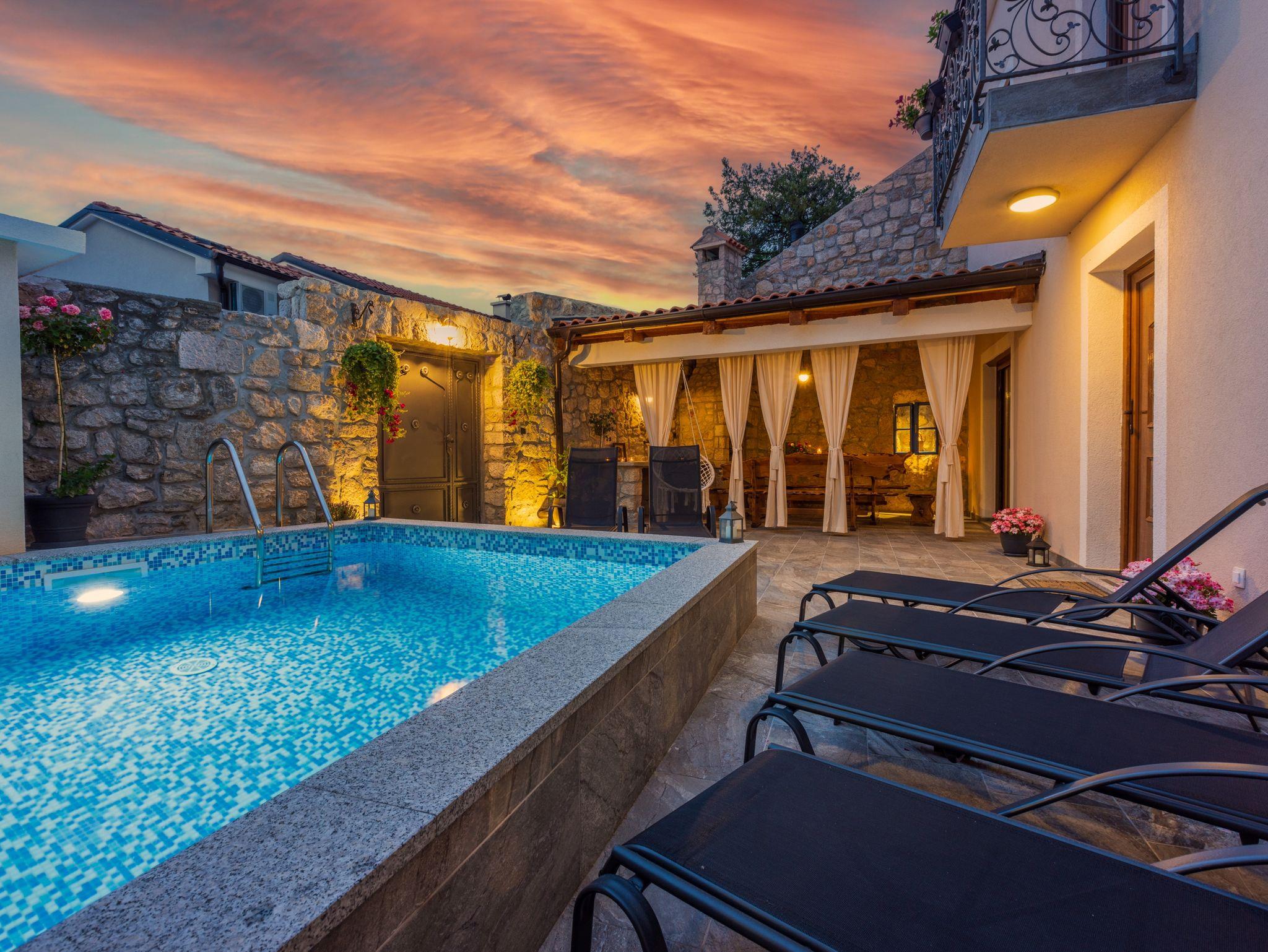 Hof (50m2, Kinderbereich, Sitzbereich), Parkplatz (Anzahl der Parkplätze: 2, Entfernung vom Objekt: 80 m), Pool: privat, Dimensionen: 3m x 3.5m x 1.6m, Wassertyp: Salzwasser, WiFi Internet, Föhn
