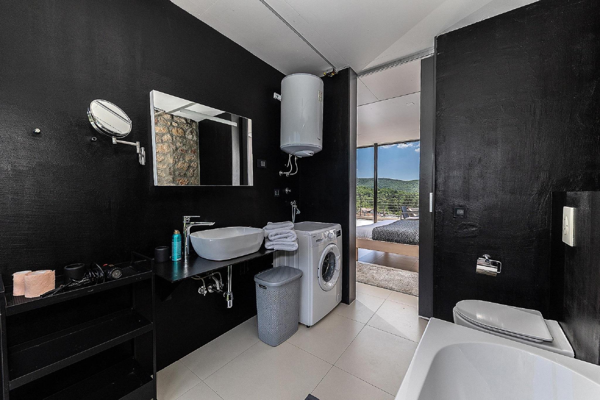 Ground floor: (Living room(double sofa bed, TV, seating area), Large kitchen(hob, hood, oven, microwave, dishwasher, fridge-freezer, washbasin), bathroom(washbasin, toilet, bidet, washing machine)) On the 1st floor: (bedroom(double bed), bedroom(single bed, double bed), bathroom(bathtub with shower, washbasin, toilet, bidet), terrace) grill, shower(outside), patio, garden, garden furniture, swimming pool(private, opened from May upto and including Sep)