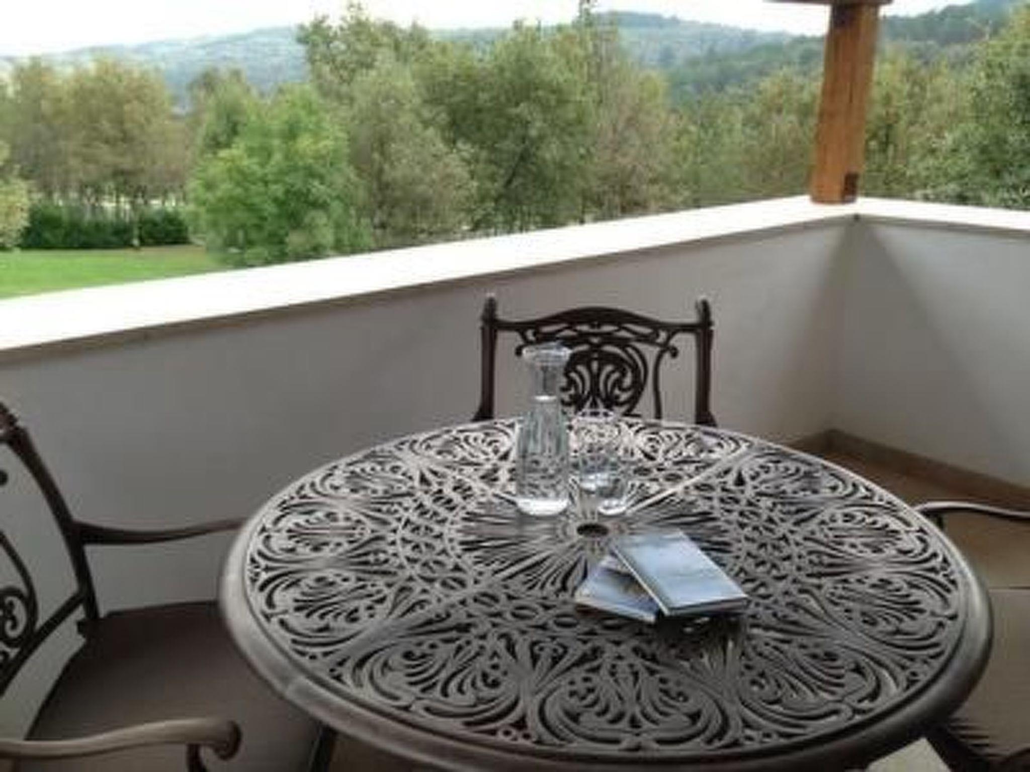 Stone house with pool near Grosznjan The house is located in a very quiet, rural setting in a small hamlet 3 kilometres from Grosznjan. As the house is situated in the green hills of the Istrian inland, there is often a pleasant cool breeze in midsummer. The view extends into the greenery all around. The ideal place to "unwind". Despite its quiet location, the house is an ideal starting point for excursions. The medieval fortified towns of Istria, such as Motovun or Buzet, are not far away. The sea can be reached in 20 minutes by car. The nearest good shopping facilities are in the small town of Buje and the house is located on the Istrian "olive oil road". The surrounding area offers many culinary highlights: the famous Istrian truffles, meat from Boskarin cattle, wild Istrian asparagus, wine from local cultivation, olive oil from the surrounding manufactories. Nearby Grosznjan is a small, beautiful medieval fortress, known as the "artists' village" because of its many galleries. It also has a good gastronomic offer. The house was purchased by a German family in 2013 and tastefully renovated and furnished in a rustic style. On the ground floor there is a well-equipped kitchen, a dining area for eight people, a shower room and a cloakroom. From the kitchen, a glass door leads out onto the covered terrace, where there is also a dining area. In the garden, in front of the terrace, is the swimming pool and on the upper floor there are three separate bedrooms for two people each, a toilet and a bathroom with bathtub. In the spacious living room there is a sofa area that can be converted into another double bed, a reading chair, a desk and the TV. The balcony on the upper floor offers another seating area with a table and four chairs. The house has very thick walls, so it stays cool in summer. Air conditioning units in all rooms ensure pleasant temperatures even on very hot days. There are mosquito blinds in the windows of the three bedrooms to ensure a peaceful night's sleep. With its central heating and radiators in all rooms, it is also suitable for winter. There is a cast-iron stove in the living room.