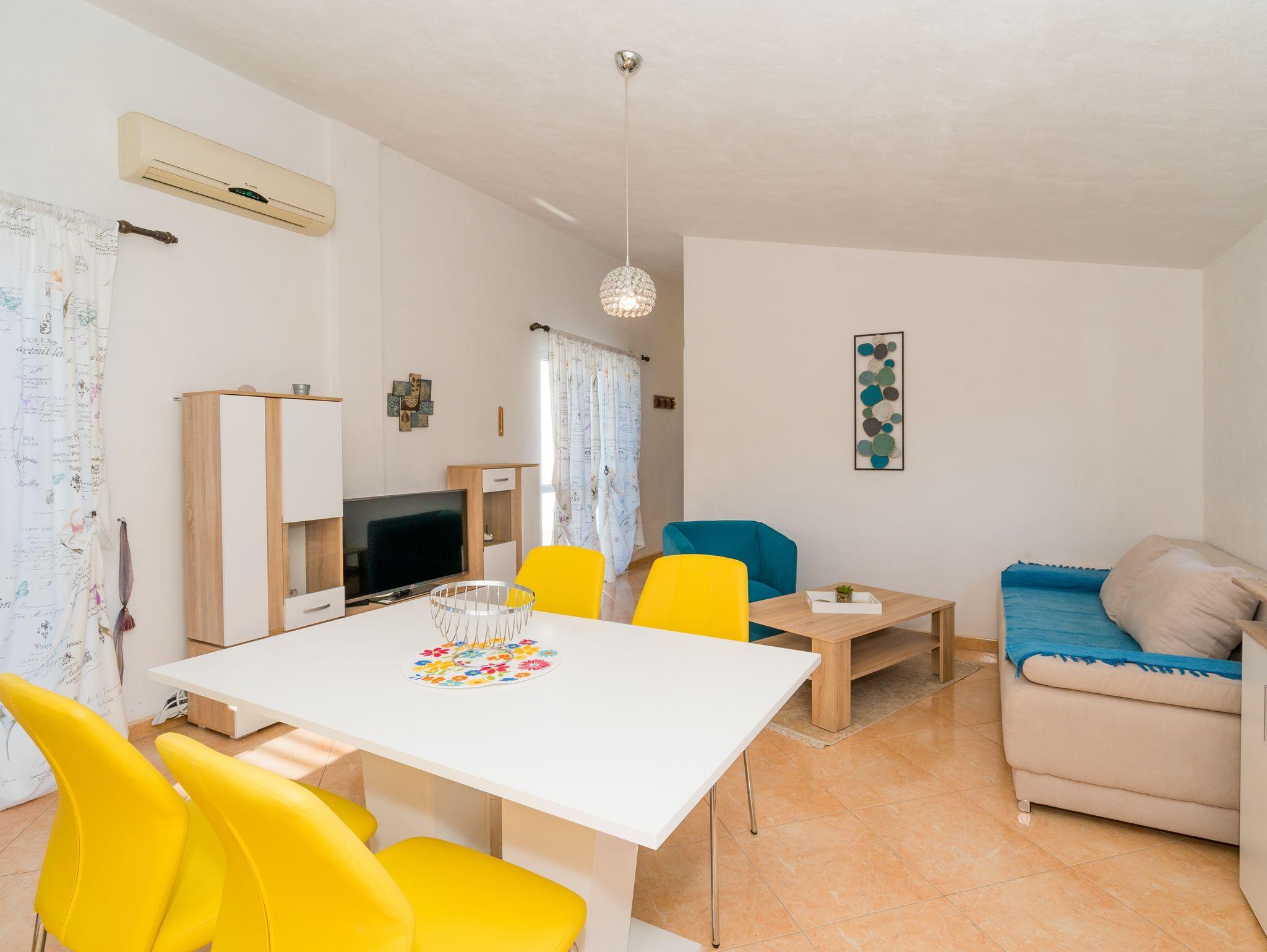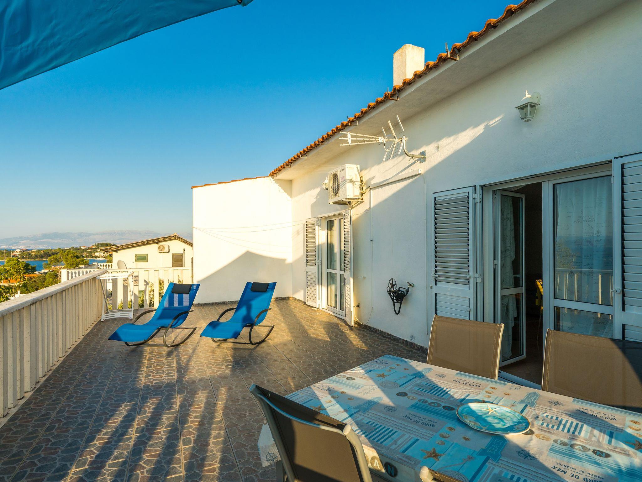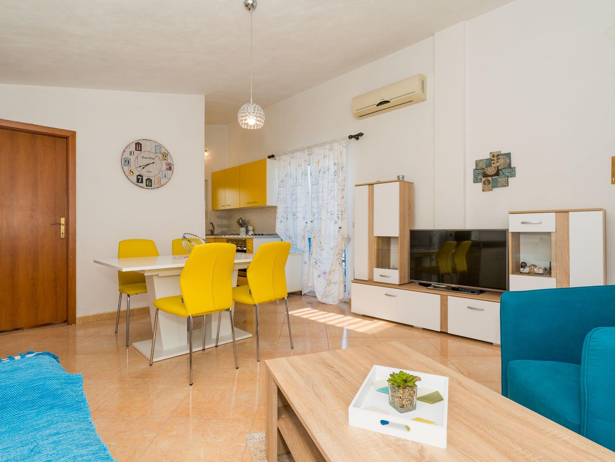 Ferienwohnung bietet Platz für 3 Gäste. Die Betten sind in Schlafzimmern, die es 1 gibt, und in Wohnzimmer, innerhalb einer Gesamtfläche von 41m2, angeordnet. Die Gäste haben eine eigene Terrasse zur Verfügung, auf der sie in warmen Sommernächten genießen können. Das Apartment bietet Meerblick. Es ist erlaubt, Speisen auf dem Gemeinschafts-Grill vorzubereiten. IM PREIS INBEGRIFFEN: Kurtaxe, Endreinigung, Klimatisierung, Parkplatz, Internet, Kinderbett, Bügeleisen, Bügelbrett, Föhn. VERBINDLICHE ZUSÄTZLICHE KOSTEN: Aufzahlung für Kurzaufenthalte (prozentualer Zuschlag pro Nächtigungsanzahl: 30% - 1, 20% - 2, 10% - 3). Die Verfügbarkeit zusätzlicher Dienstleistungen in Ihrem reservierten Termin und die Preise derselben (falls nicht aufgeführt) müssen im Voraus überprüft werden. Zusätzliche Dienstleistungen die in der Zahlungsaufforderung nicht aufgeführt sind werden direkt beim Vermieter bezahlt, angenommen der Gast nutzt auch diese. Ermäßigung auf den Grundpreis: Gratistag 14=13 (bei einem Aufenthalt von 14 Tagen oder mehr erhalten Sie einen Gratistag für den Aufenthalt bis 31.12.26).