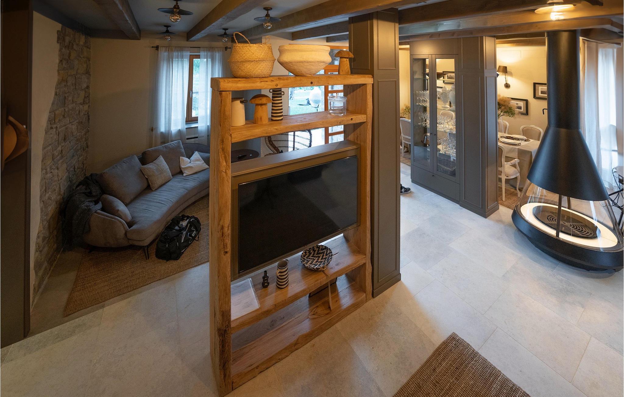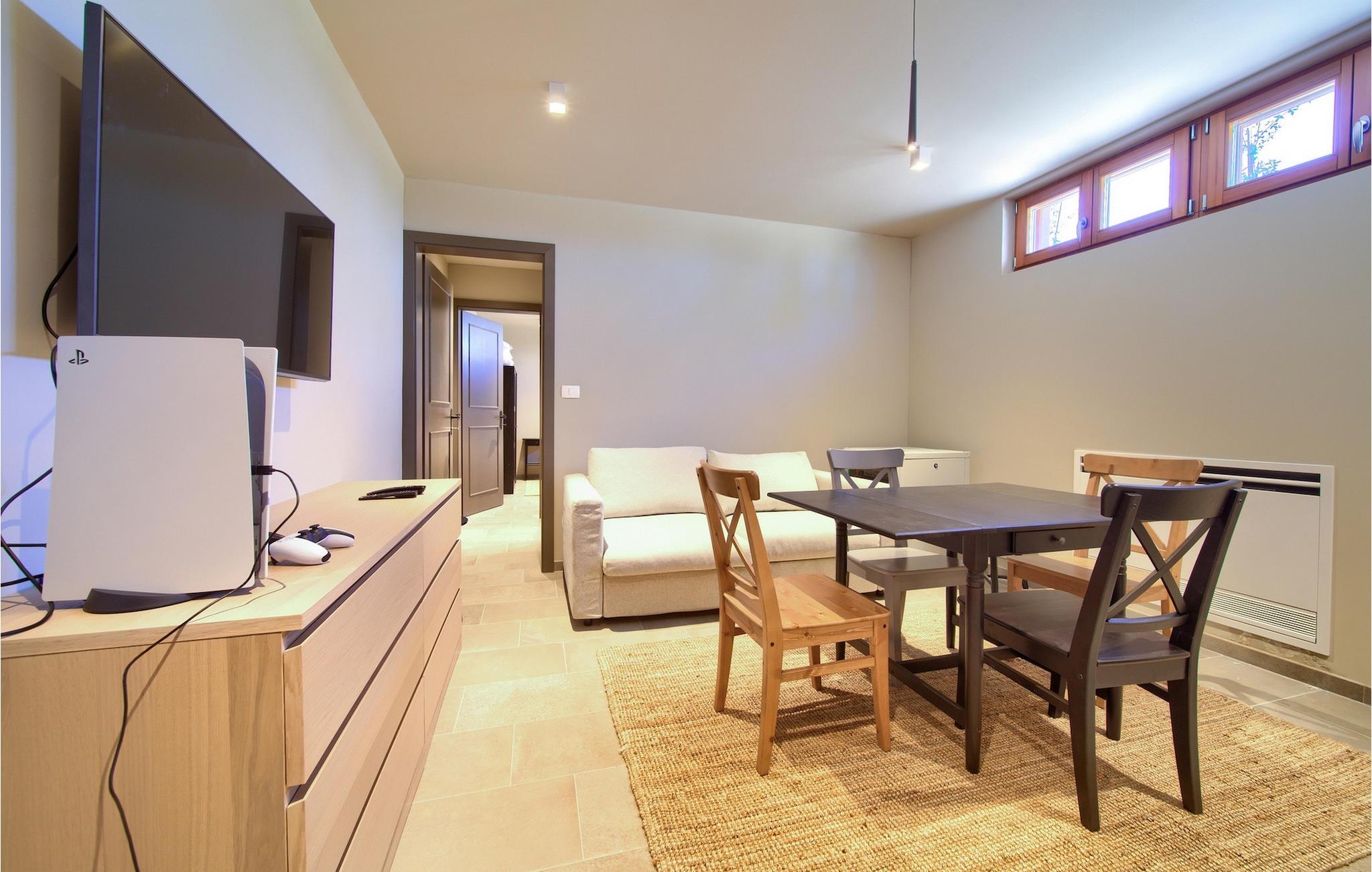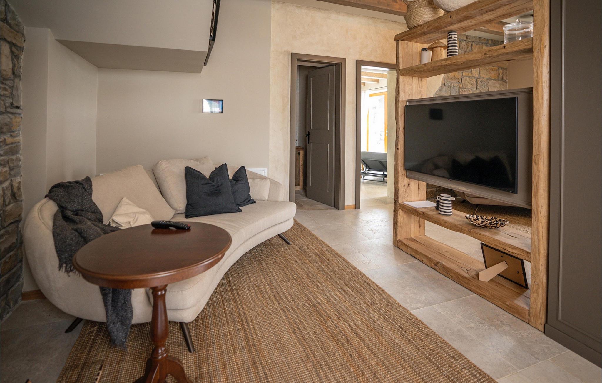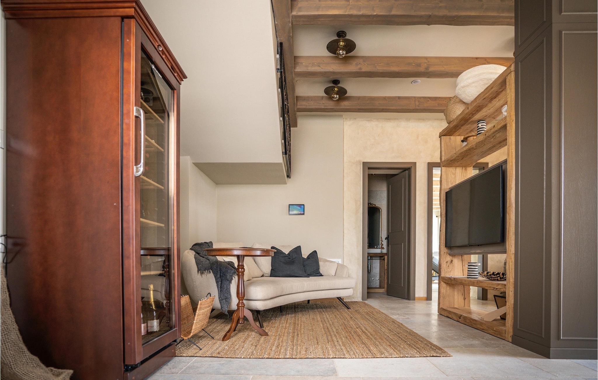 Træd ind i villaens rustikke interiør af høj kvalitet. Elementer lavet af sten og træ får hele opholdsrummet til at se meget hyggeligt ud, og alligevel vil du sætte pris på den moderne teknologi. Ud over opholdsområdet venter et professionelt, fuldt udstyret køkken og den smarte spiseplads på dig.