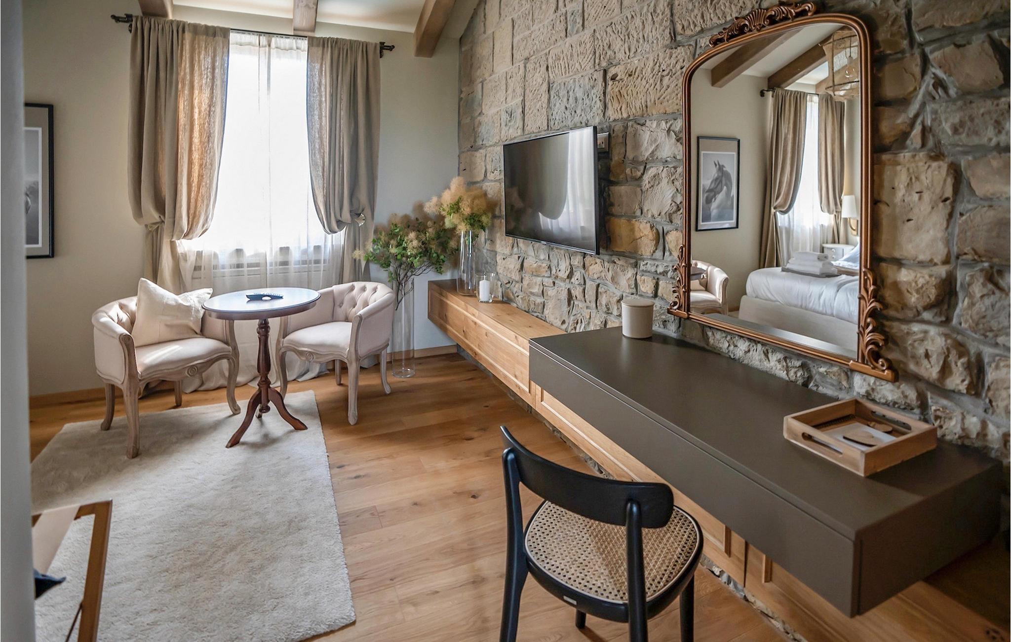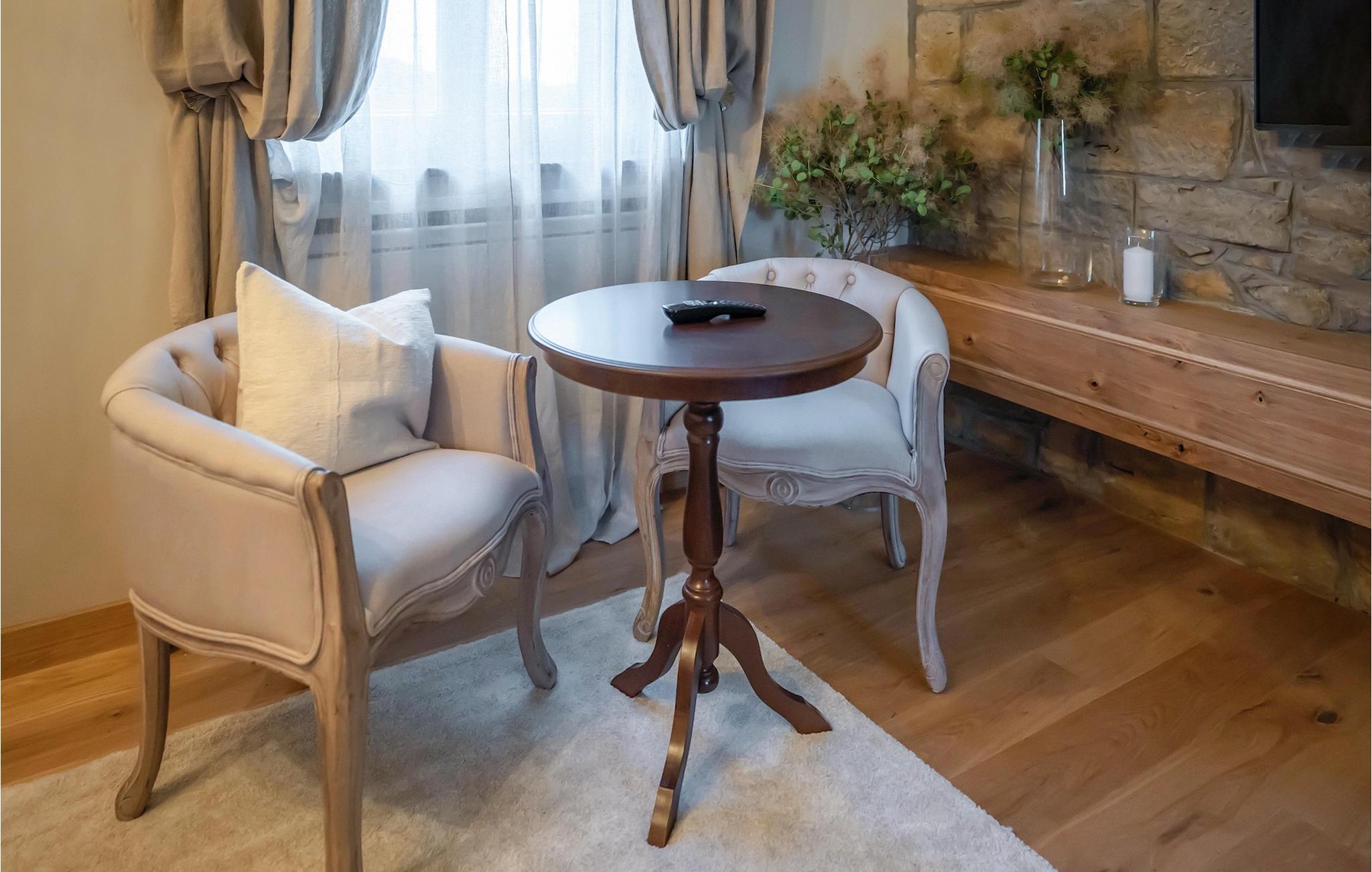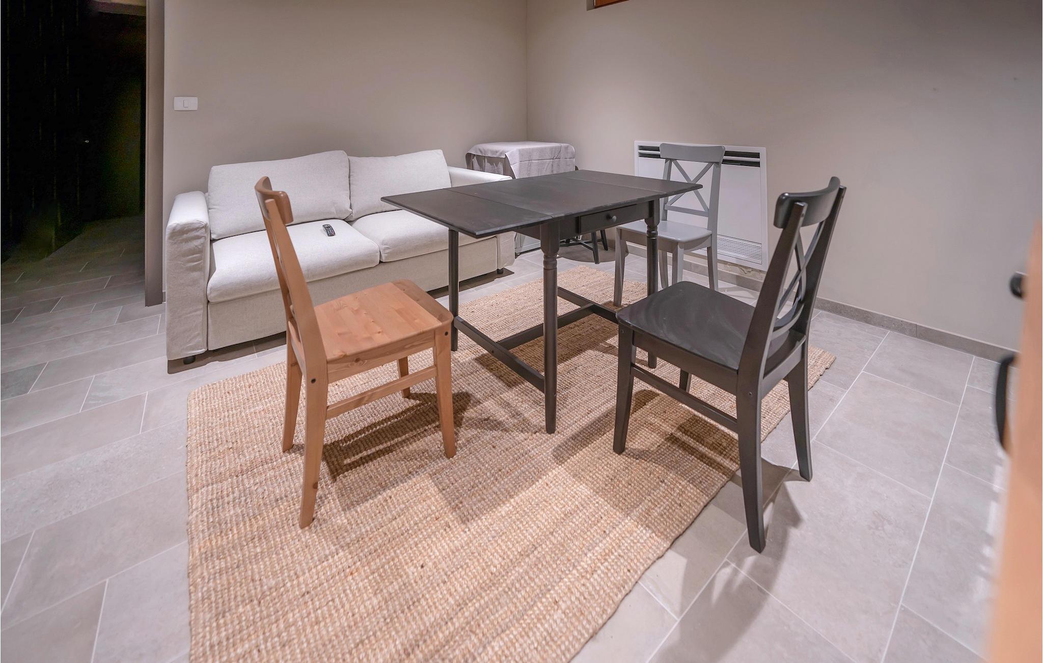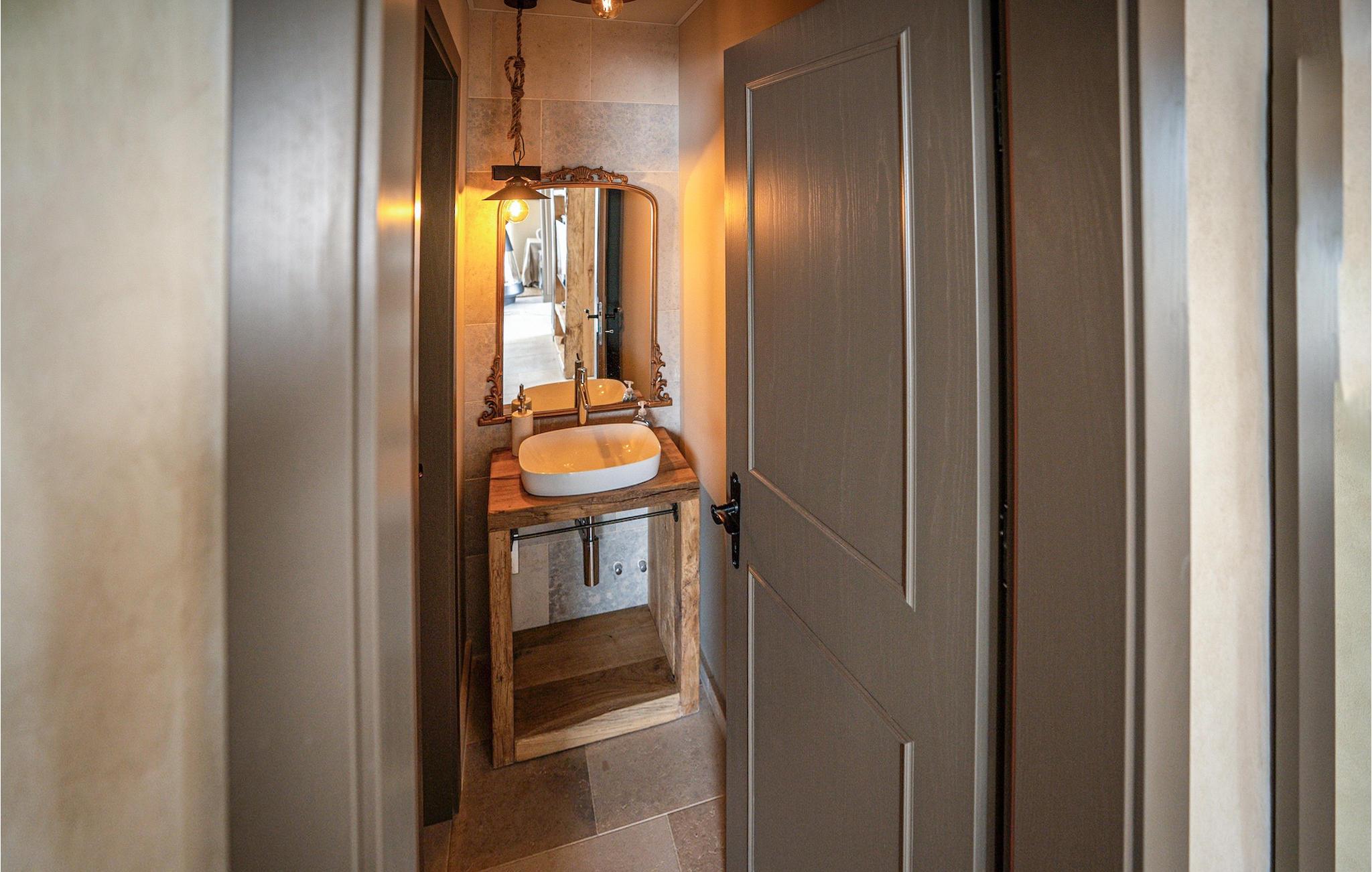 Træd ind i villaens rustikke interiør af høj kvalitet. Elementer lavet af sten og træ får hele opholdsrummet til at se meget hyggeligt ud, og alligevel vil du sætte pris på den moderne teknologi. Ud over opholdsområdet venter et professionelt, fuldt udstyret køkken og den smarte spiseplads på dig.