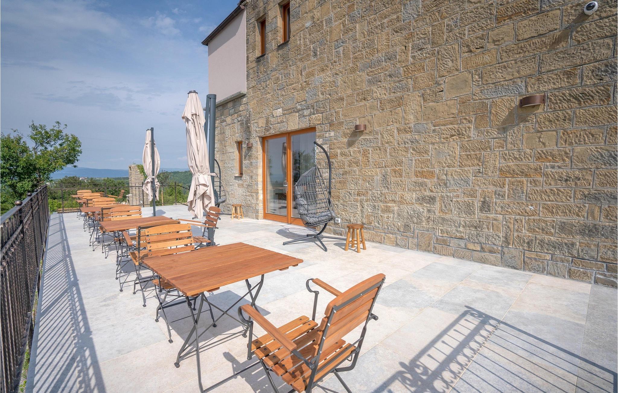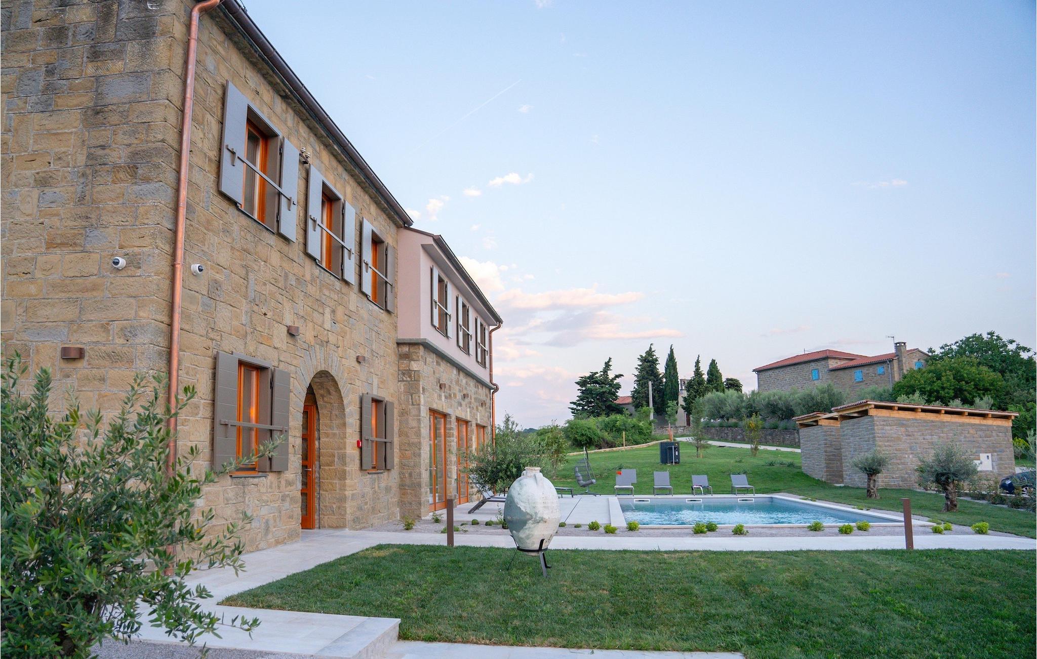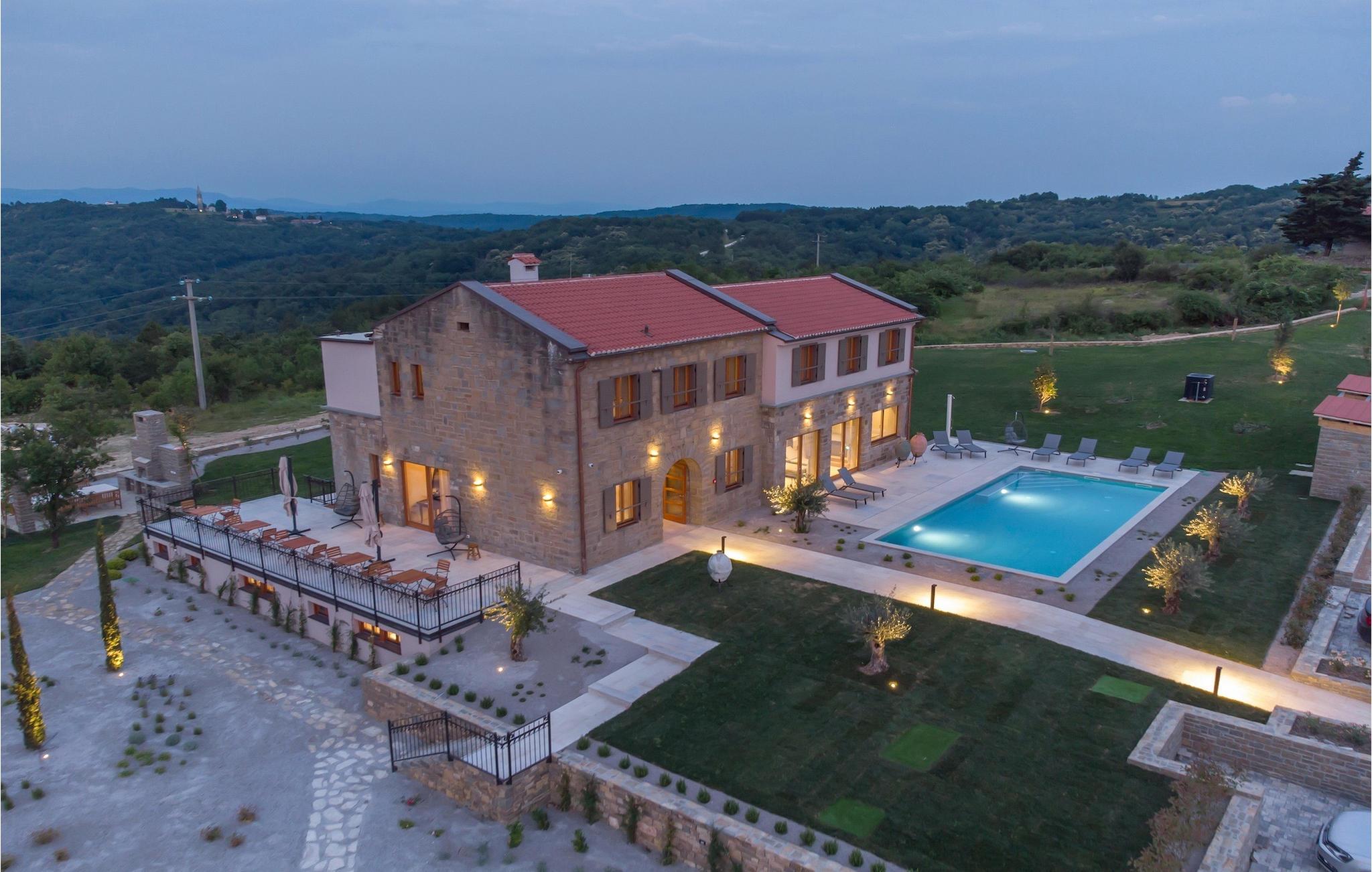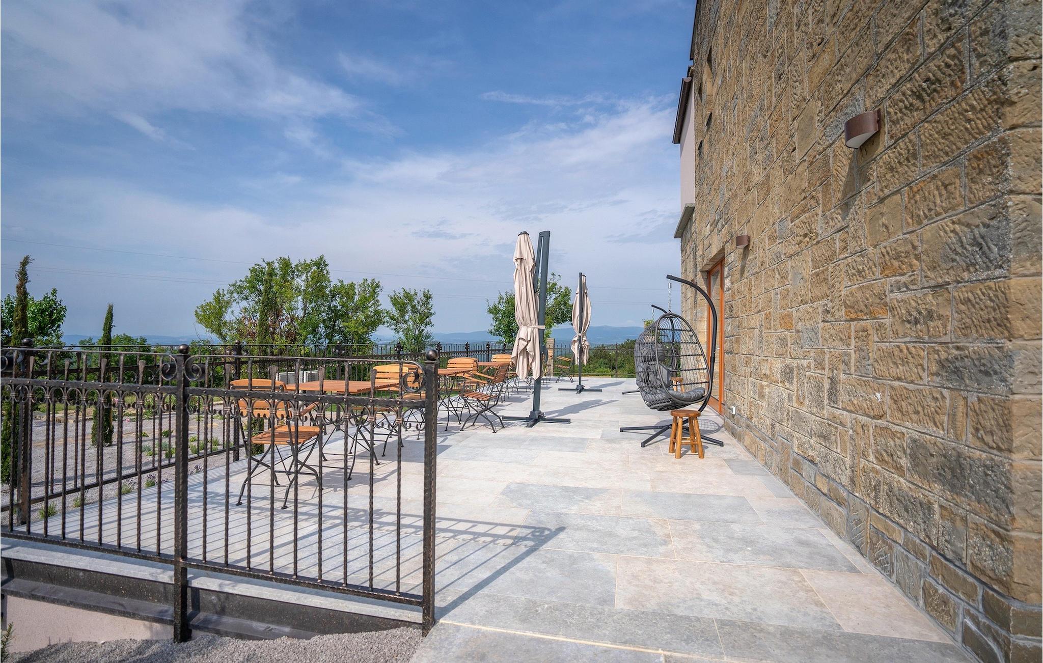 Den storslåede Villa Paradiso dIstria kan virkelig blive dit personlige paradis på jorden. Den imponerende bygning står på en bakke i det nordlige Istrien, omgivet af det fantastiske landskab. Med den smukke panoramaudsigt vil du helt sikkert komme til ro. Hjertet i villaen er dog den forfriskende 61m2 udendørs pool, hvor du sandsynligvis vil nyde det meste af din velfortjente ferie. Komfortable liggestole inviterer dig til at slappe af, mens du bliver forkælet af den istriske sol. Grillpladsen er ideel til at vise dine grillfærdigheder frem og nyde lækre måltider med lokale specialiteter sammen med familie og venner.