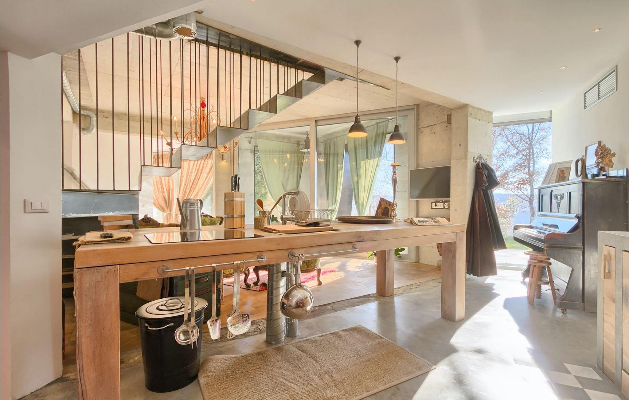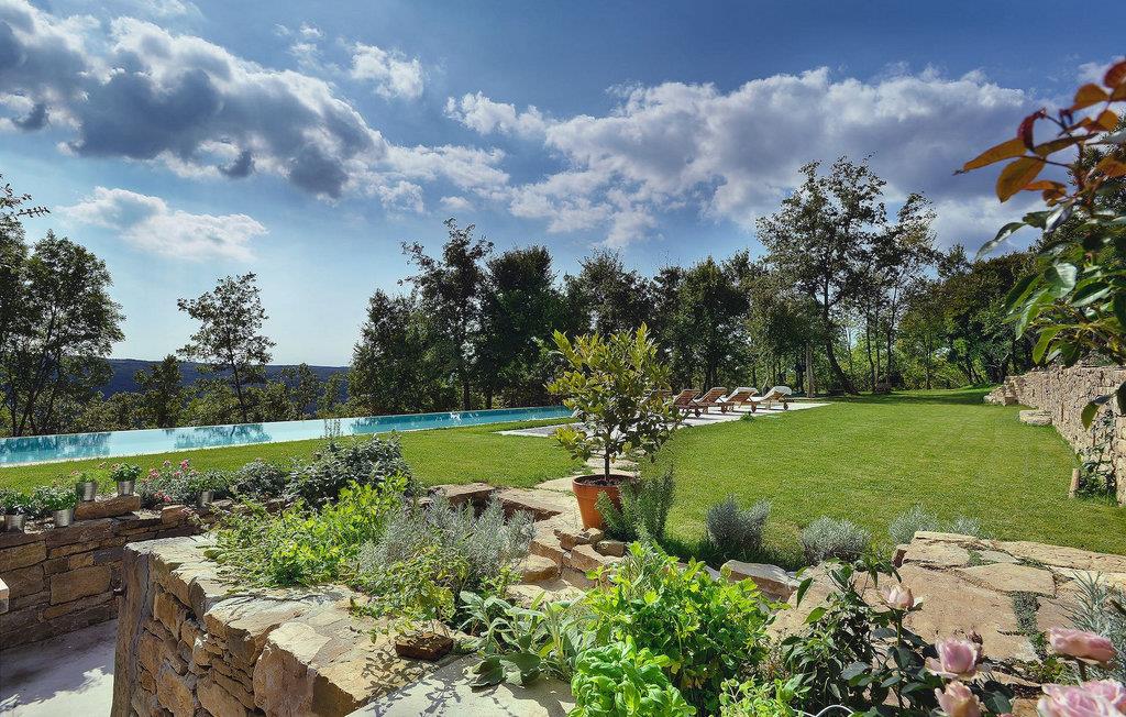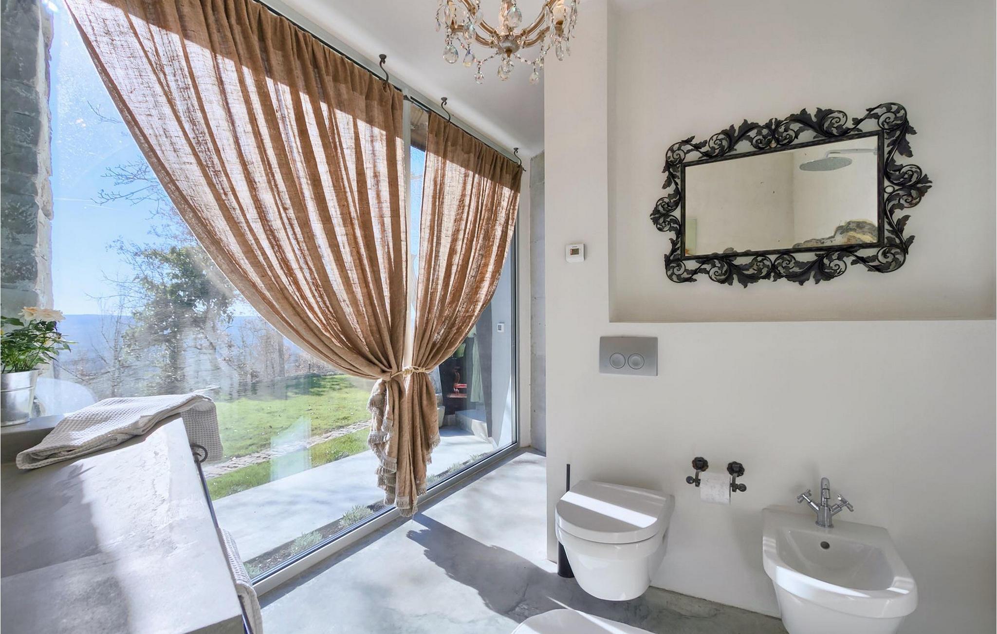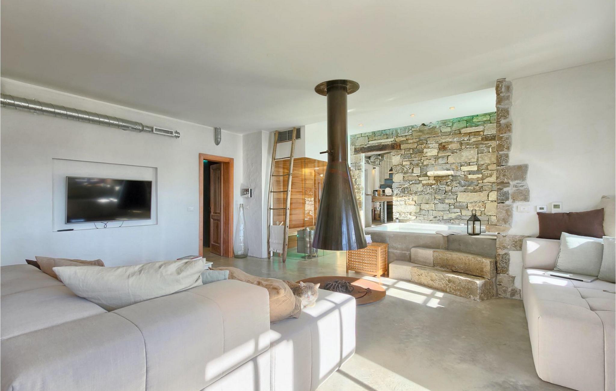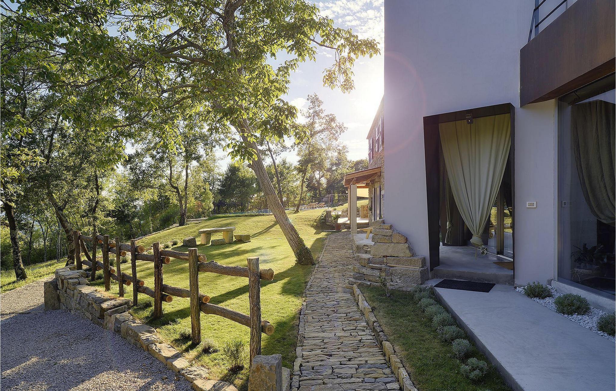 Beliggende for enden af en privat vej, er dette utrolige feriehus lige uden for den maleriske middelalderby Grožnjan virkelig et unikt fund. Når man kører ned til ejendommen, kan du ikke lade være med at føle en følelse af forventning: at blive til et fantastisk åbent rum omgivet af træer og endelig dit sommerhus. Det er svært ikke at blive overvældet af omgivelserne og den spektakulære, vidtrækkende udsigt over vinmarkerne, olivenlundene og skoven i det pragtfulde istriske landskab. Svømmebassinet, der er skulptureret ind i grunden og placeret ved siden af bakken, er designet på en måde, hvorved kanten simpelthen forsvinder, i en herlig kulisse, der giver det magiske panorama. Villaens enestående design er lige så fantastisk med dets omhyggeligt planlagte ydre, der kan prale af traditionelle elementer fra det autentiske istriske stenhus med klare, sofistikerede linjer i det moderne tårn. Det skaber den perfekte blanding af moderne elementer, der fremhæver, ikke tager væk, fra den mere traditionelle og originale del af huset. Et moderne bud på den autentiske istriske facade omslutter et cool, moderne interiør inspireret af det industrielle design. De indendørs områder er intime, men åbne, og det uafbrudte klare spænd skaber en bro, hvorunder de konventioner, der definerer indendørs rum, forsvinder. Indrettet til en meget høj standard med et professionelt køkken, gode opholdsområder, 3 store airconditionerede soveværelser med moderne ensuite badeværelser, synes denne fantastiske villa at samle fortid og nutid på en trendy måde. Udsatte metalrør, kanaler, forvitrede grå vægge, moderne kunst og smarte pendellamper komplementerer vintagemøblerne, stilfulde detaljer, træpaneler og stenvægge, som giver interiøret en varm, indbydende aura, der fremhæver boligens industrielle charme.