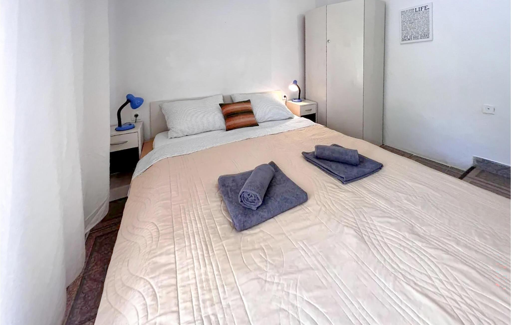 Den lyse og indbydende lejlighed, med sine varme farver og komfortable møbler, skaber en indbydende atmosfære. Den lille spiseplads og det praktiske tekøkken tilbyder alt, hvad I behøver til en afslappende ferie og fælles måltider. Her kan I slappe af, nyde freden og roen og afslutte dagen med et glas vin.