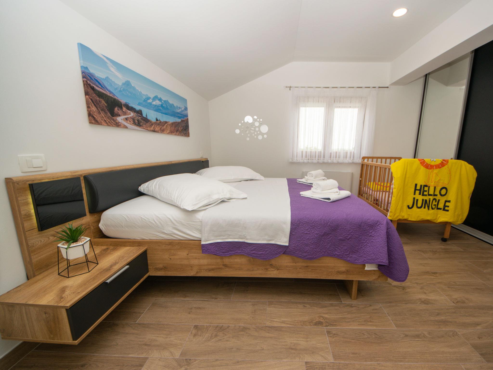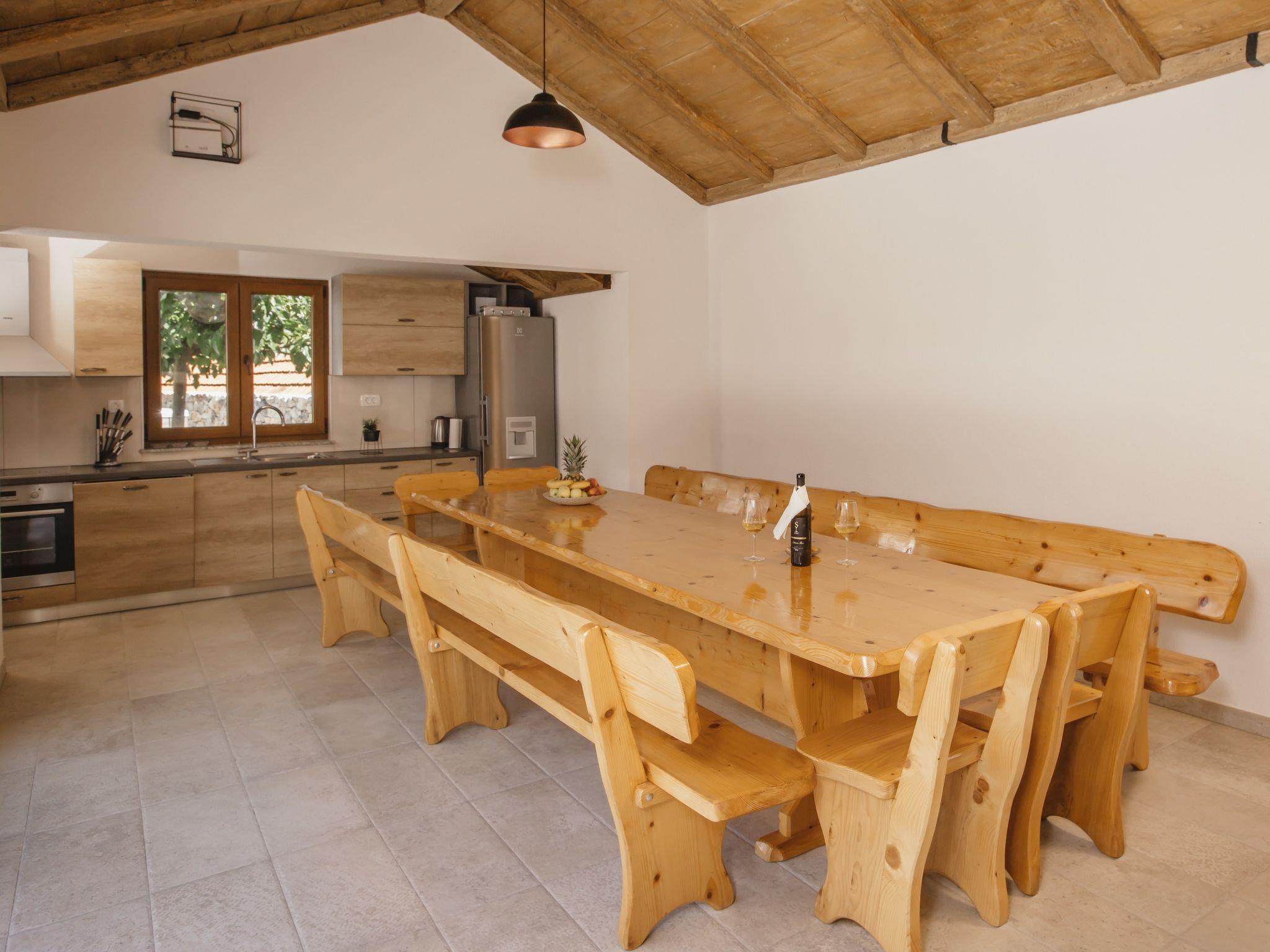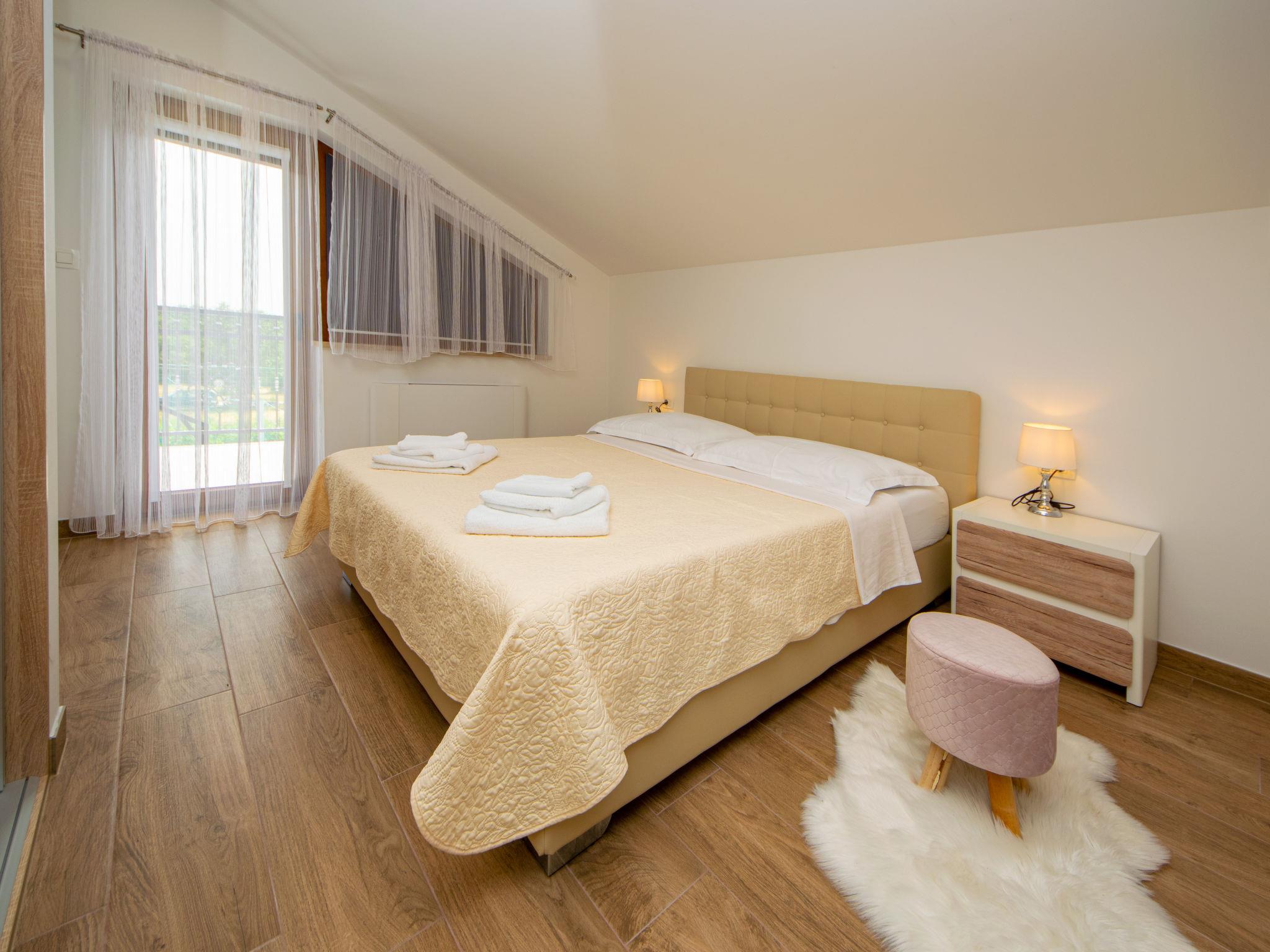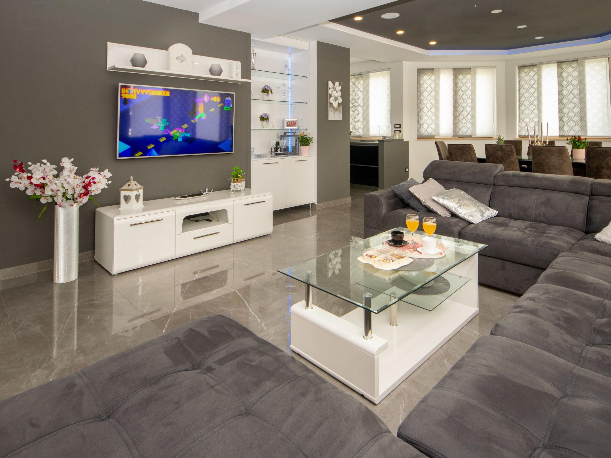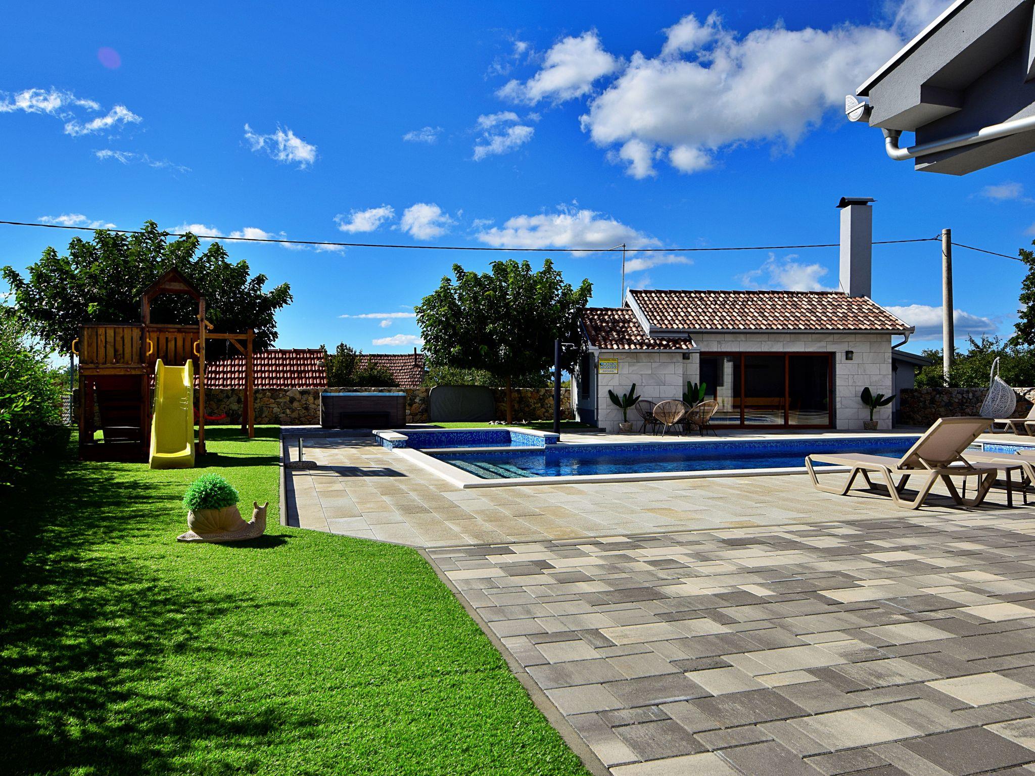 Gornji Proložac 6 km from Imotski: Child friendly, modern, beautiful villa "Oasis of peace", 2 storeys, built in 2019. In a quiet, sunny position, 38 km from the sea. Private: property 1'370 m2 (fenced), swimming pool angular, heated (12 x 5 m, depth 150 cm, seasonal availability: 01.May. - 01.Oct.) with internal staircase and salt-electrolysis pool-cleaning system. Paddling pool, outdoor shower, hot tub, pool house with fridge, WC and cooking stove, barbecue, children's playground (slide, swing). In the house: internet access, storage room for bicycles, washing machine. Available: bicycles. Parking (for 4 cars) at the house on the premises. Shop 6 km, restaurant 1 km, bus stop 7.3 km, pebble beach 38 km. Walking paths from the house 1 km, cycle lane 1 km. Well-known lakes can easily be reached: Modro jezero 1 km, Crveno jezero 1 km. Please note: suitable for families. The owner does not accept any youth groups. It is necessary to announce 7 days in advance if the pool heating is required. Pool house: kitchen with dining table and satellite TV. Private: small football playground (included).