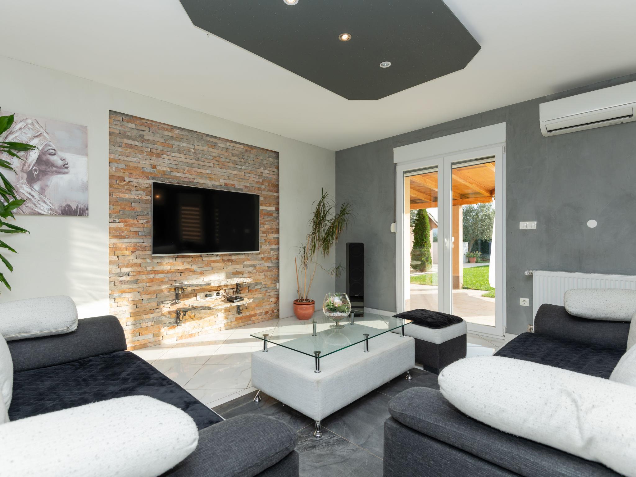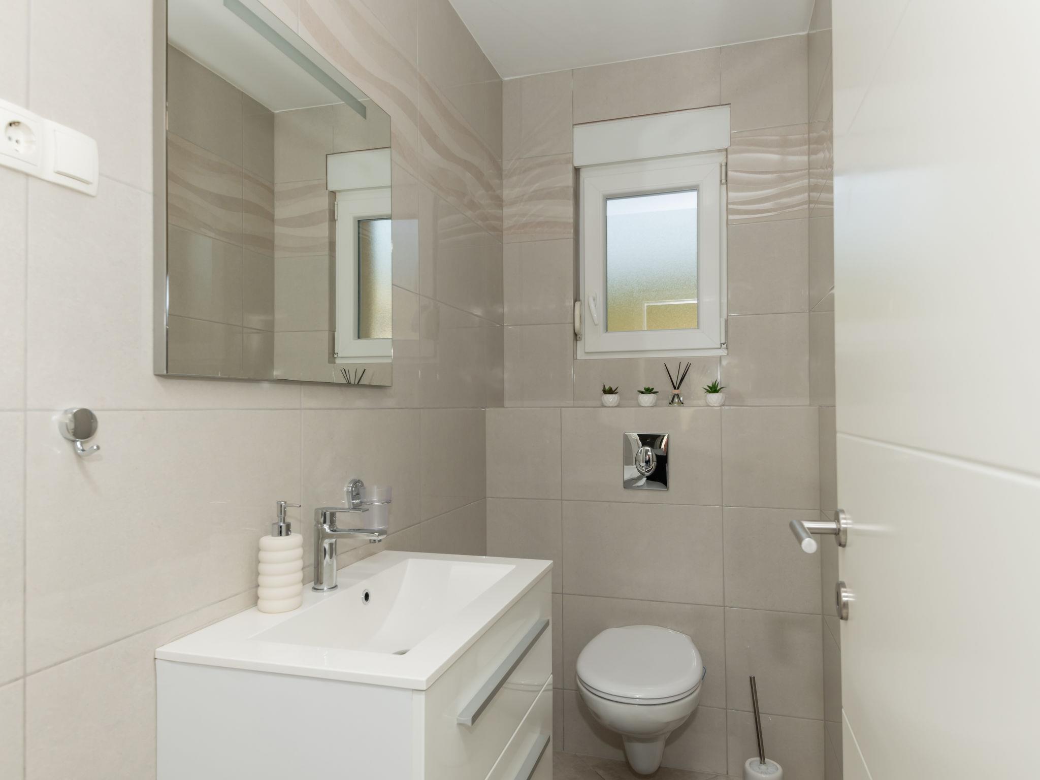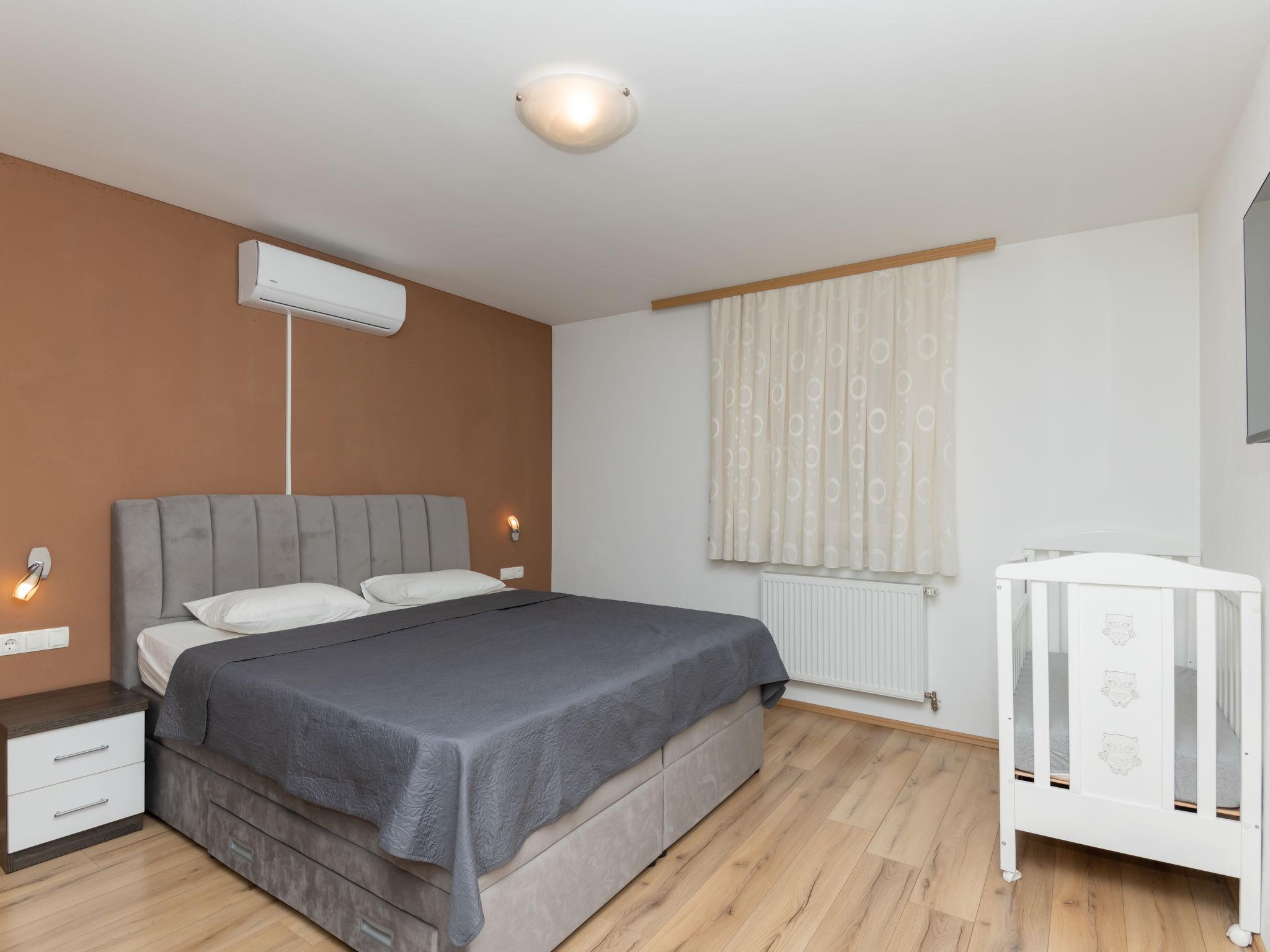 5-room house 140 m2, on the ground floor, south facing position. Living/dining room with satellite TV (flat screen), air conditioning. Exit to the terrace. 1 room with 1 french bed (180 cm, length 200 cm), shower/WC and air conditioning. 1 room with 1 french bed (180 cm, length 200 cm), satellite TV and air conditioning. 1 room with 1 double bed (2 x 90 cm, length 200 cm). 1 room with 1 french bed (180 cm, length 200 cm), air conditioning. Open kitchen (oven, dishwasher, 4 ceramic glass hob hotplates, kettle, microwave, freezer, electric coffee machine). Shower/WC, sep. WC. Terrace 25 m2, roofed. Terrace furniture, deck chairs (8). Facilities: children's high chair, baby cot, hair dryer. Internet (WiFi, free). 102