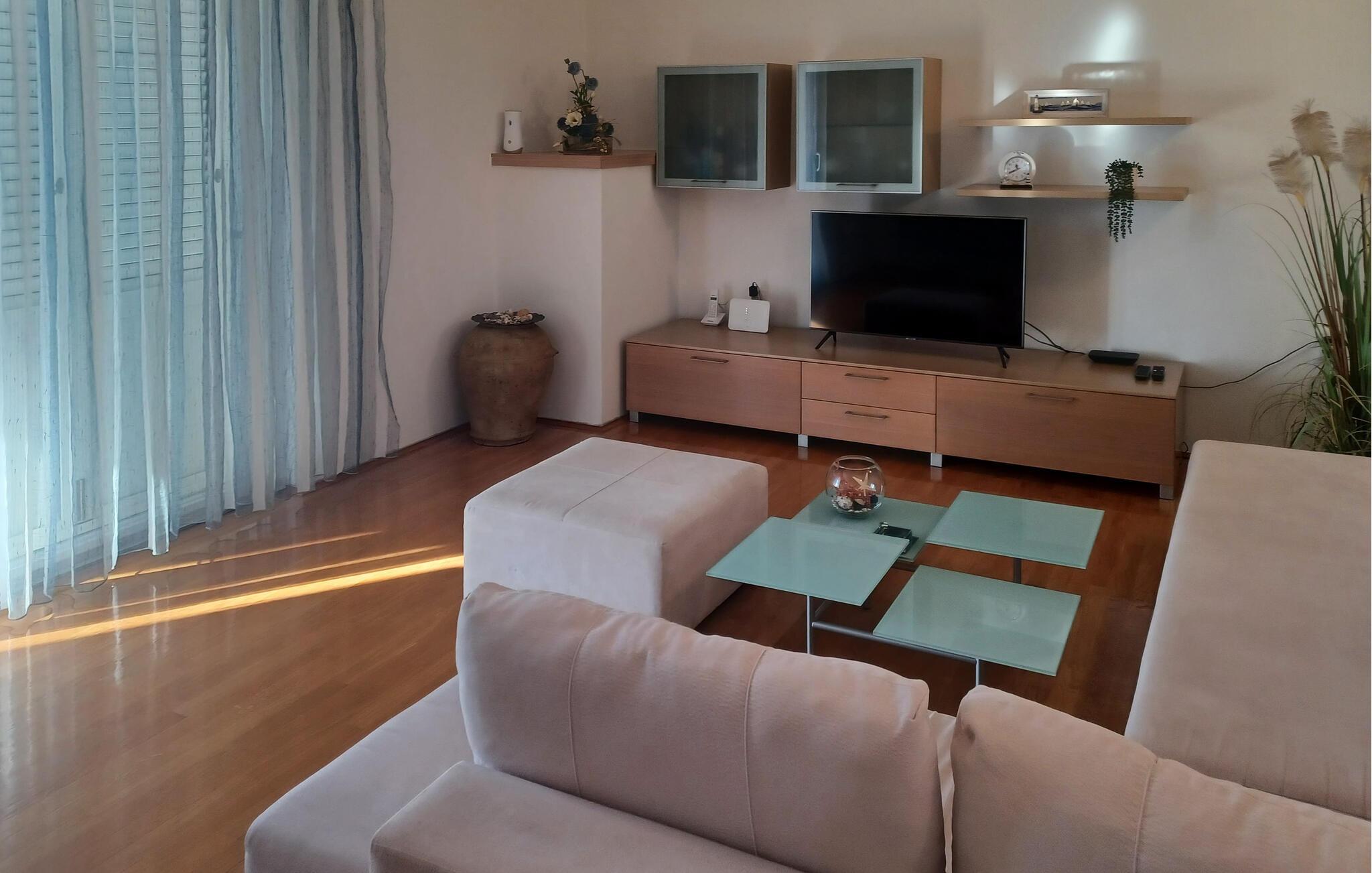 Et lyst og smagfuldt møbleret interiør byder jer velkommen til denne rummelige og komfortable badelejlighed. Tilbered jeres lækre retter i det fuldt udstyrede køkken og nyd dem i den stilfulde spiseplads. Efter en begivenhedsrig dag kan I slappe af i det hyggelige sofaområde, streame en god film eller fordybe jer i en spændende bog.