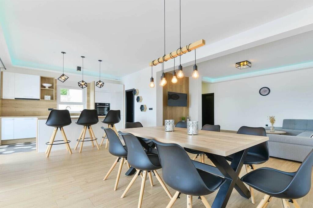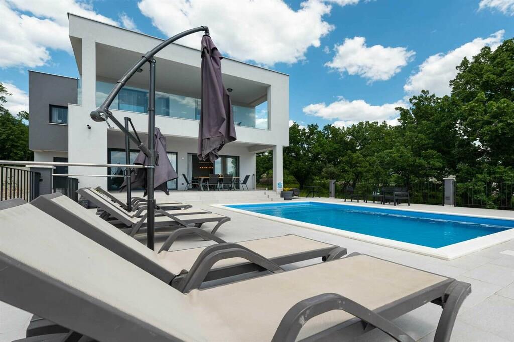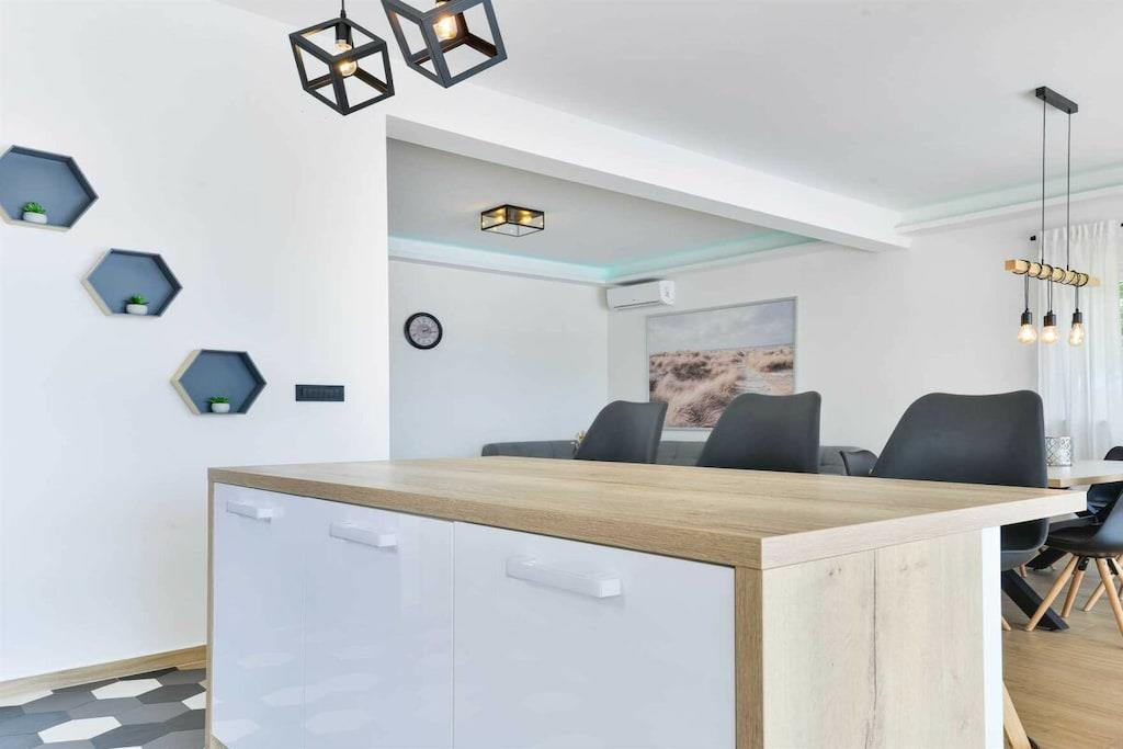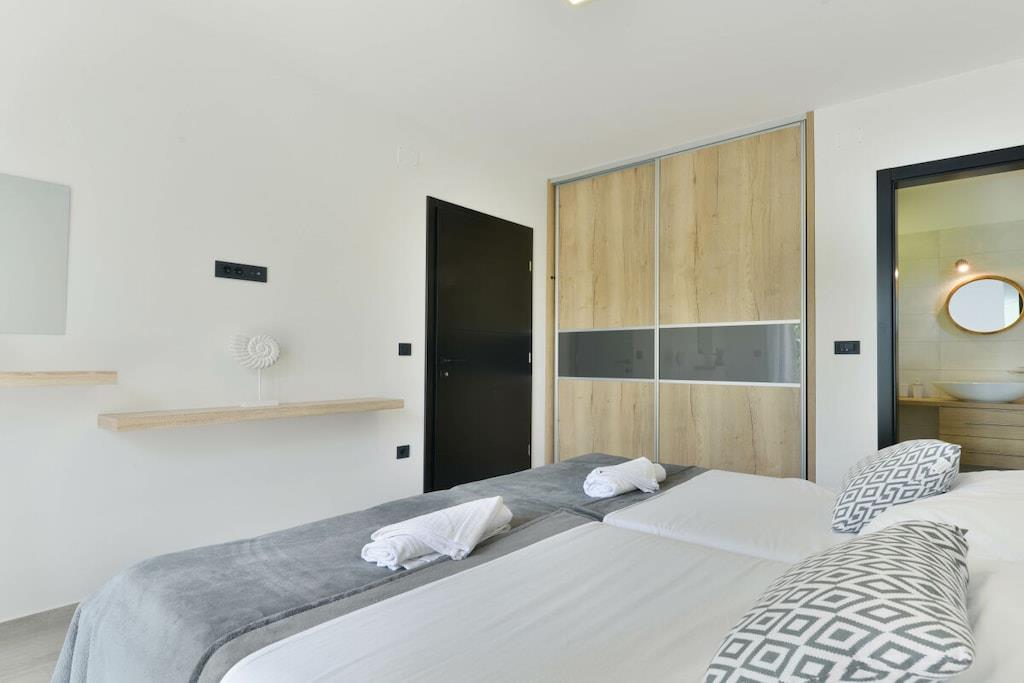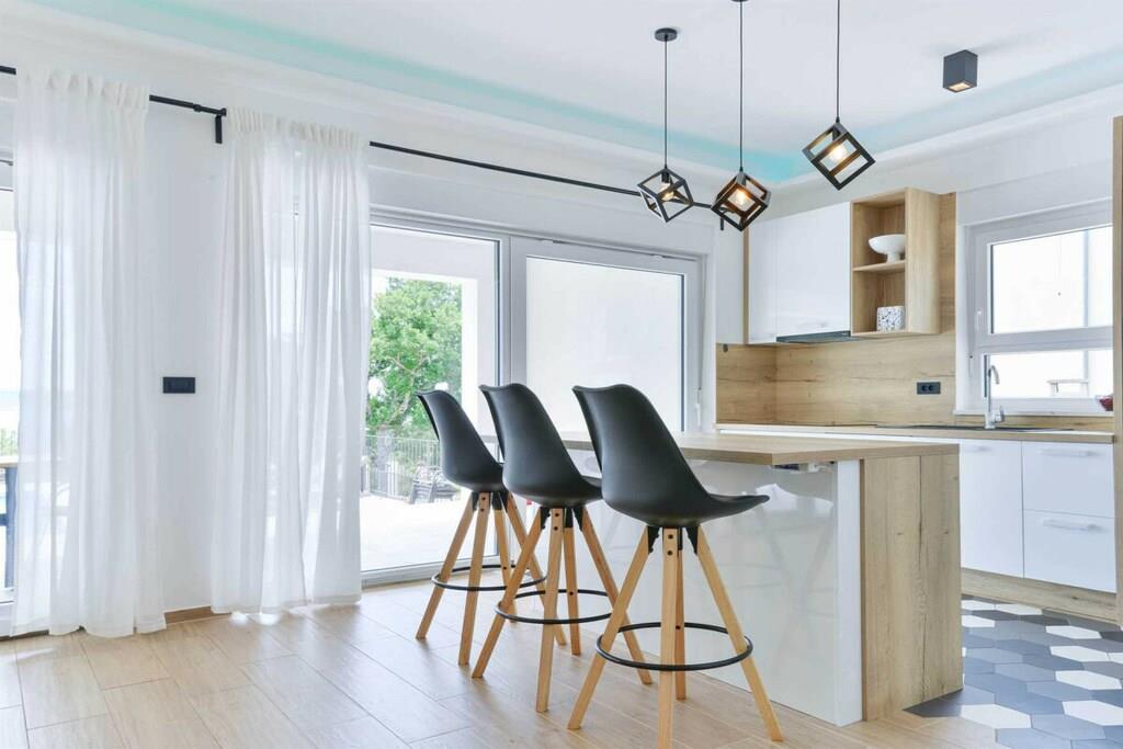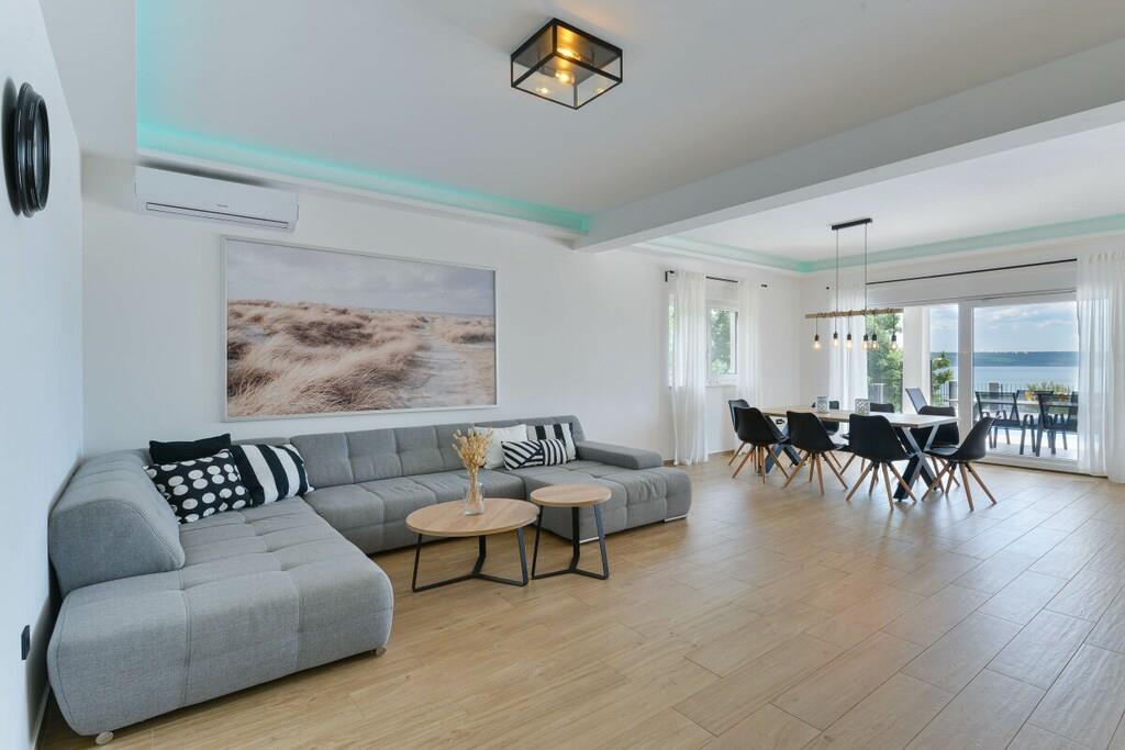 Diese luxuriöse 4 * Villa, nur 70 m vom Strand entfernt, wird Sie atemlos machen. Dies ist eine Oase der Ruhe und Entspannung für alle Sinne. Villa besteht aus vier Schlafzimmern, jedes mit eigenem Bad. Zwei von ihnen haben eine Terrasse und einen atemberaubenden Blick auf das Meer. Im Erdgeschoss befinden sich eine geräumige, voll ausgestattete Küche, ein Esszimmer, ein Wohnzimmer, eine Terrasse mit Zugang zum Außenpoolbereich mit Liegestühlen, ein Grillplatz, eine Tischtennisplatte und fünf gesicherte Parkplätze. Die Villa wurde in einem hochwertigen, spezifischen Industriestil eingerichtet, der sich durch das gesamte Innere zieht und auch perfekt mit dem Äußeren dieser modernen Villa harmoniert.
