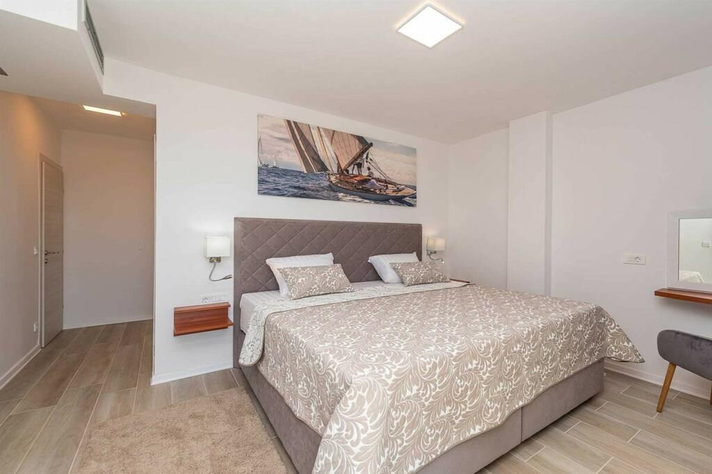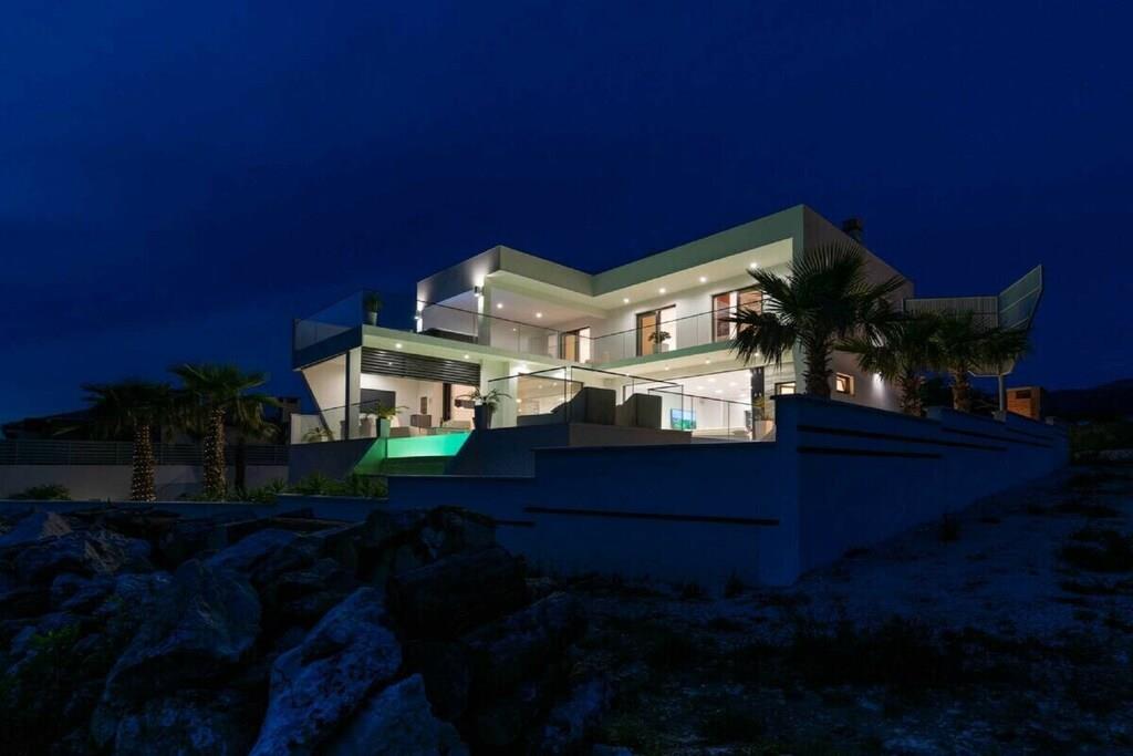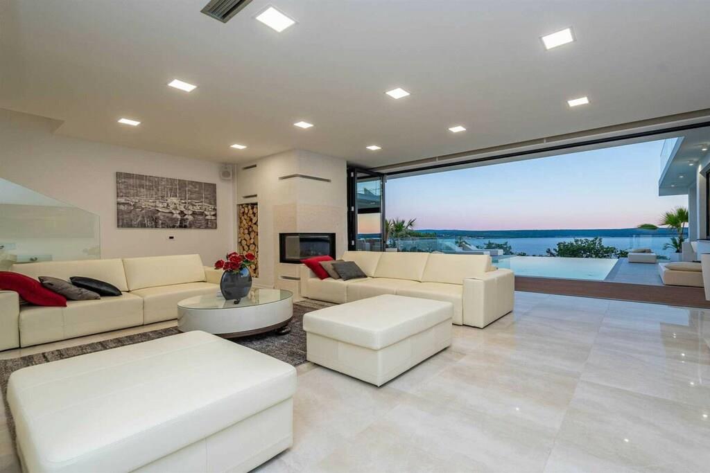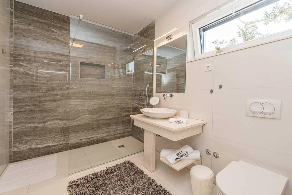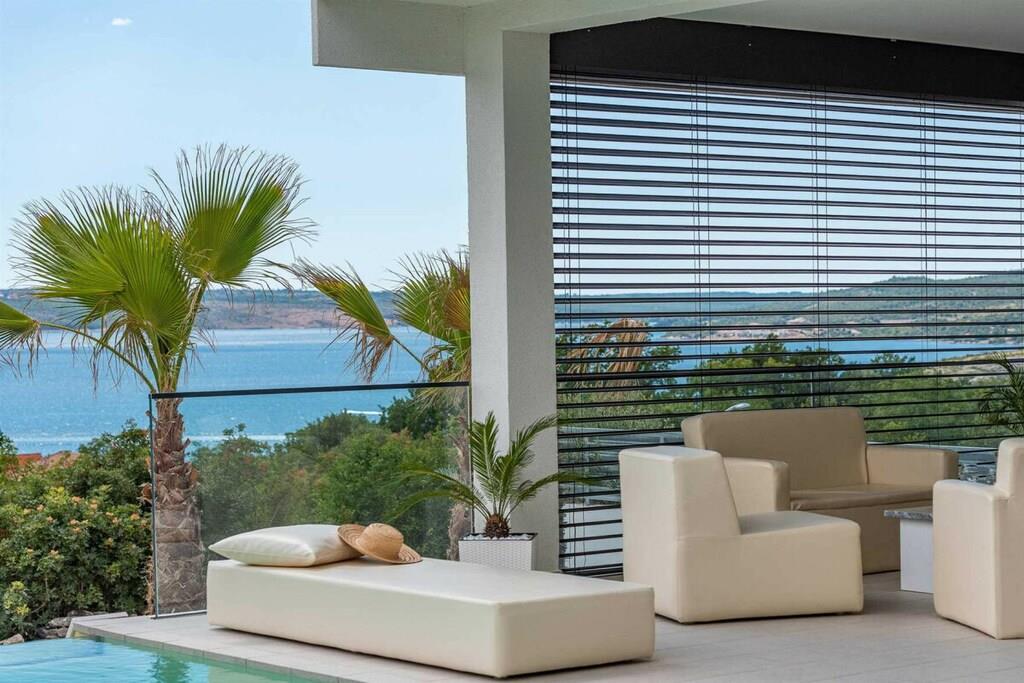 Diese brandneue, erstaunliche und luxuriöse 5-Sterne-Villa befindet sich in Maslenica, einer kleinen Stadt am Ufer des Novigrad-Meeres. Es ist von grüner Vegetation umgeben und blickt auf die wunderschöne Adria, die von jedem Zimmer der Villa aus zu sehen ist. Die Villa verfügt über 4 luxuriöse, klimatisierte Schlafzimmer mit Doppelbetten. Die Schlafzimmer haben ein eigenes Badezimmer mit Dusche. Im ersten Stock befinden sich drei Schlafzimmer, drei Badezimmer und eine große Terrasse mit einem entspannenden Whirlpool. Das Erdgeschoss verfügt über ein Wohnzimmer, Küche, Schlafzimmer, Bad, WC und einen Pool. Es gibt einen Außen- und einen Innenspeisesaal mit 8 Sitzplätzen. Neben dem Speisesaal im Freien befindet sich ein Gasgrill im Freien. Die Küche ist komplett mit hochwertigen Geräten ausgestattet. Das Äußere der Villa umfasst einen geräumigen Innenhof mit einem luxuriösen beheizten Infinity-Pool mit zwei zusätzlichen Außenduschen. Der Hof ist eingezäunt, sodass Sie Ihre Privatsphäre genießen können.