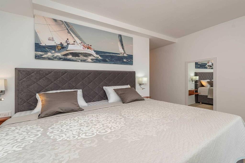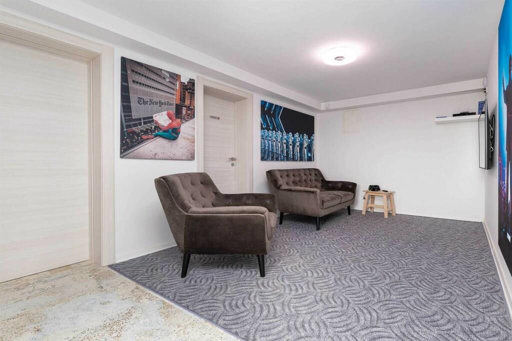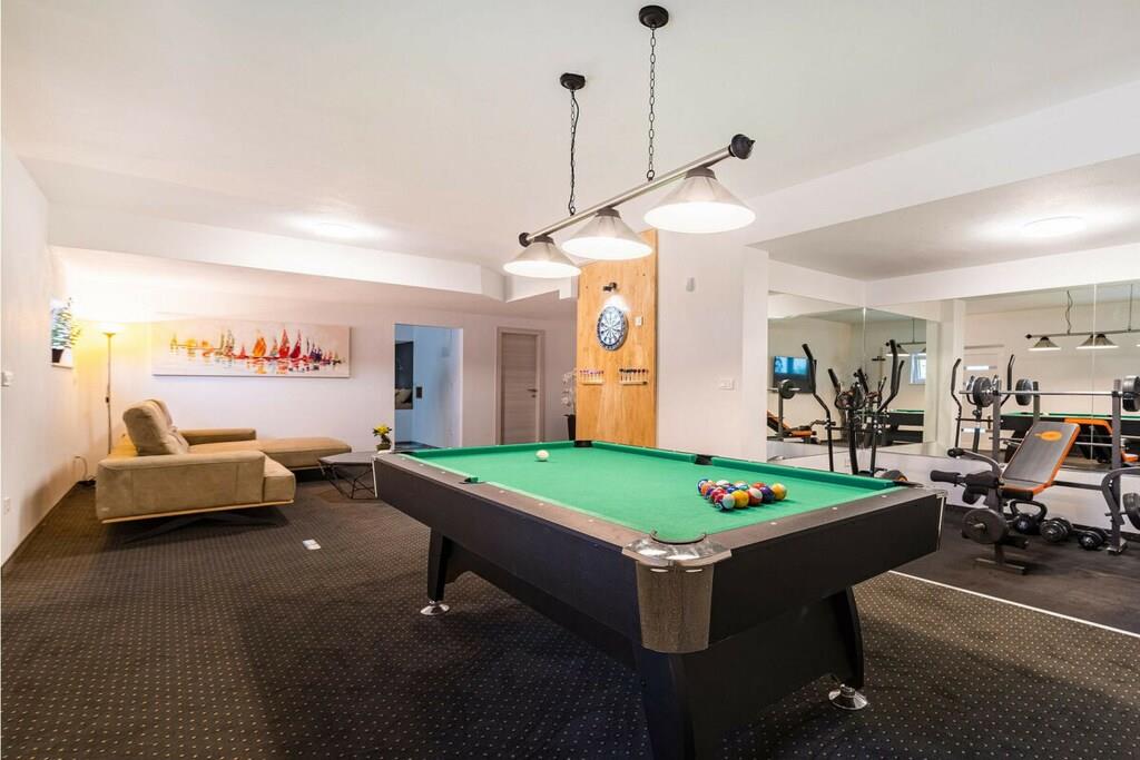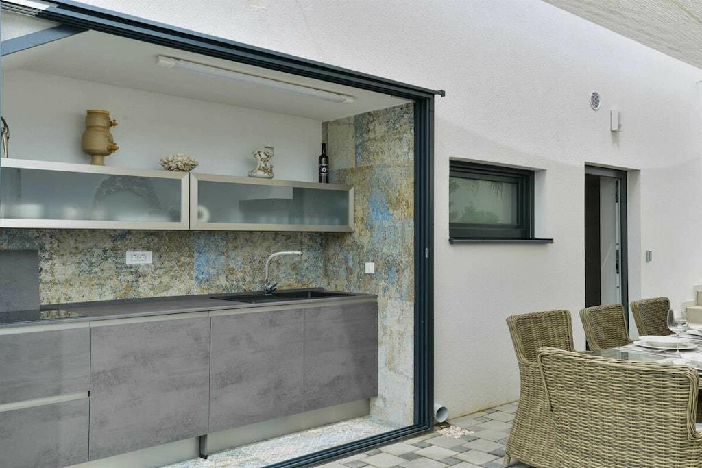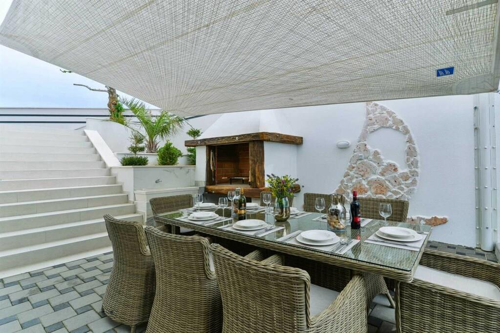 Diese brandneue, erstaunliche und luxuriöse 5-Sterne-Villa befindet sich in Maslenica, einer kleinen Stadt am Ufer des Novigrad-Meeres. Es ist von grüner Vegetation umgeben und blickt auf die wunderschöne Adria, die von jedem Zimmer der Villa aus zu sehen ist. Die Villa verfügt über 4 luxuriöse, klimatisierte Schlafzimmer mit Doppelbetten. Die Schlafzimmer haben ein eigenes Badezimmer mit Dusche. Im ersten Stock befinden sich drei Schlafzimmer, drei Badezimmer und eine große Terrasse mit einem entspannenden Whirlpool. Das Erdgeschoss verfügt über ein Wohnzimmer, Küche, Schlafzimmer, Bad, WC und einen Pool. Es gibt einen Außen- und einen Innenspeisesaal mit 8 Sitzplätzen. Neben dem Speisesaal im Freien befindet sich ein Gasgrill im Freien. Die Küche ist komplett mit hochwertigen Geräten ausgestattet. Das Äußere der Villa umfasst einen geräumigen Innenhof mit einem luxuriösen beheizten Infinity-Pool mit zwei zusätzlichen Außenduschen. Der Hof ist eingezäunt, sodass Sie Ihre Privatsphäre genießen können.