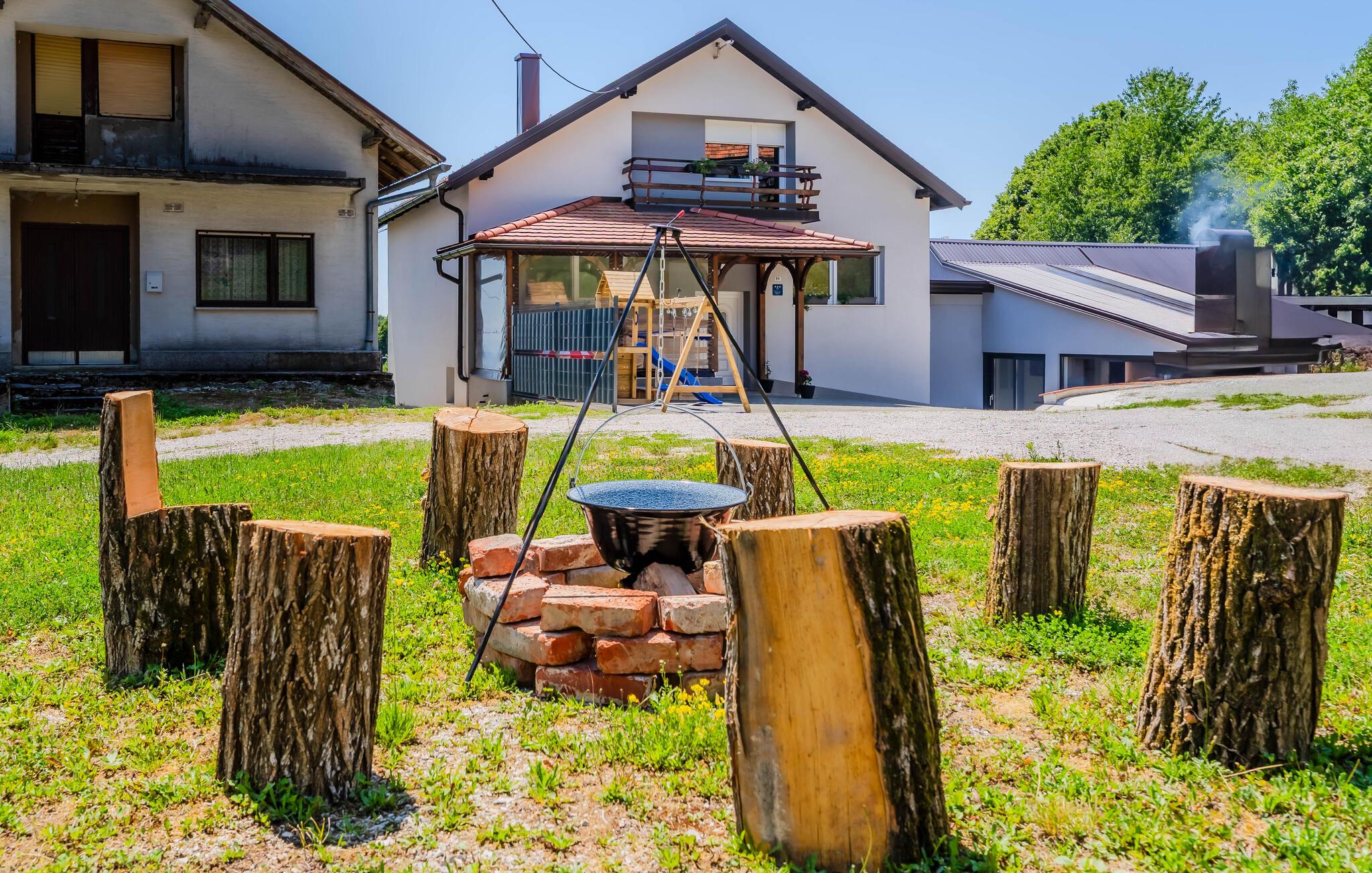 Den store, idylliske grund tiltrækker både unge og gamle med sine charmerende legemuligheder og den forfriskende friske luft. Nyd freden og roen og den smukke panoramaudsigt over det grønne landskab, mens I snakker over et glas vin i den hyggelige udendørs lounge eller slapper af i spabadet – og saml jer omkring bålstedet ved solnedgang.
