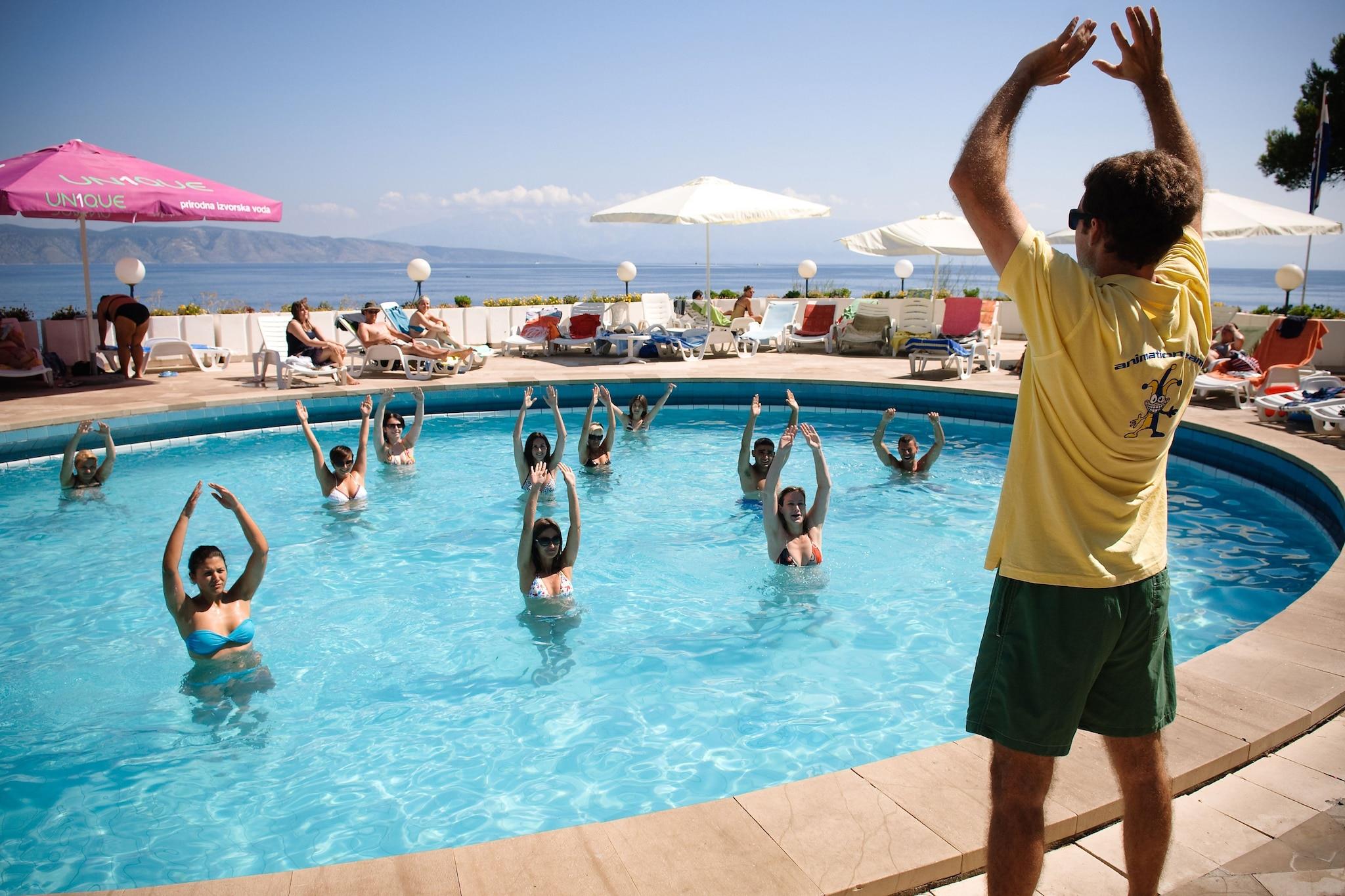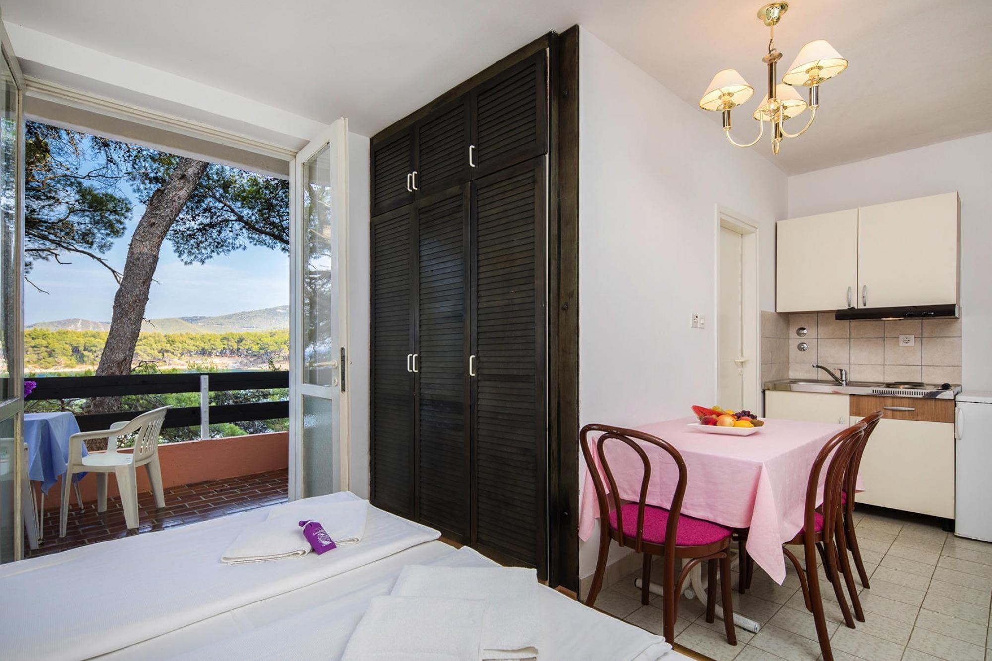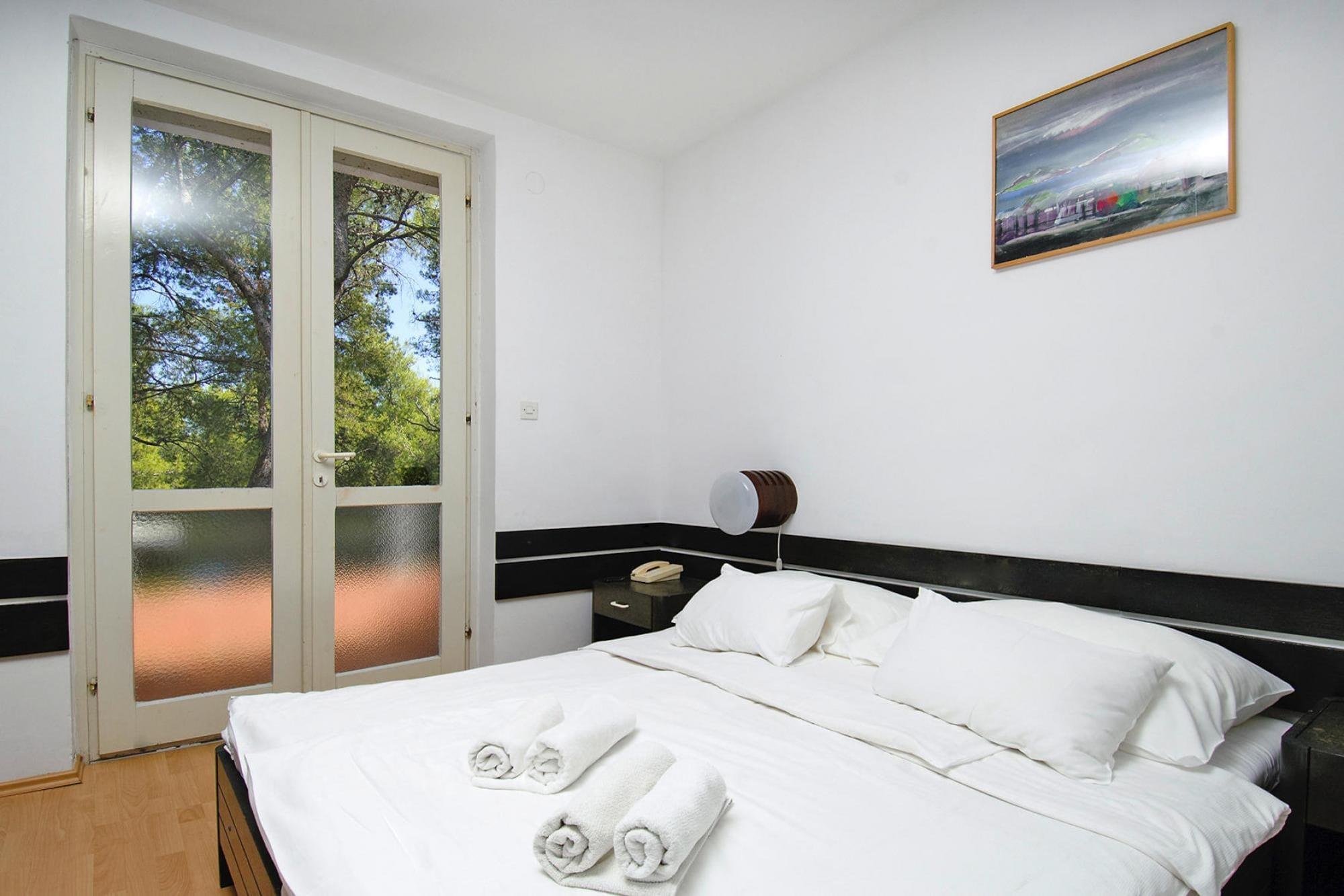 Denne velplanlagte lejlighed i stueetagen ligger ved stranden i Adriatiq Resort Fontana Deluxe i Jelsa på Hvar-øen og er ideel til familier eller små grupper, der søger komfort, bekvemmelighed og nem adgang til havet. Lejligheden har en indbydende opholdsstue med en dobbelt sovesofa, tv, siddeplads og en babyseng, hvilket gør den praktisk for gæster, der rejser med børn. Det åbne køkken har et spisebord, elektrisk kogeplade, kaffemaskine og køleskab med fryser, så du kan tilberede enkle måltider under dit ophold. Der er to separate soveværelser, møbleret med en dobbeltseng og to enkeltsenge, der tilbyder privatliv og afslappende soveforhold. Et moderne badeværelse med bruser og toilet fuldender den indendørs planløsning. Træd udenfor til en behagelig veranda med havemøbler, perfekt til at nyde morgenkaffen eller slappe af efter en dag ved havet. Gæsterne kan også drage fordel af resortets fælles faciliteter, herunder en swimmingpool med liggestole, direkte adgang til stranden, receptionsservice og parkering på stedet. Yderligere bekvemmeligheder såsom aircondition, en parasol og enten en balkon eller terrasse forbedrer ferieoplevelsen. Denne lejlighed ligger i gåafstand fra Jelsas havnefront, caféer og restauranter og tilbyder en afslappet base for at nyde Hvars kystskønhed og middelhavsatmosfære.