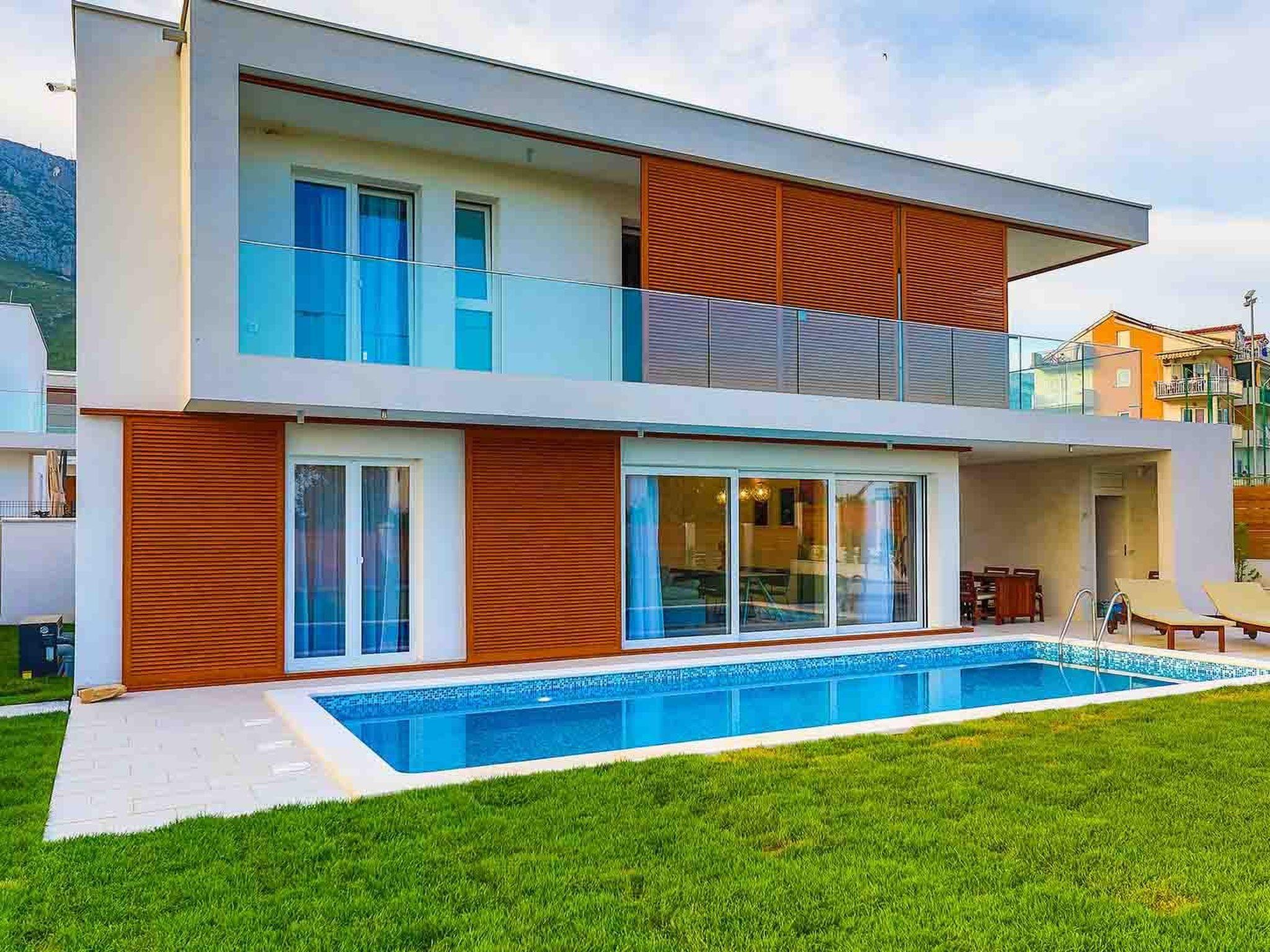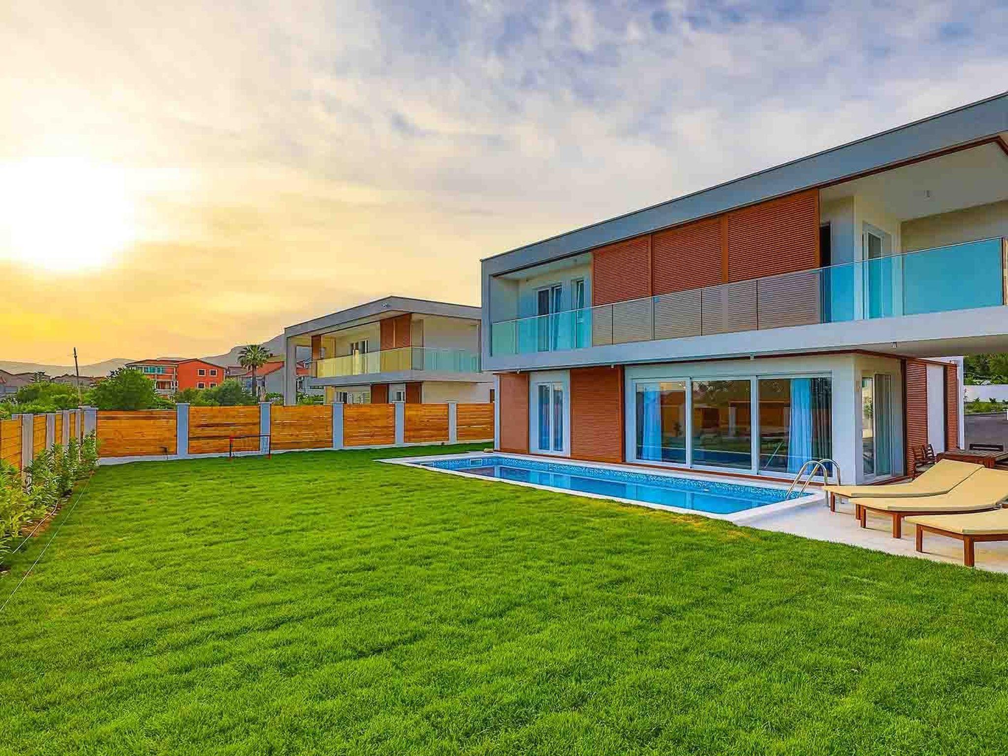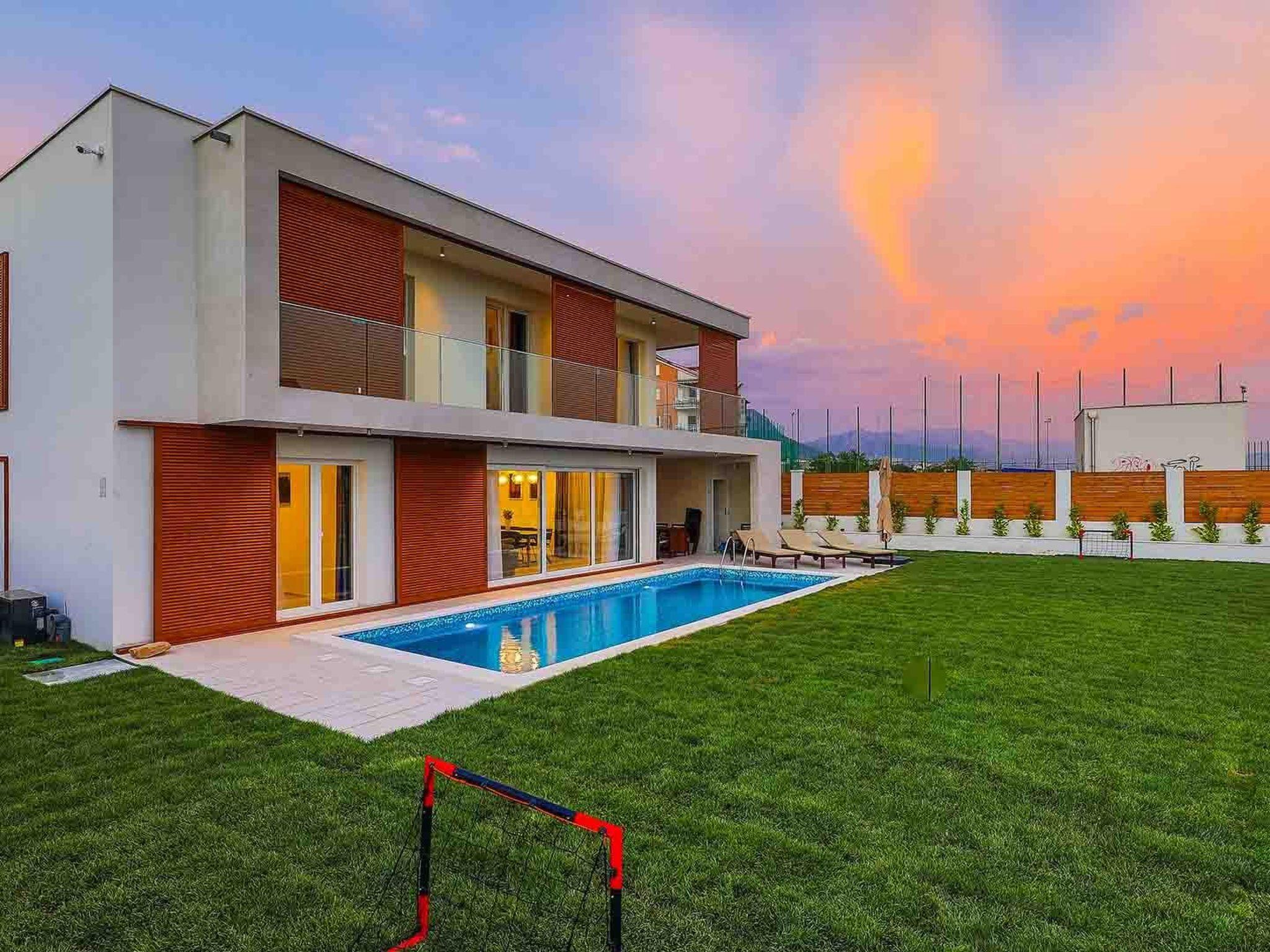 Villa Sophia covers the area of 142 m2 divided on ground and first floor and consists of 4 contemporary bedrooms which can comfortably accommodate up to 8 persons, ideal for groups of friends or larger families. The ground floor is designed as a spacious and bright lounge area which consists of a fully equipped modern kitchen, contemporary living room with dining area, 1 bedroom with double bed and 1 bathroom with shower. The living room has access to the garden and pool area through a large sliding glass door which allows the entire area to become open concept. Modern staircase leads to the first floor, designed as a resting area with 3 bedrooms with double beds and en suite bathrooms. Each bedroom in the villa is equipped with air condition and SAT-TV. All bedrooms have access to a beautiful balcony with partial seaview. One of the highlights of this magnificent villa is the outdoor area with heated outdoor pool (21 m2, 1.70 m depth), which uses electrolysis as a healthier alternative to standard pool cleaning system. Charming well-maintained garden will provide a perfect sanctuary for relaxing and soaking in the sunshine on the sun loungers around the pool. Villa Sophia is fully air conditioned and equipped with SAT-TVs, wi-fi internet, iron and ironing board, safe, oven, stove, hood, refrigerator with freezer, dishwasher, microwave, electric kettle, coffee machine, dishes and cutlery, hair dryer, washing machine and board games for children. Baby cot and high chair are available on request. The property offers 2 gated parking places, free of charge. Guests can use the outdoor grill. Up to 2 pets are allowed in the villa, free of charge. Guests are provided with a welcome pack upon their arrival.