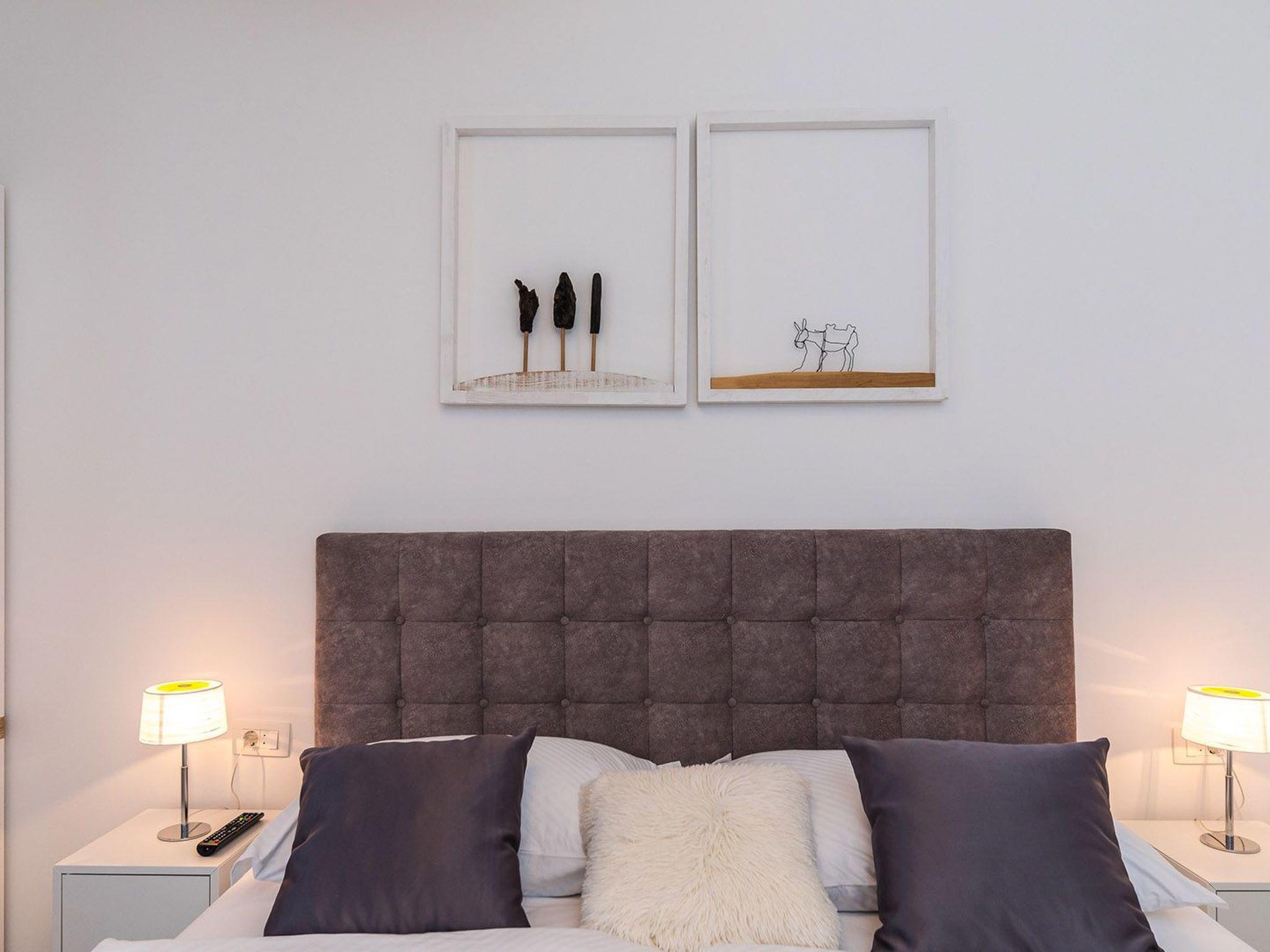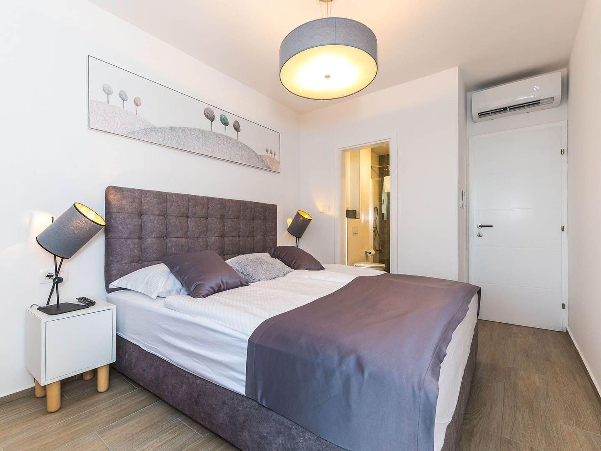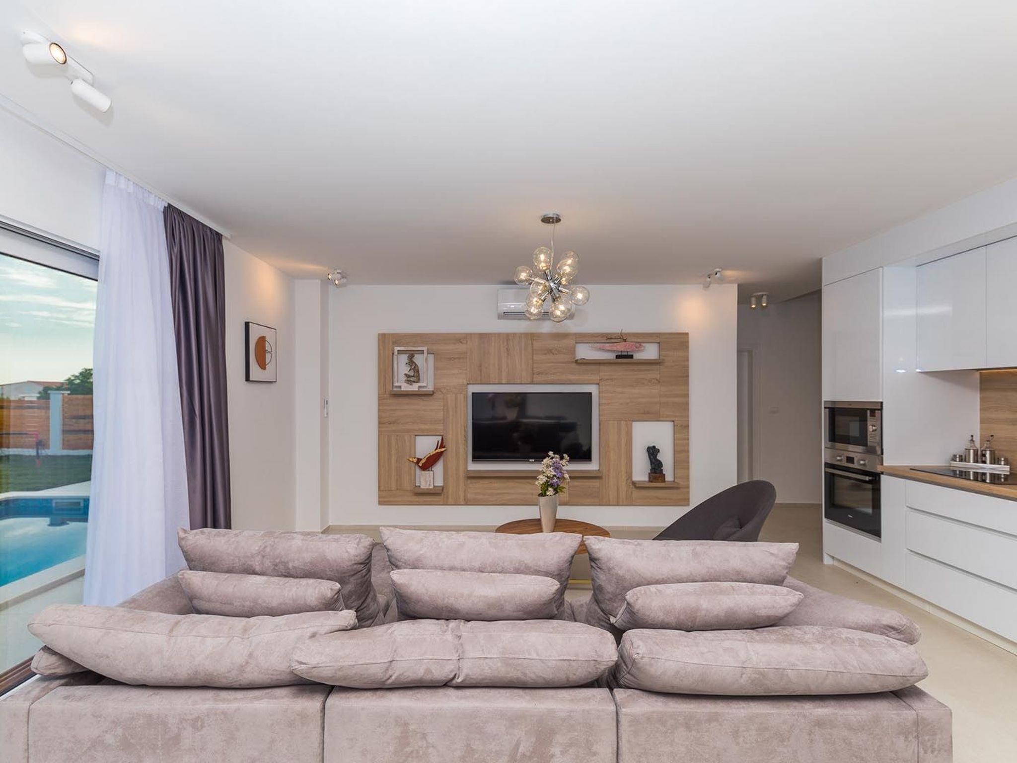 Villa Sophia covers the area of 142 m2 divided on ground and first floor and consists of 4 contemporary bedrooms which can comfortably accommodate up to 8 persons, ideal for groups of friends or larger families. The ground floor is designed as a spacious and bright lounge area which consists of a fully equipped modern kitchen, contemporary living room with dining area, 1 bedroom with double bed and 1 bathroom with shower. The living room has access to the garden and pool area through a large sliding glass door which allows the entire area to become open concept. Modern staircase leads to the first floor, designed as a resting area with 3 bedrooms with double beds and en suite bathrooms. Each bedroom in the villa is equipped with air condition and SAT-TV. All bedrooms have access to a beautiful balcony with partial seaview. One of the highlights of this magnificent villa is the outdoor area with heated outdoor pool (21 m2, 1.70 m depth), which uses electrolysis as a healthier alternative to standard pool cleaning system. Charming well-maintained garden will provide a perfect sanctuary for relaxing and soaking in the sunshine on the sun loungers around the pool. Villa Sophia is fully air conditioned and equipped with SAT-TVs, wi-fi internet, iron and ironing board, safe, oven, stove, hood, refrigerator with freezer, dishwasher, microwave, electric kettle, coffee machine, dishes and cutlery, hair dryer, washing machine and board games for children. Baby cot and high chair are available on request. The property offers 2 gated parking places, free of charge. Guests can use the outdoor grill. Up to 2 pets are allowed in the villa, free of charge. Guests are provided with a welcome pack upon their arrival.