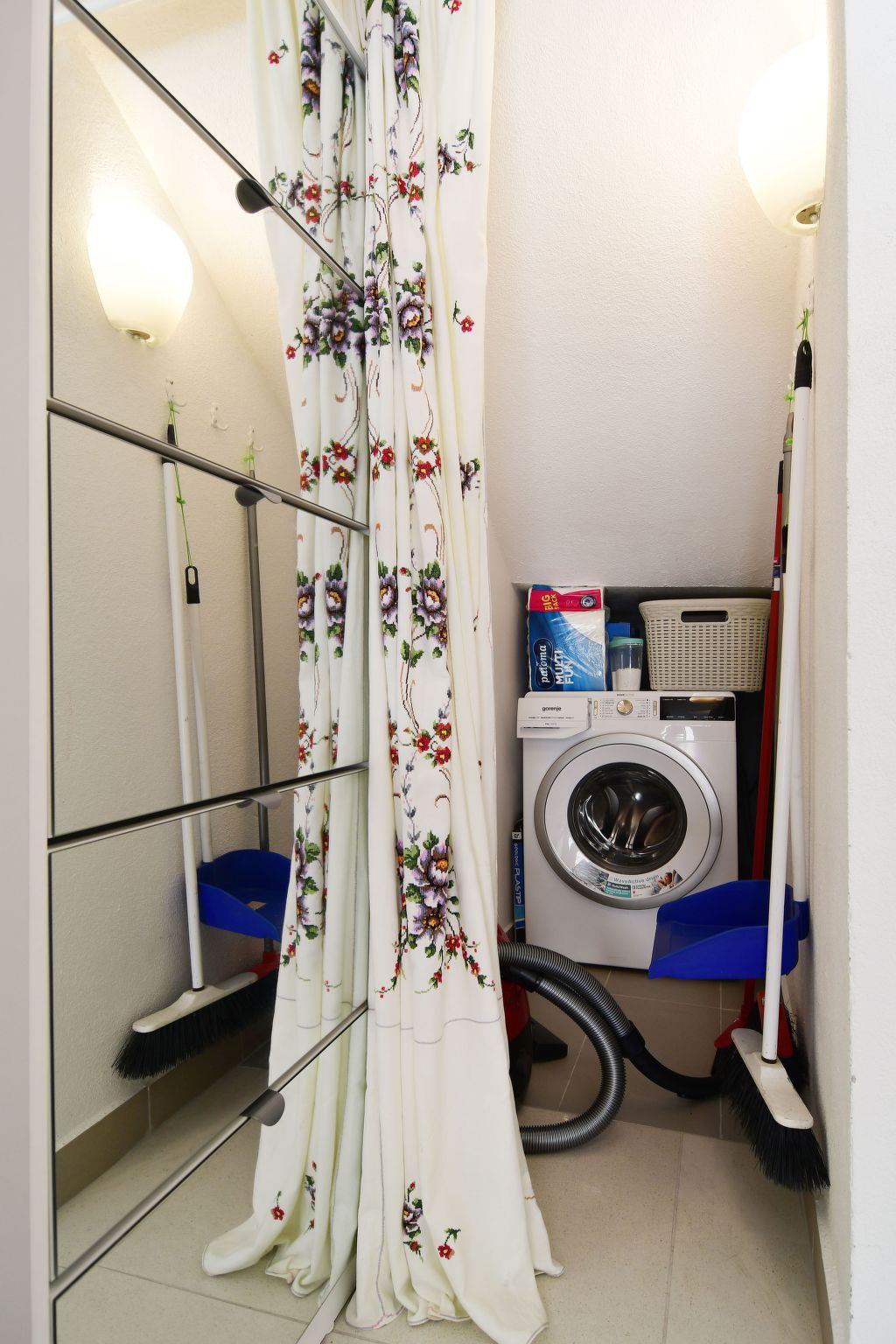 The washing machine is located at the entrance in common with the ground floor studio apartment.