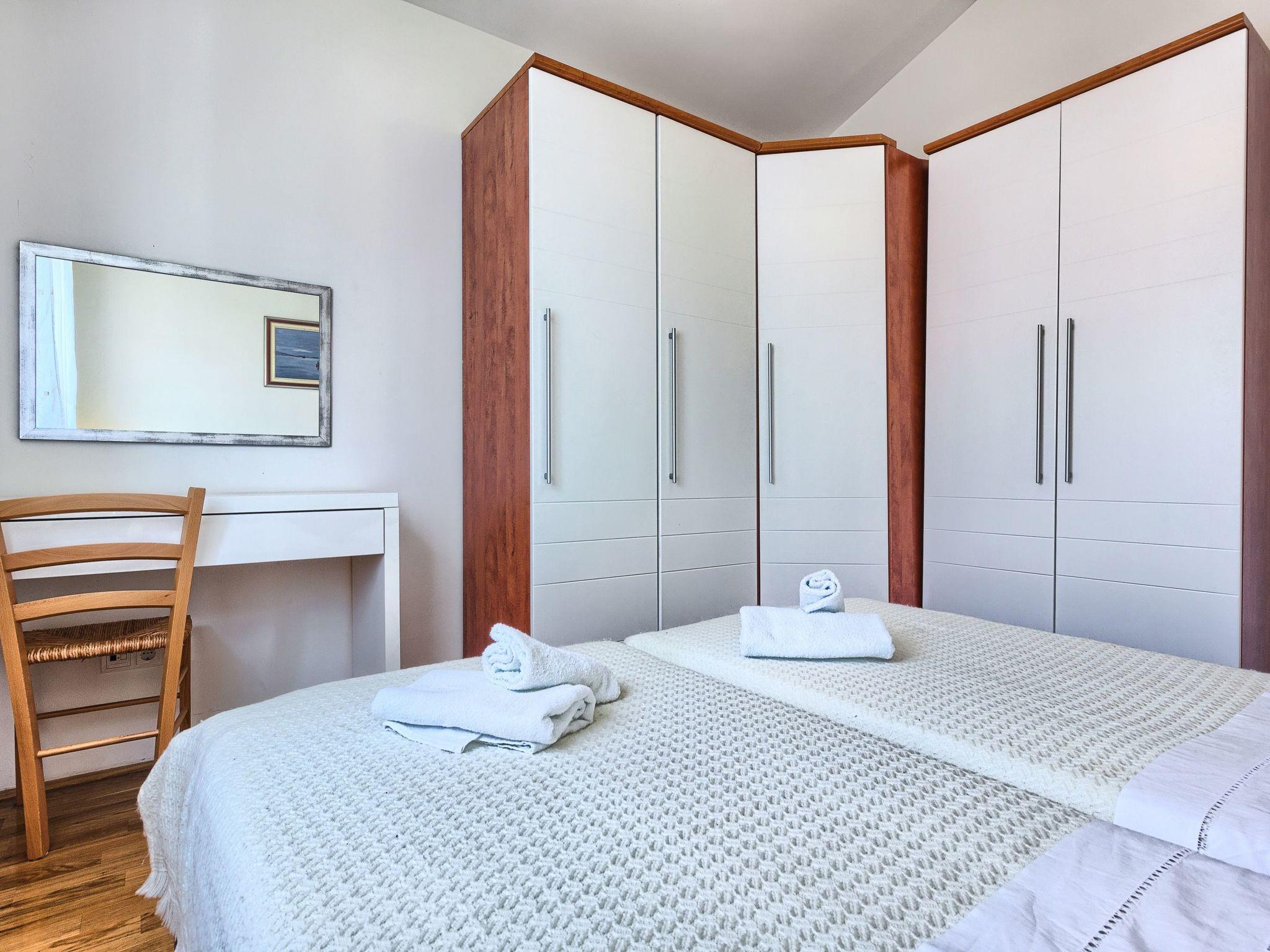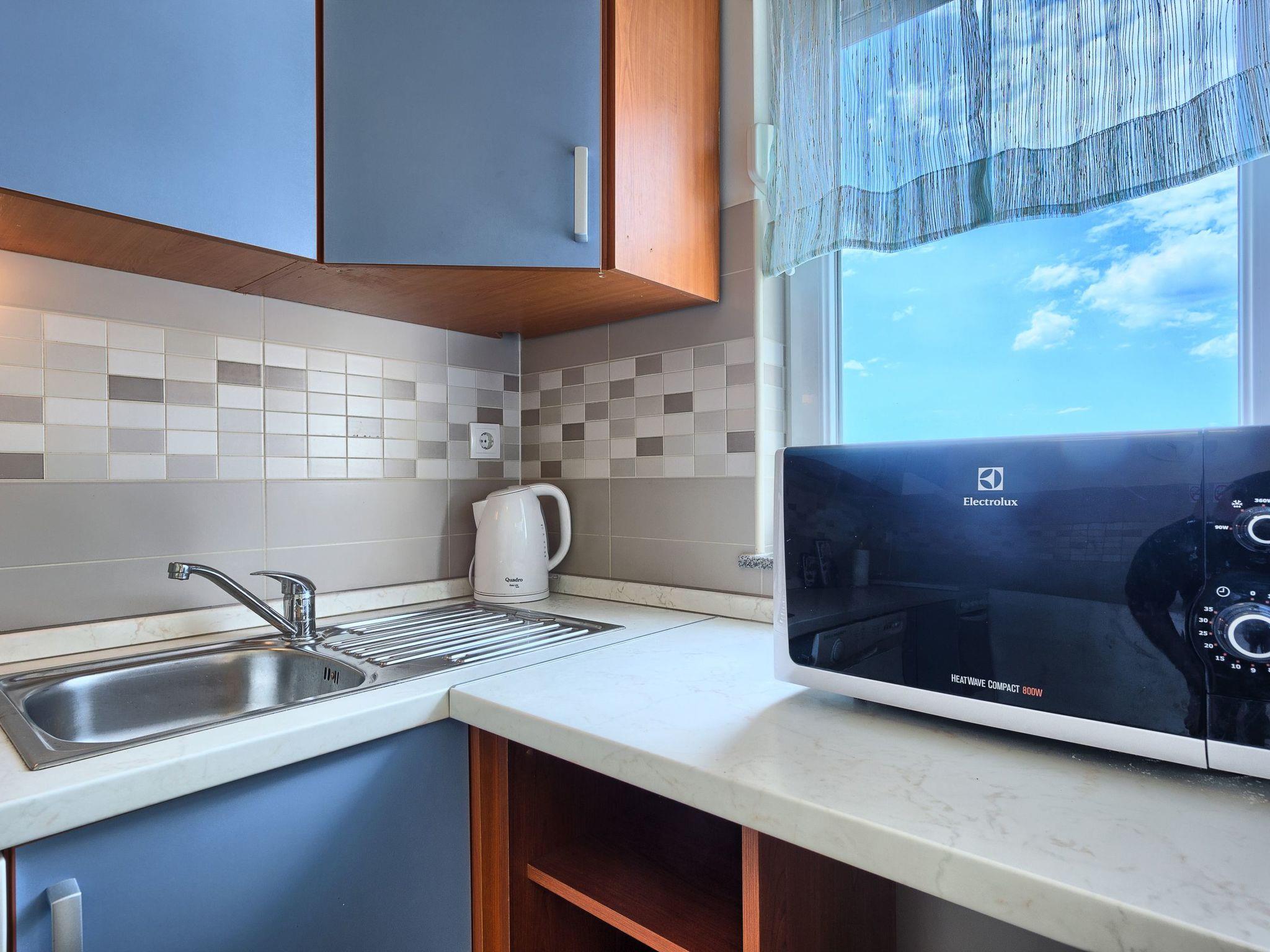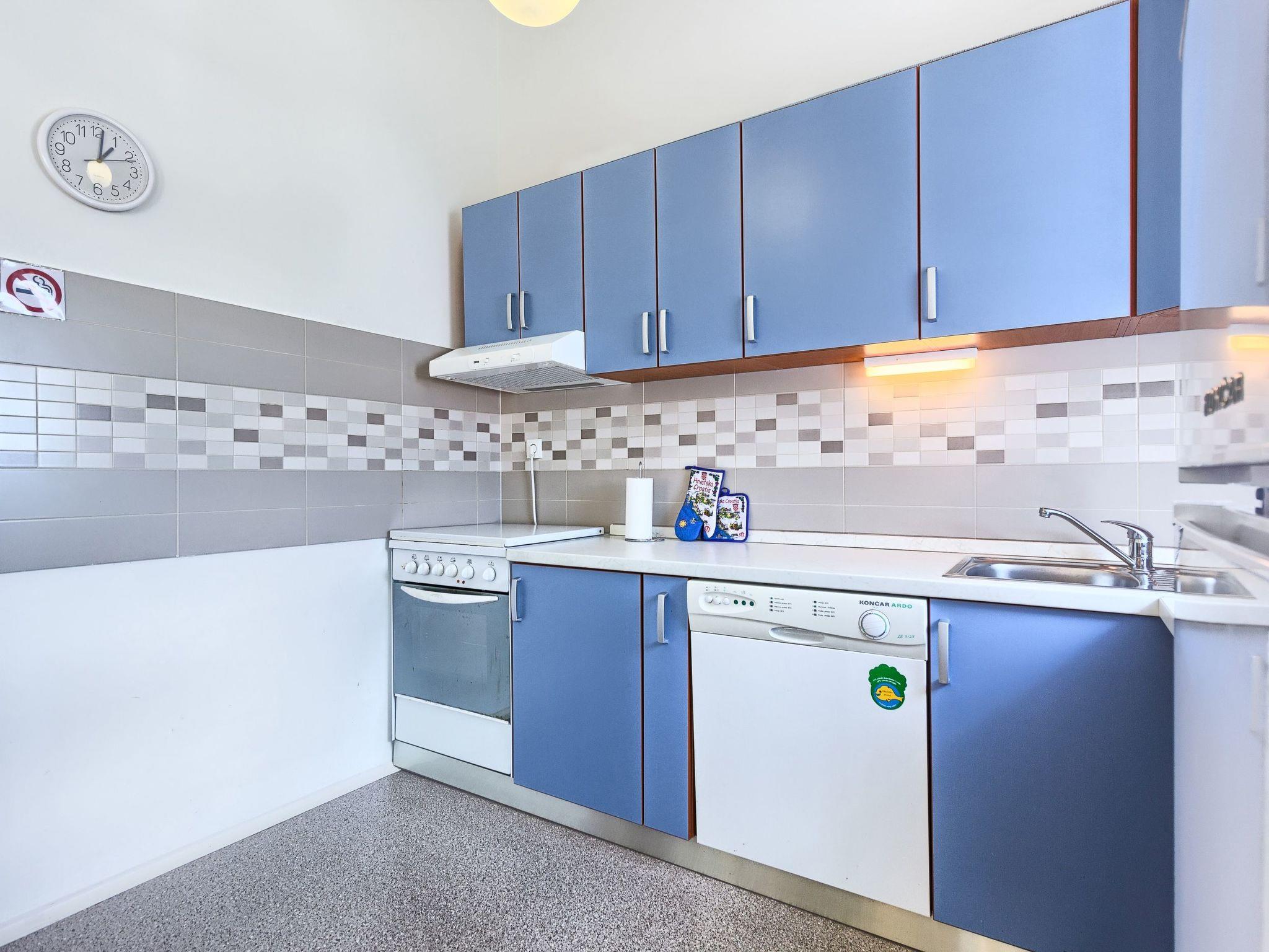 Inside, the 60m² apartment is designed to comfortably accommodate up to five guests. It boasts a fully-equipped kitchen with modern appliances such as a hob, oven, fridge, microwave, kettle, and dishwasher, alongside a dining table for six. For relaxation, the living room is outfitted with air conditioning, a TV, and a large sofa bed that converts to accommodate two people. Sleeping arrangements are provided across two cozy bedrooms, with the main bedroom featuring two single beds and the second bedroom housing one single bed. Furthermore, a well-appointed bathroom includes a shower, washing machine, and toilet for your convenience.