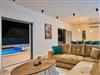 The ground floor features a spacious and comfortable living room with a smart TV and a pool area exit. Open space leads to the dining room and the kitchen with a storage room. There is also a bedroom with an ensuite bathroom and a guest toilet.