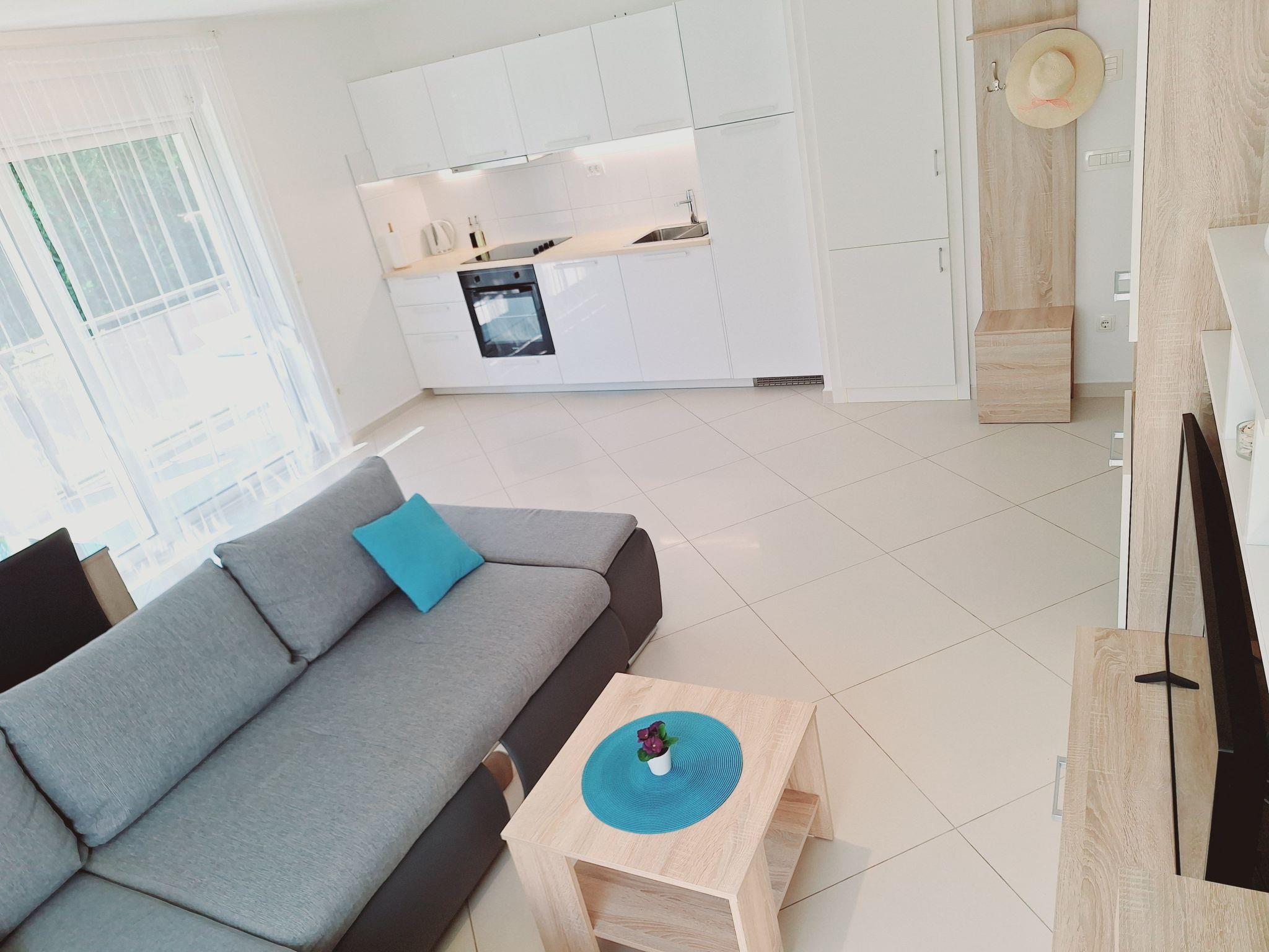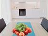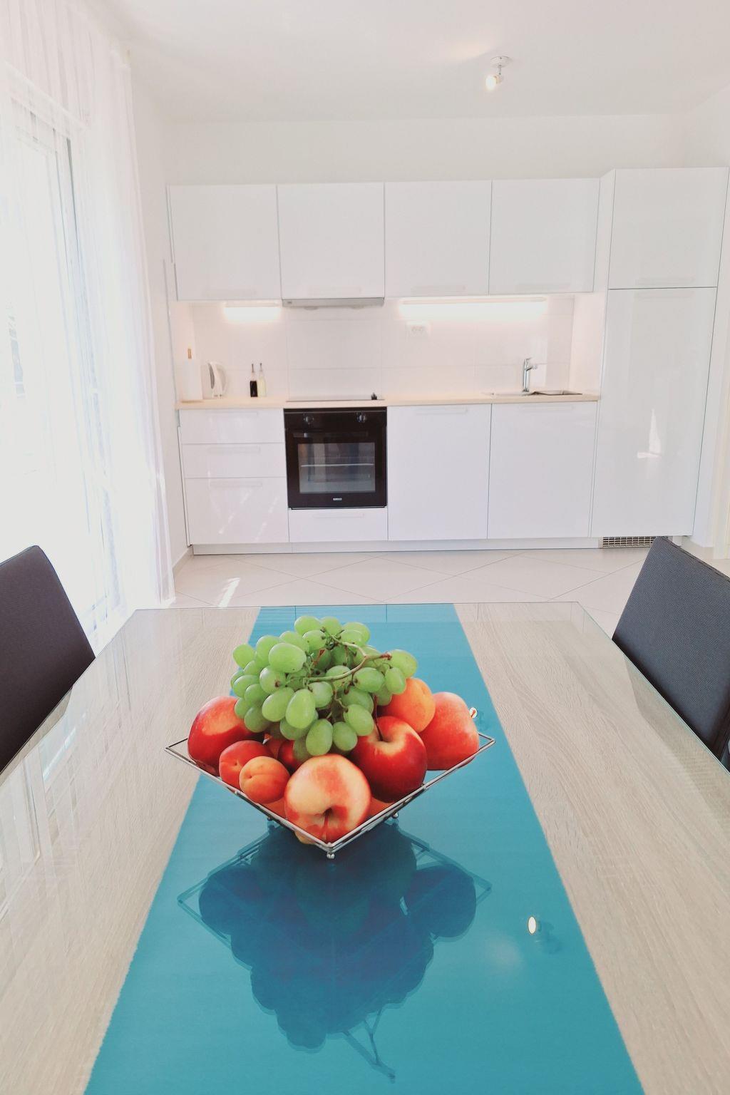 The 48m² apartment can accommodate four people. The centerpiece of the apartment is the spacious living room. It has a comfortable sitting area with a TV and a sofa, which can be converted into a sofa bed (140 x 190cm) for two adults or two children. Right behind the sofa there is a dining space with four chairs. Opposite there is the open kitchen, equipped with a stove, oven, fridge, dishwasher, toaster and kettle. The tiled daylight bathroom provides a shower, WC, washbasin with cupboard underneath, washing machine and an illuminated mirror. The comfortable bedroom has a double bed (160 x 200cm) with two bedside tables and reading lamps, as well as a big wardrobe.