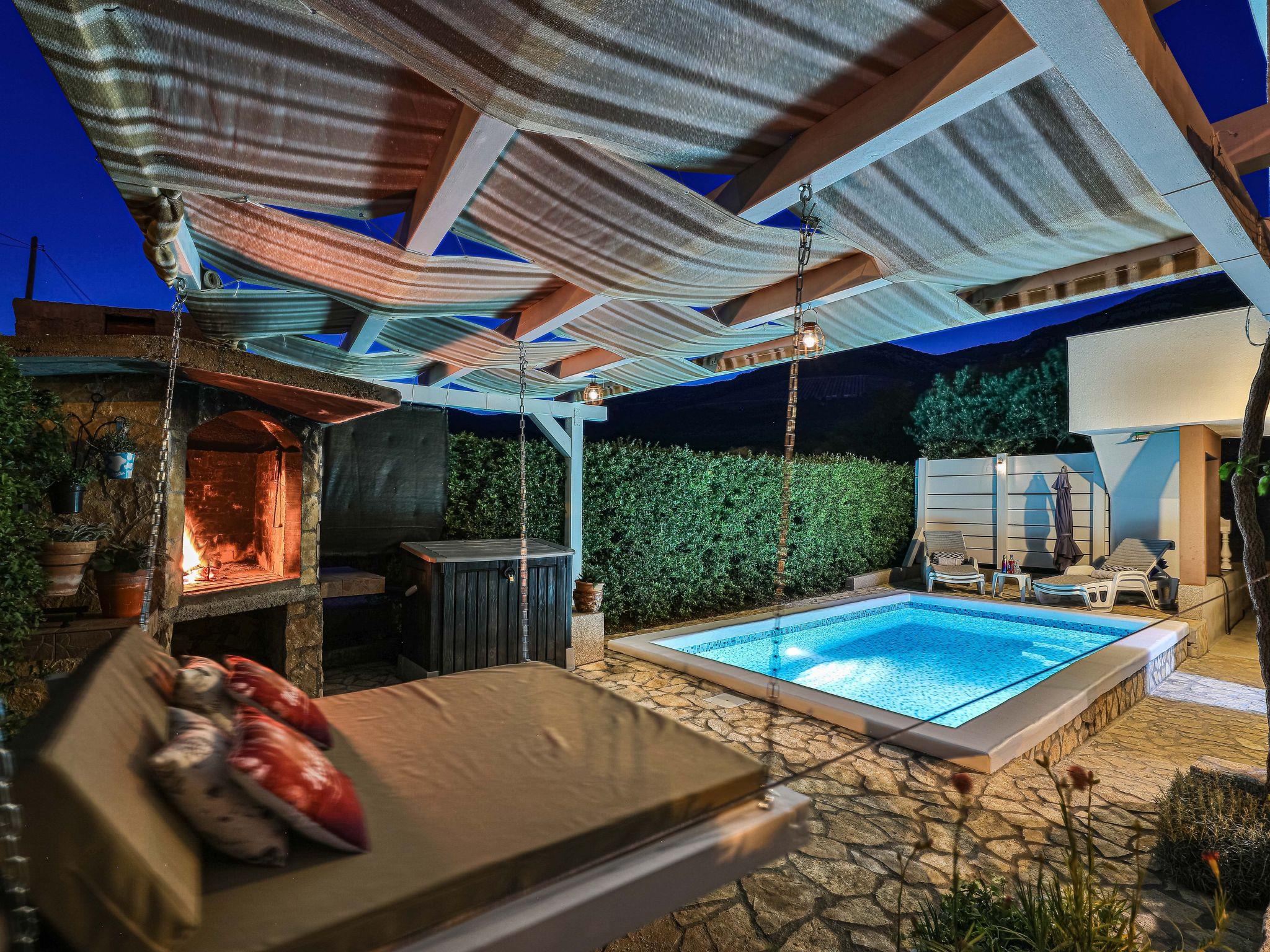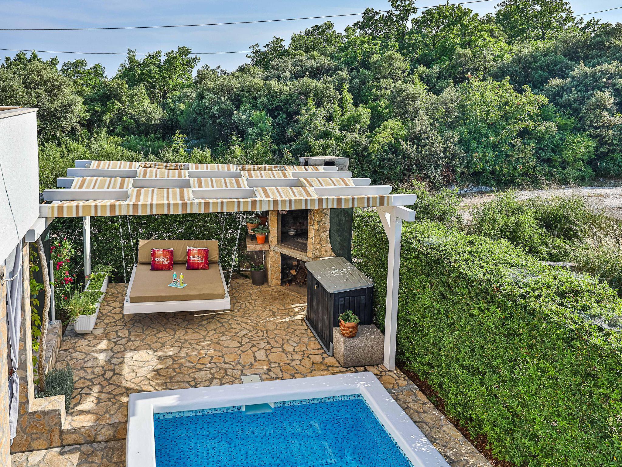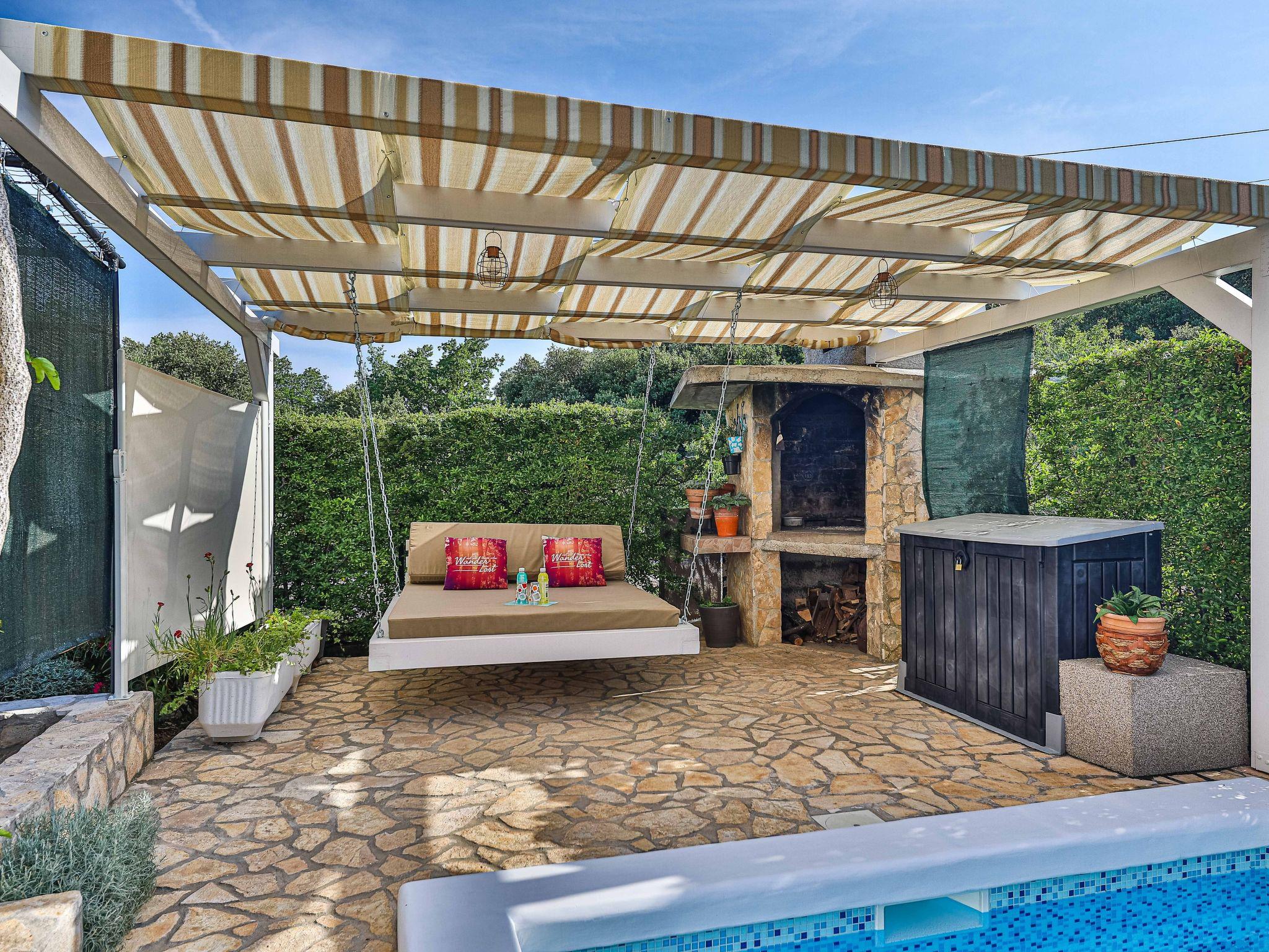Wooden barbeque area, outdoor seating area, hanging bed by the pool