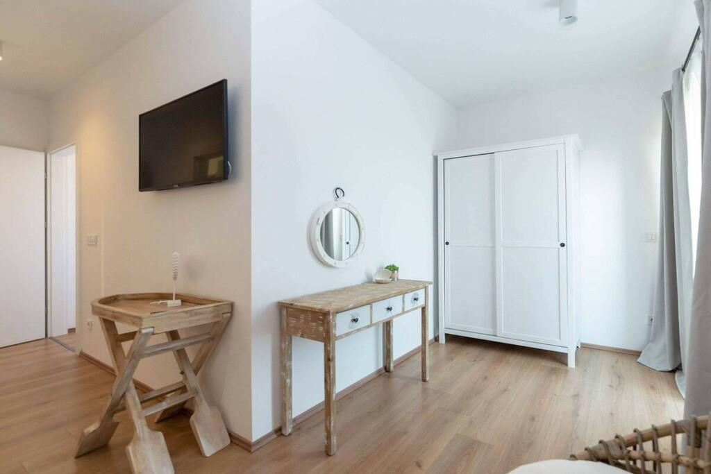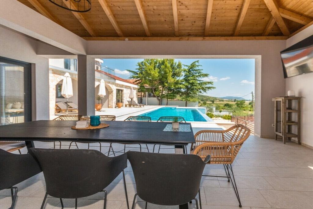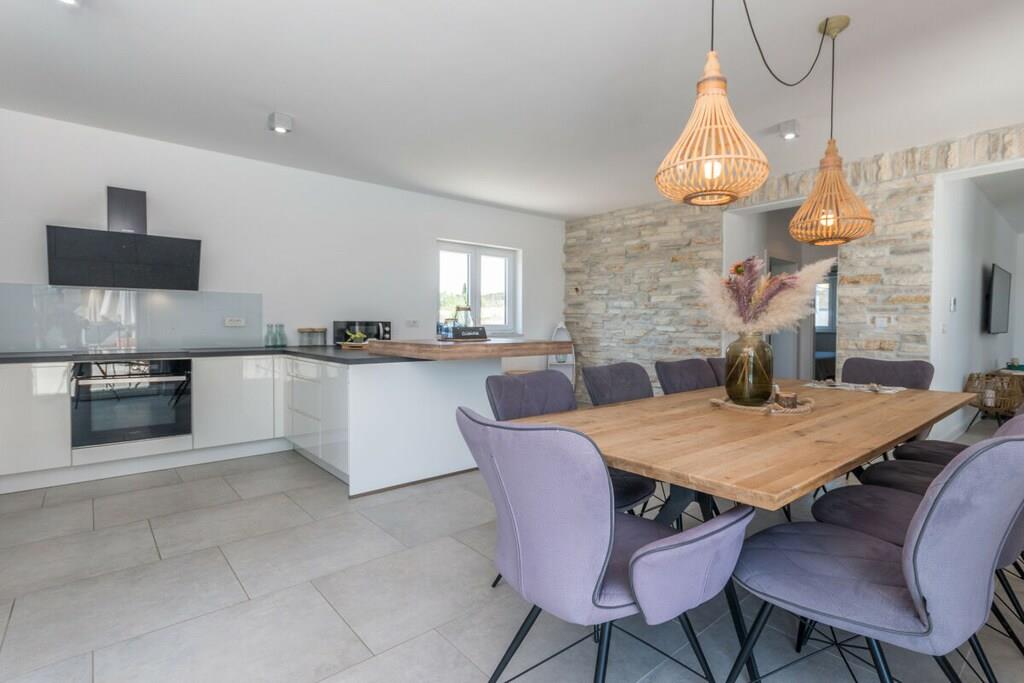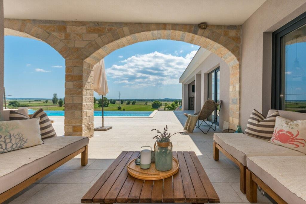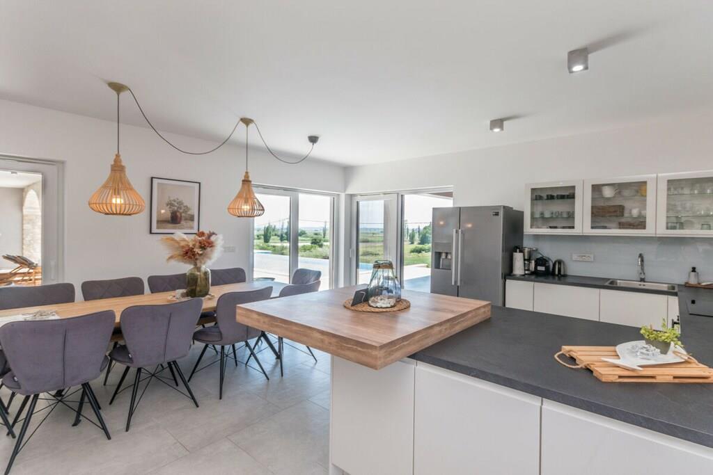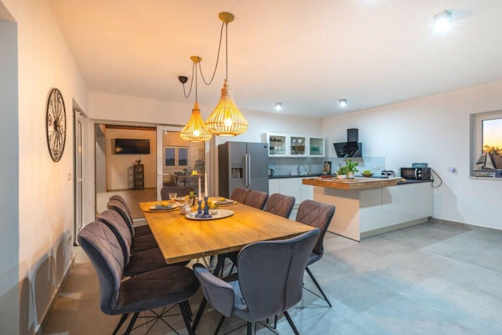 Diese luxuriös eingerichtete Villa bietet den perfekten Ort zum Entspannen. Die Villa bietet Platz für bis zu 10 Gäste. Bietet alles für einen perfekten Urlaub. Kostenloses WLAN, Sat-TV, kostenlose Nutzung von Fahrrädern, Kinderhochstuhl und Kinderbett. Es besteht aus 4 Schlafzimmern mit Doppelbetten, 5 Badezimmern, einem geräumigen Wohnzimmer, einer voll ausgestatteten Küche, einer Sauna, einem Whirlpool, einem privaten Fitnessbereich, einem Kinderspielzimmer, einem Außenpool, Gartenmöbeln, einer Loggia mit Holzkamin und kostenlosen Parkplätzen. Genießen Sie die Aussicht auf den Vrana-See und entspannen Sie im grünen Garten am Haus. Auf der überdachten Terrasse können Sie angenehme Momente beim Grillen bei einem Glas Qualitätswein verbringen. Es gibt auch ein ornithologisches Reservat am Vrana-See, einen Radweg und einen Aussichtspunkt auf Kamenjak mit herrlichem Blick auf die Kornati-Inseln. In der Nähe befinden sich auch die Königsstadt Biograd und ein spektakulärer Vergnügungspark.