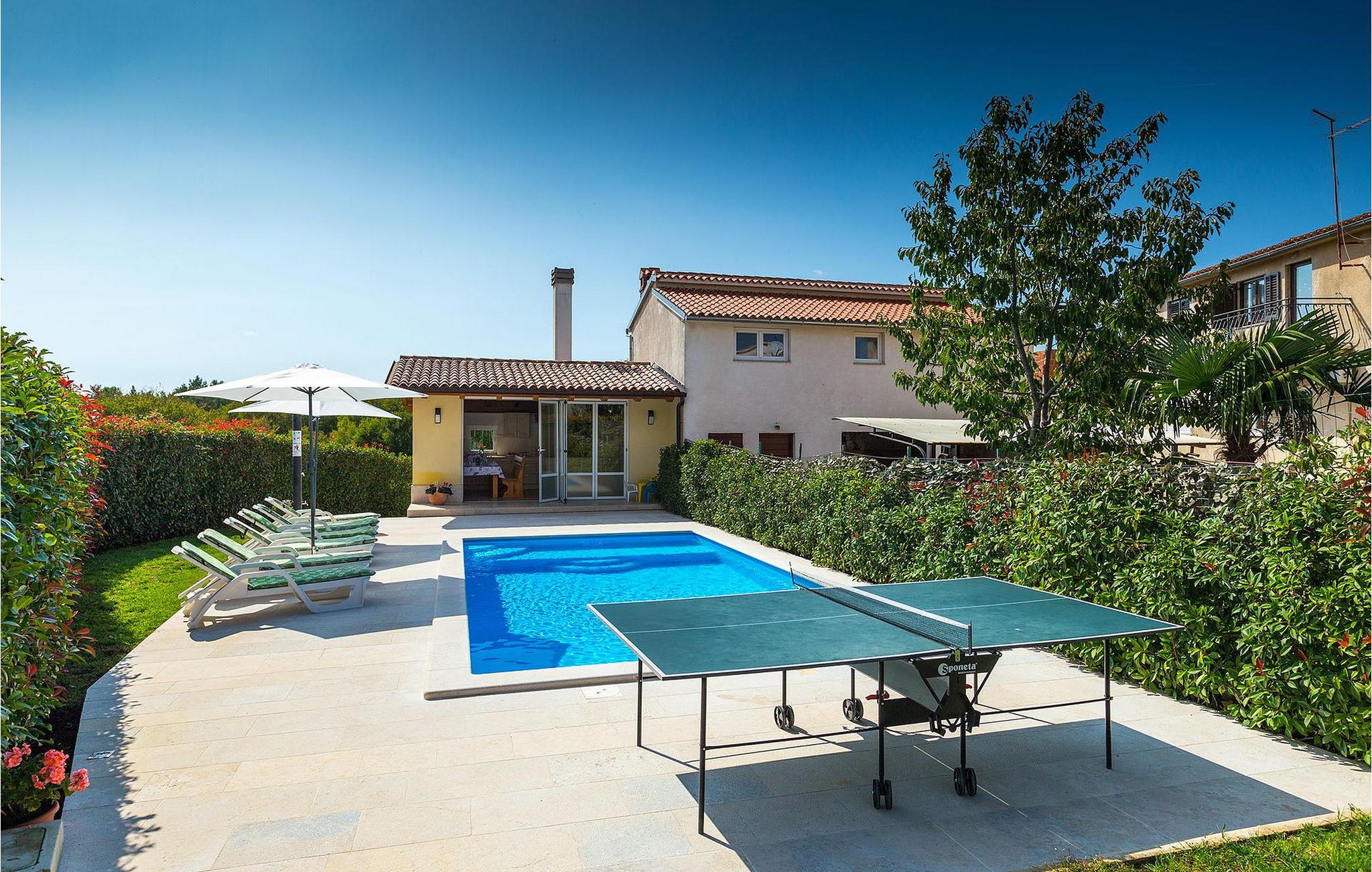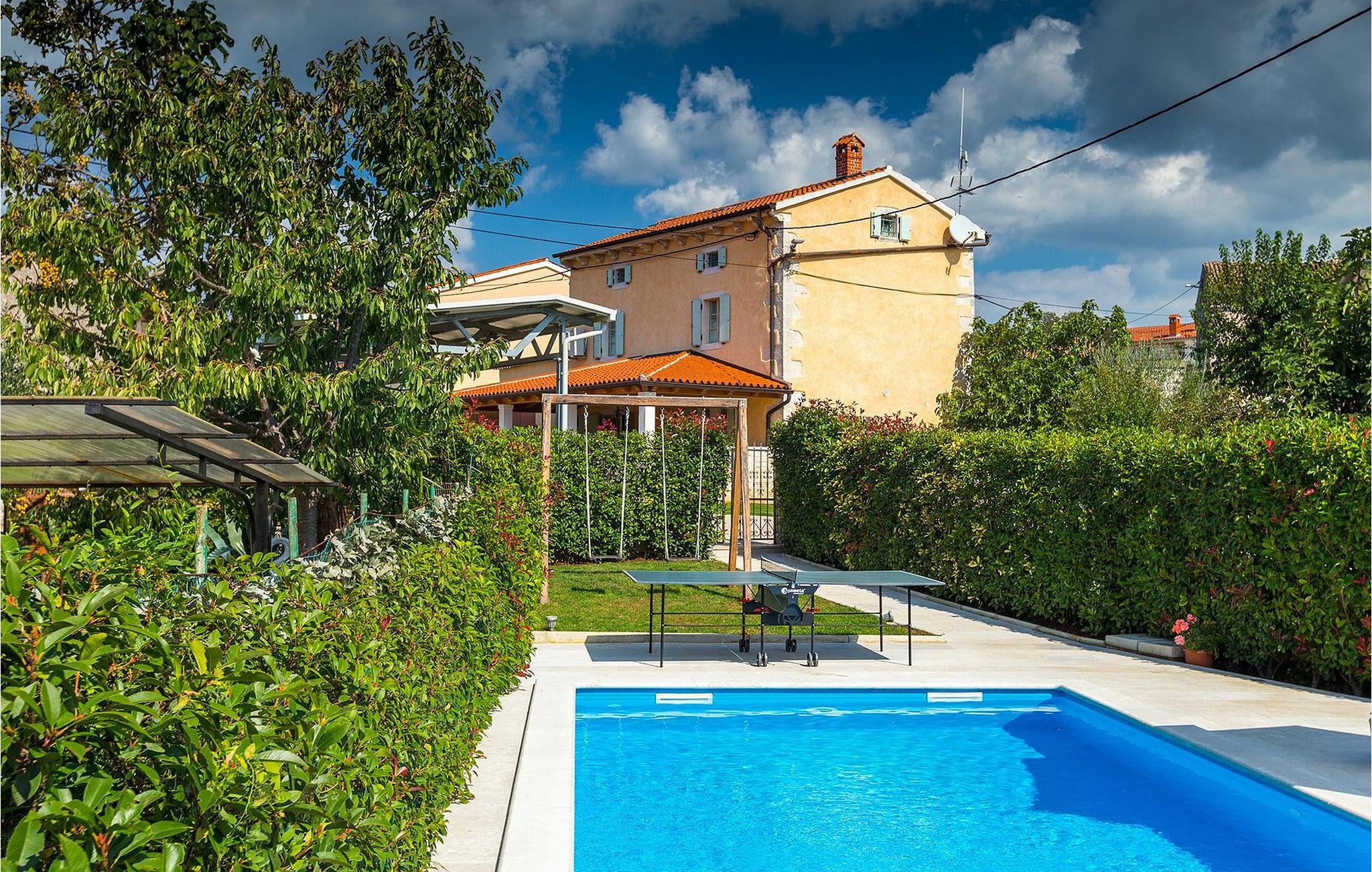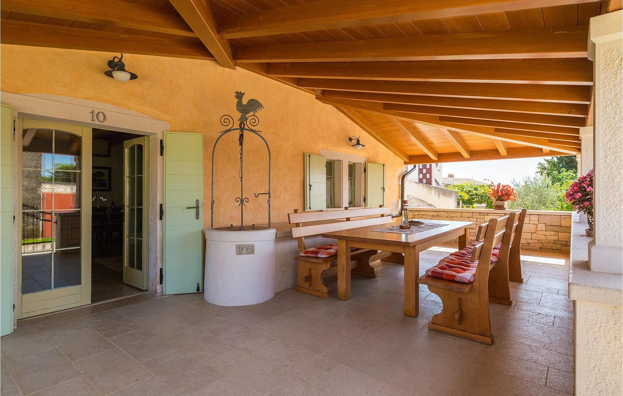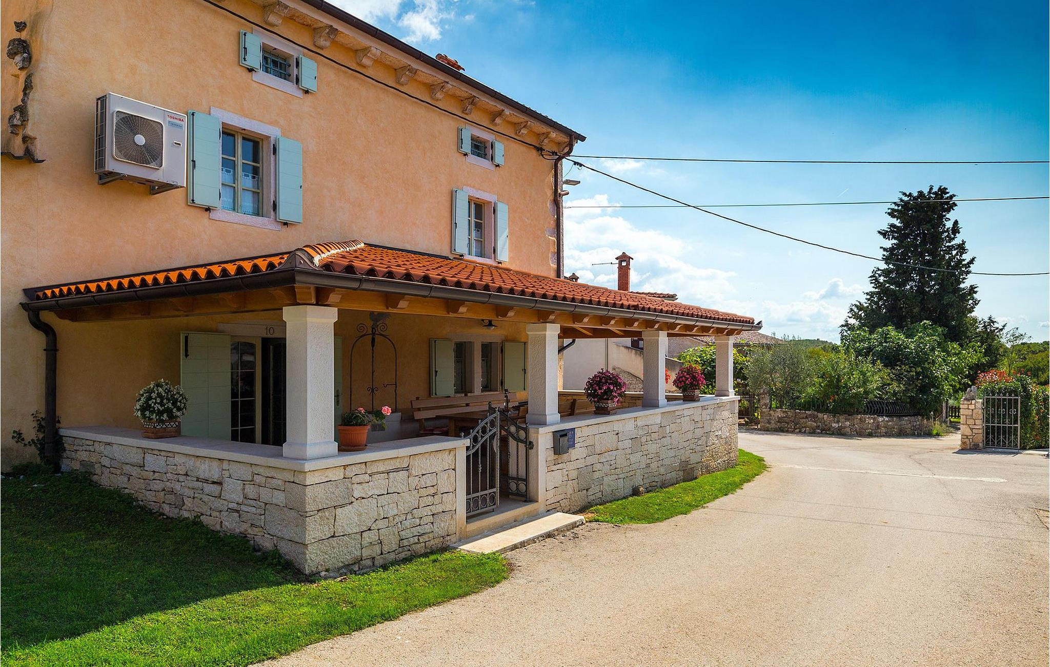 Denne charmerende ejendom kan rumme op til 8 personer i 4 dejligt indrettede soveværelser (2 med dobbeltsenge og 2 med 2 enkeltsenge) og en ekstra sovesofa på øverste etage. Alle værelser har aircondition og nyudstyrede med LCD-tv. Stuen er rummelig og hyggelig og byder på komfort og afslapning. Opholdsstuen består af en komfortabel stue med sofa, spiseplads og et veludstyret køkken. Foran villaen er der en skøn overdækket terrasse, hvor du finder et stort spisebord til spisning under åben himmel. På den anden side af gaden, flere skridt væk, er en adskilt muret og indhegnet gårdhave med en swimmingpool, hvor du kan forfriske dig på varme sommerdage. Her finder du et fuldt udstyret sommerkøkken med stort spisebord samt grill. På ejendommen er der en børnegynge og bordtennis til din og dit barns underholdning. Denne ejendom er beliggende i den centrale del af halvøen Istrien, nær den lille by Kanfanar, mere præcist landsbyen Bubani. Den gamle arkitektur i Kanfanar og de omkringliggende landsbyer er velbevaret, og oliven dominerer dette område med et varmt middelhavsklima. Kanfanar og dets omkringliggende landskab er velkendt, ikke kun for sin historiske og kulturelle arv, men for fremragende ægte istriske køkken. Istrien er et unikt og fortryllet sted, der har budt velkommen til besøgende og bosættere fra alle dele af verden, så længe vi har nedtegnet historie. Byen Pula med dets romerske amfiteater og Brijuni nationalpark med en 18-hullers golfbane ligger kun 20 minutters kørsel derfra. Gode restauranter og taverner kan findes på kun en kort køretur i alle retninger. Det er et fantastisk sted at nyde maden, historien og trods alt at slappe af. Bil anbefales.