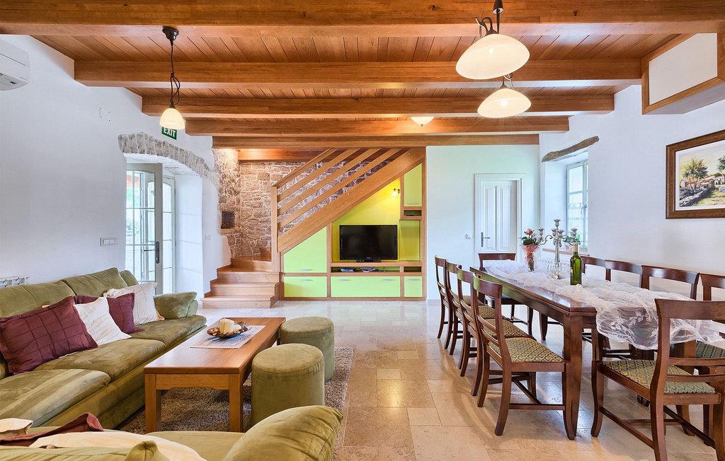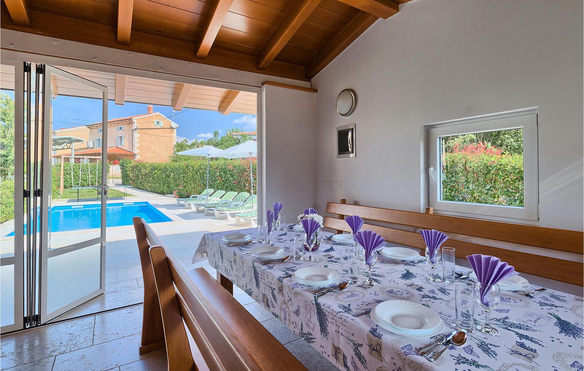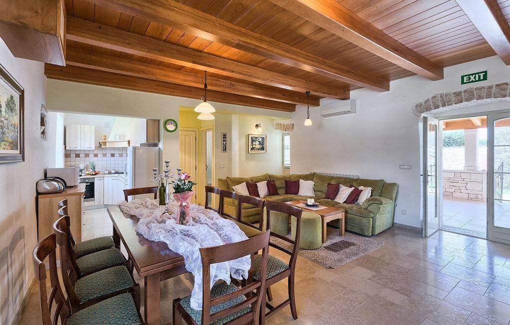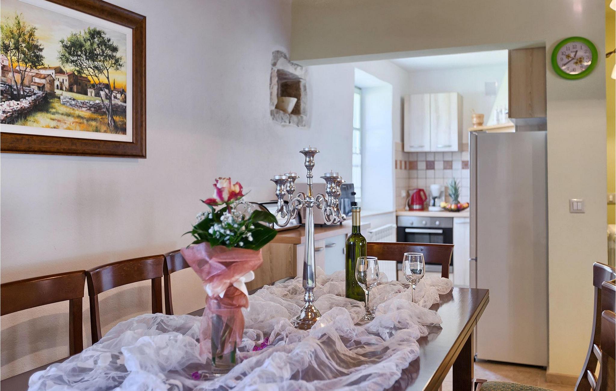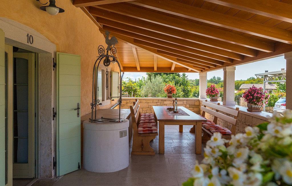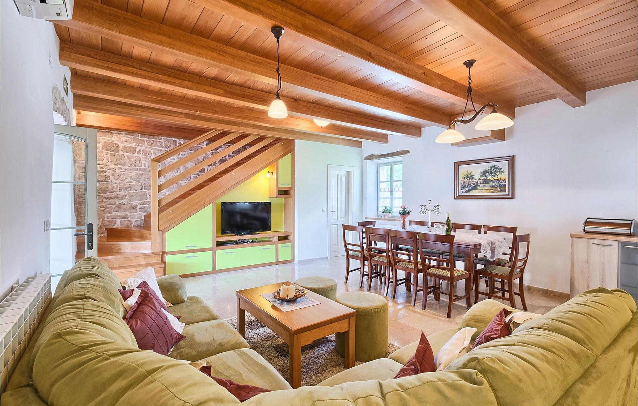 Denne charmerende ejendom kan rumme op til 8 personer i 4 dejligt indrettede soveværelser (2 med dobbeltsenge og 2 med 2 enkeltsenge) og en ekstra sovesofa på øverste etage. Alle værelser har aircondition og nyudstyrede med LCD-tv. Stuen er rummelig og hyggelig og byder på komfort og afslapning. Opholdsstuen består af en komfortabel stue med sofa, spiseplads og et veludstyret køkken. Foran villaen er der en skøn overdækket terrasse, hvor du finder et stort spisebord til spisning under åben himmel. På den anden side af gaden, flere skridt væk, er en adskilt muret og indhegnet gårdhave med en swimmingpool, hvor du kan forfriske dig på varme sommerdage. Her finder du et fuldt udstyret sommerkøkken med stort spisebord samt grill. På ejendommen er der en børnegynge og bordtennis til din og dit barns underholdning. Denne ejendom er beliggende i den centrale del af halvøen Istrien, nær den lille by Kanfanar, mere præcist landsbyen Bubani. Den gamle arkitektur i Kanfanar og de omkringliggende landsbyer er velbevaret, og oliven dominerer dette område med et varmt middelhavsklima. Kanfanar og dets omkringliggende landskab er velkendt, ikke kun for sin historiske og kulturelle arv, men for fremragende ægte istriske køkken. Istrien er et unikt og fortryllet sted, der har budt velkommen til besøgende og bosættere fra alle dele af verden, så længe vi har nedtegnet historie. Byen Pula med dets romerske amfiteater og Brijuni nationalpark med en 18-hullers golfbane ligger kun 20 minutters kørsel derfra. Gode restauranter og taverner kan findes på kun en kort køretur i alle retninger. Det er et fantastisk sted at nyde maden, historien og trods alt at slappe af. Bil anbefales.