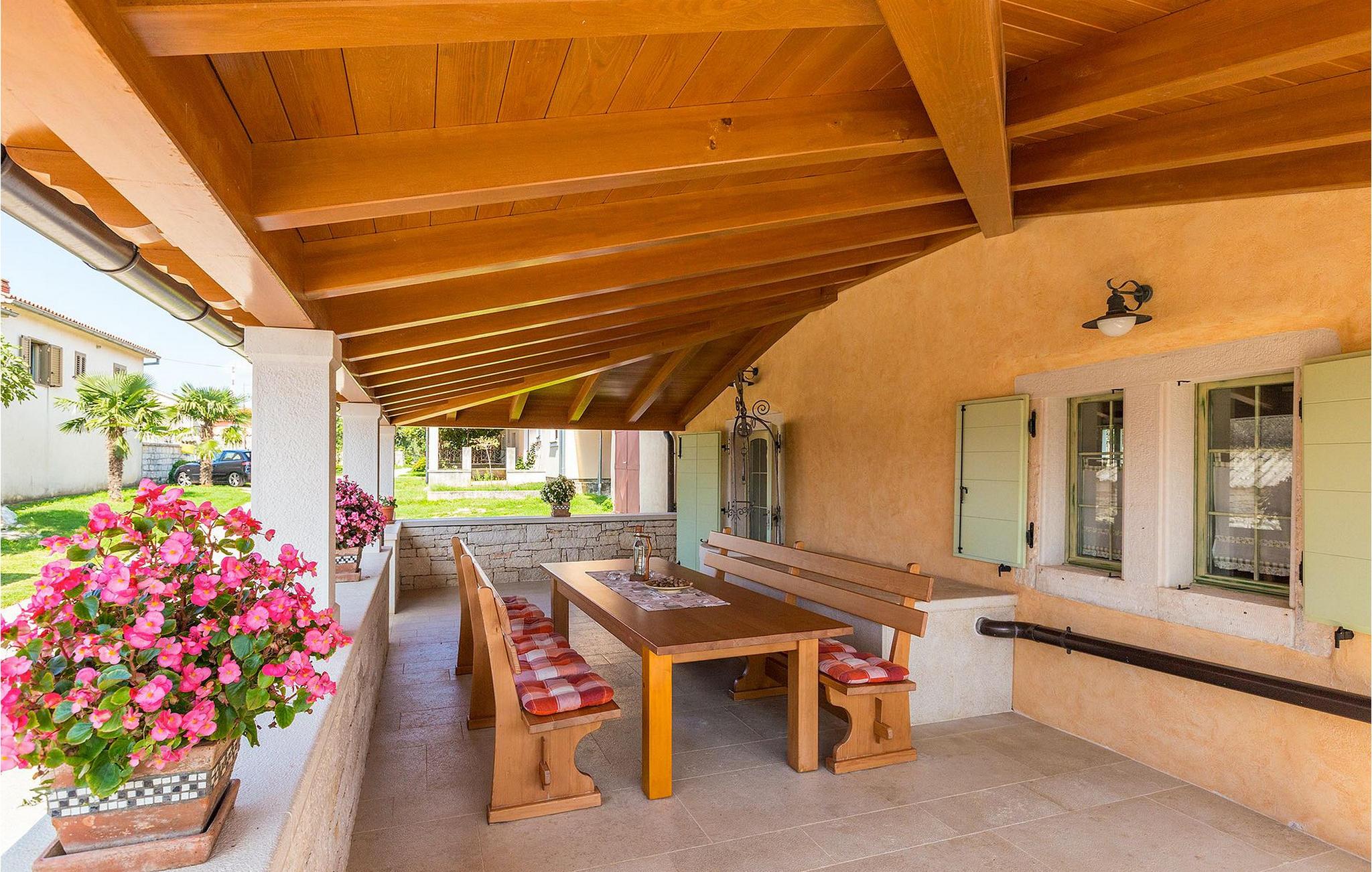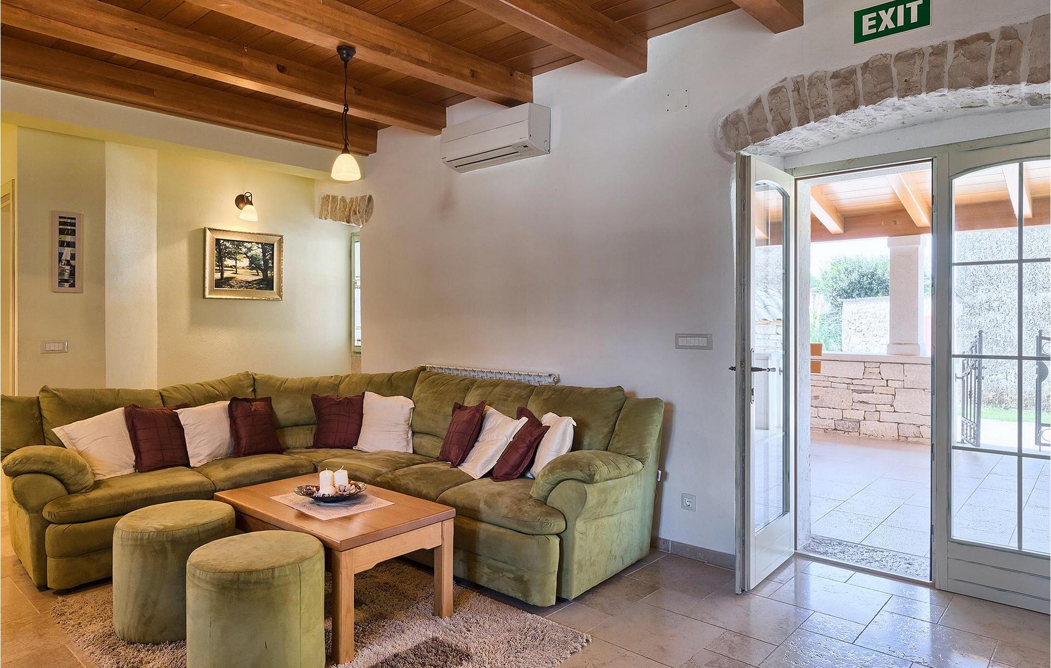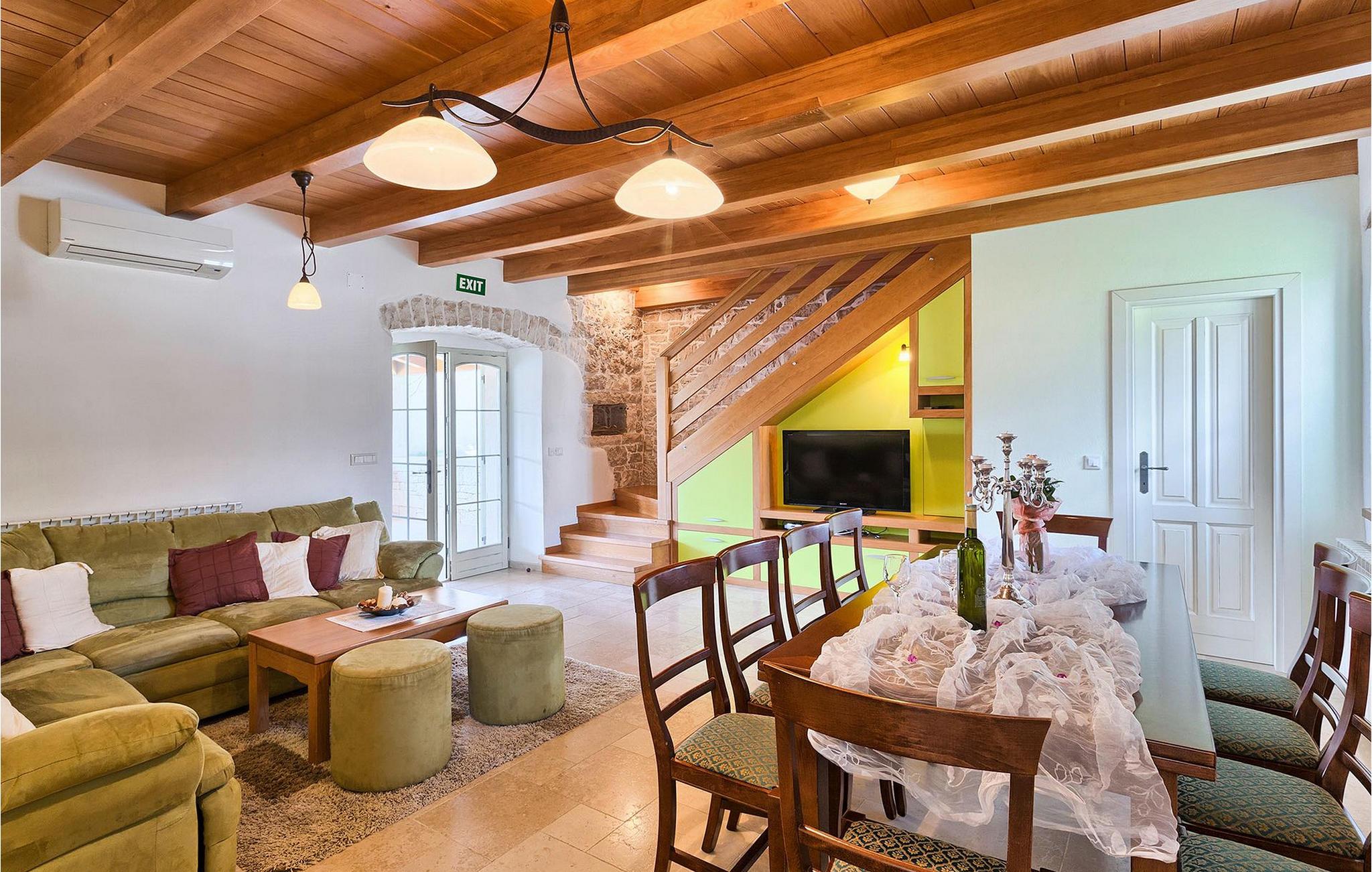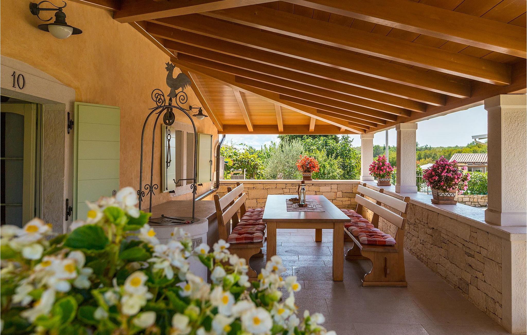 Denne charmerende ejendom kan rumme op til 8 personer i 4 dejligt indrettede soveværelser (2 med dobbeltsenge og 2 med 2 enkeltsenge) og en ekstra sovesofa på øverste etage. Alle værelser har aircondition og nyudstyrede med LCD-tv. Stuen er rummelig og hyggelig og byder på komfort og afslapning. Opholdsstuen består af en komfortabel stue med sofa, spiseplads og et veludstyret køkken. Foran villaen er der en skøn overdækket terrasse, hvor du finder et stort spisebord til spisning under åben himmel. På den anden side af gaden, flere skridt væk, er en adskilt muret og indhegnet gårdhave med en swimmingpool, hvor du kan forfriske dig på varme sommerdage. Her finder du et fuldt udstyret sommerkøkken med stort spisebord samt grill. På ejendommen er der en børnegynge og bordtennis til din og dit barns underholdning. Denne ejendom er beliggende i den centrale del af halvøen Istrien, nær den lille by Kanfanar, mere præcist landsbyen Bubani. Den gamle arkitektur i Kanfanar og de omkringliggende landsbyer er velbevaret, og oliven dominerer dette område med et varmt middelhavsklima. Kanfanar og dets omkringliggende landskab er velkendt, ikke kun for sin historiske og kulturelle arv, men for fremragende ægte istriske køkken. Istrien er et unikt og fortryllet sted, der har budt velkommen til besøgende og bosættere fra alle dele af verden, så længe vi har nedtegnet historie. Byen Pula med dets romerske amfiteater og Brijuni nationalpark med en 18-hullers golfbane ligger kun 20 minutters kørsel derfra. Gode restauranter og taverner kan findes på kun en kort køretur i alle retninger. Det er et fantastisk sted at nyde maden, historien og trods alt at slappe af. Bil anbefales.
