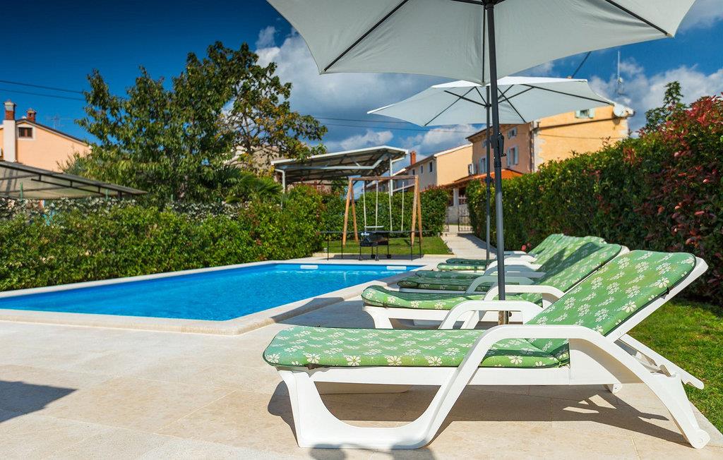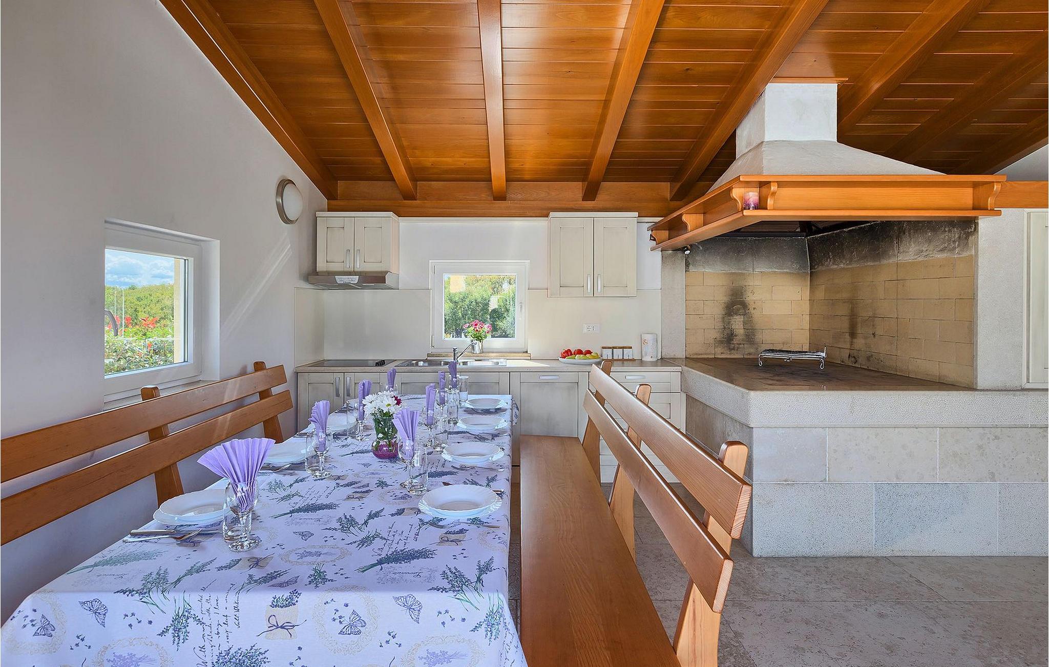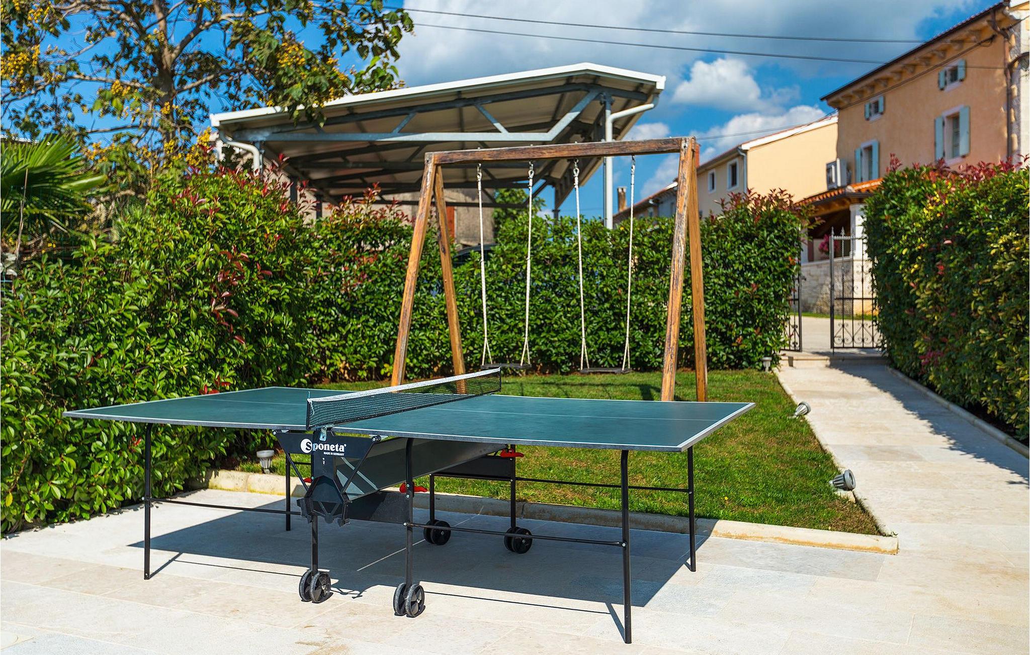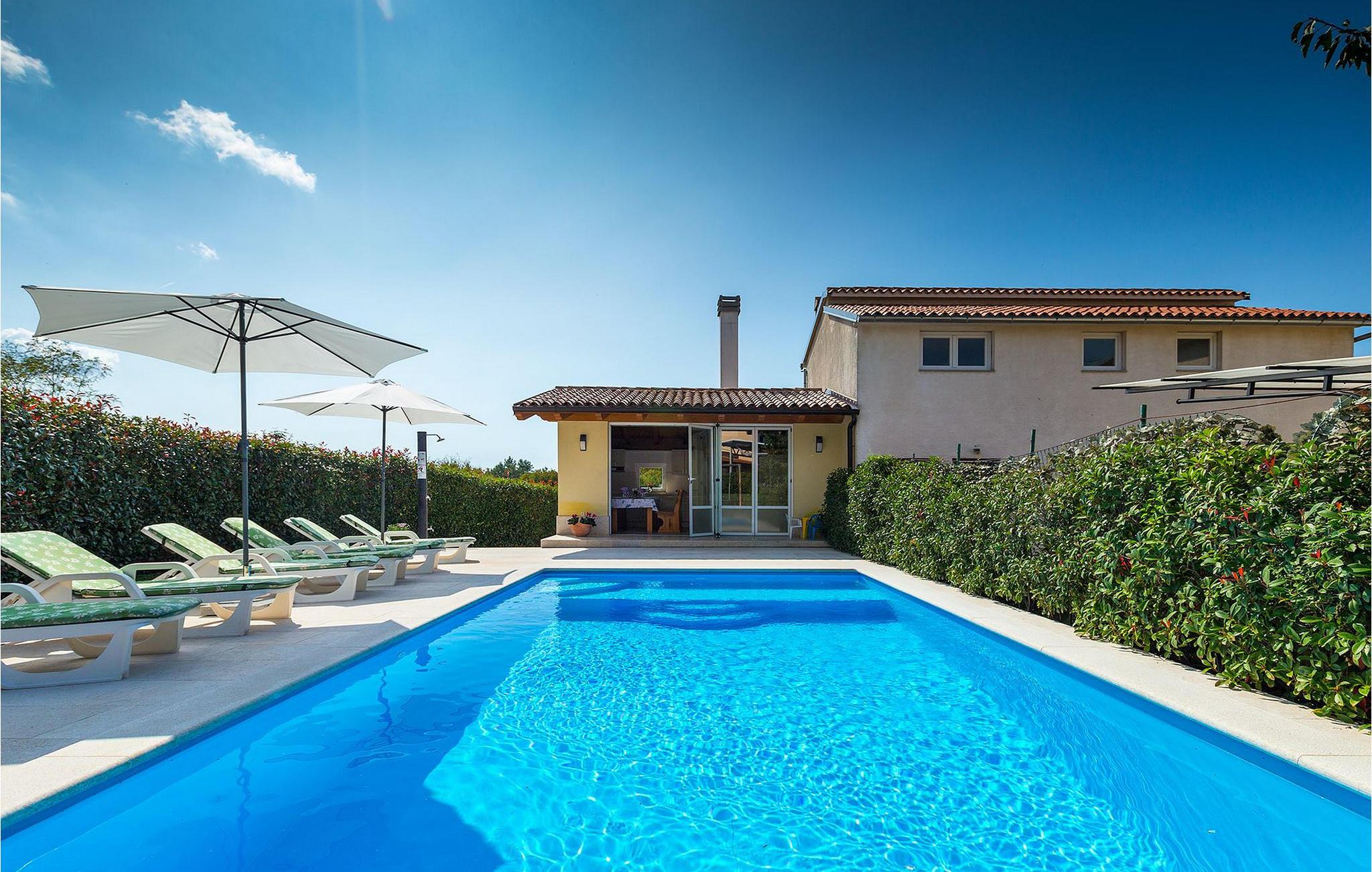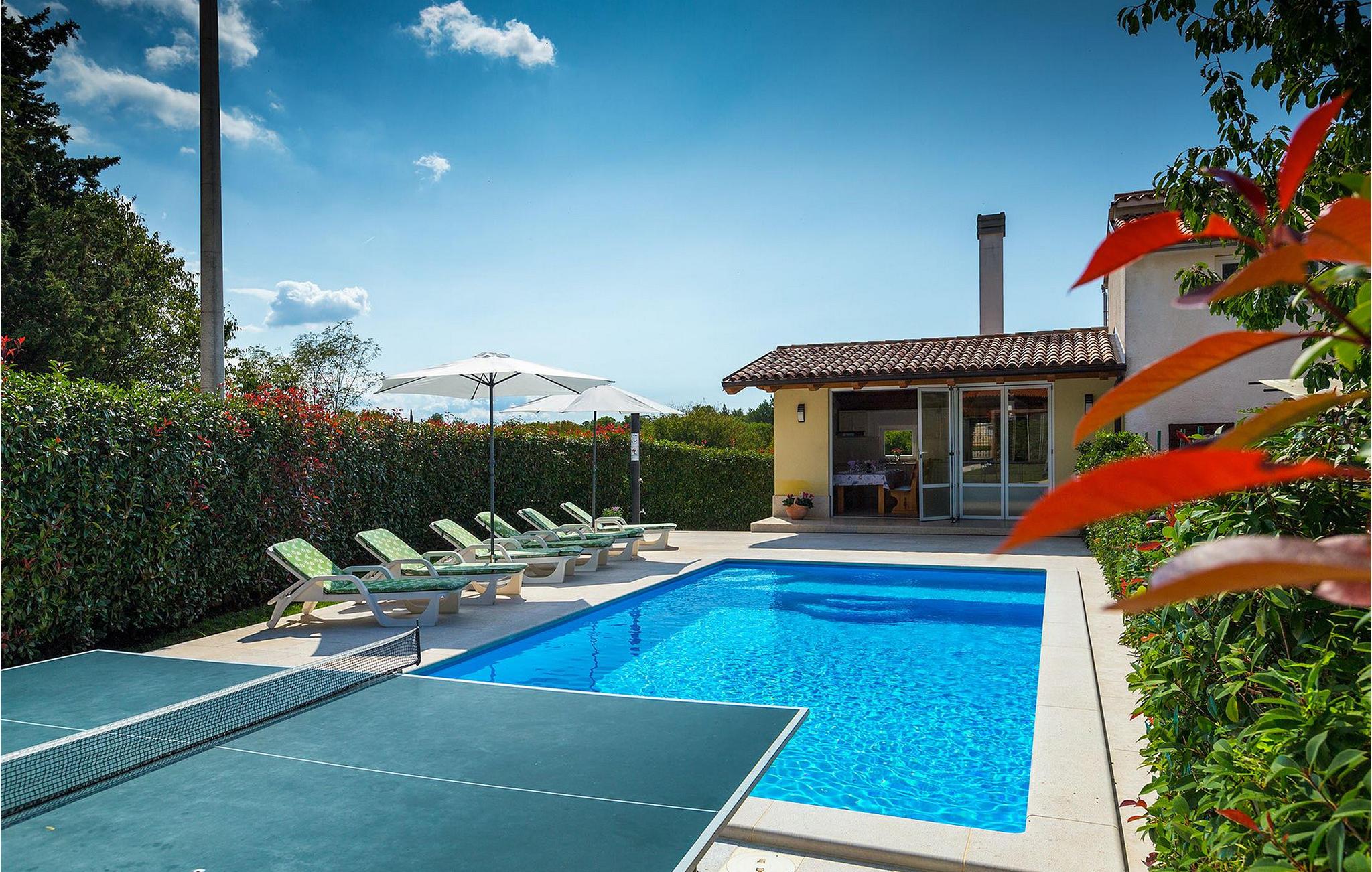 Denne charmerende ejendom kan rumme op til 8 personer i 4 dejligt indrettede soveværelser (2 med dobbeltsenge og 2 med 2 enkeltsenge) og en ekstra sovesofa på øverste etage. Alle værelser har aircondition og nyudstyrede med LCD-tv. Stuen er rummelig og hyggelig og byder på komfort og afslapning. Opholdsstuen består af en komfortabel stue med sofa, spiseplads og et veludstyret køkken. Foran villaen er der en skøn overdækket terrasse, hvor du finder et stort spisebord til spisning under åben himmel. På den anden side af gaden, flere skridt væk, er en adskilt muret og indhegnet gårdhave med en swimmingpool, hvor du kan forfriske dig på varme sommerdage. Her finder du et fuldt udstyret sommerkøkken med stort spisebord samt grill. På ejendommen er der en børnegynge og bordtennis til din og dit barns underholdning. Denne ejendom er beliggende i den centrale del af halvøen Istrien, nær den lille by Kanfanar, mere præcist landsbyen Bubani. Den gamle arkitektur i Kanfanar og de omkringliggende landsbyer er velbevaret, og oliven dominerer dette område med et varmt middelhavsklima. Kanfanar og dets omkringliggende landskab er velkendt, ikke kun for sin historiske og kulturelle arv, men for fremragende ægte istriske køkken. Istrien er et unikt og fortryllet sted, der har budt velkommen til besøgende og bosættere fra alle dele af verden, så længe vi har nedtegnet historie. Byen Pula med dets romerske amfiteater og Brijuni nationalpark med en 18-hullers golfbane ligger kun 20 minutters kørsel derfra. Gode restauranter og taverner kan findes på kun en kort køretur i alle retninger. Det er et fantastisk sted at nyde maden, historien og trods alt at slappe af. Bil anbefales.