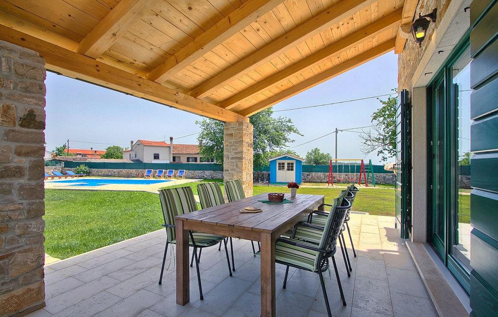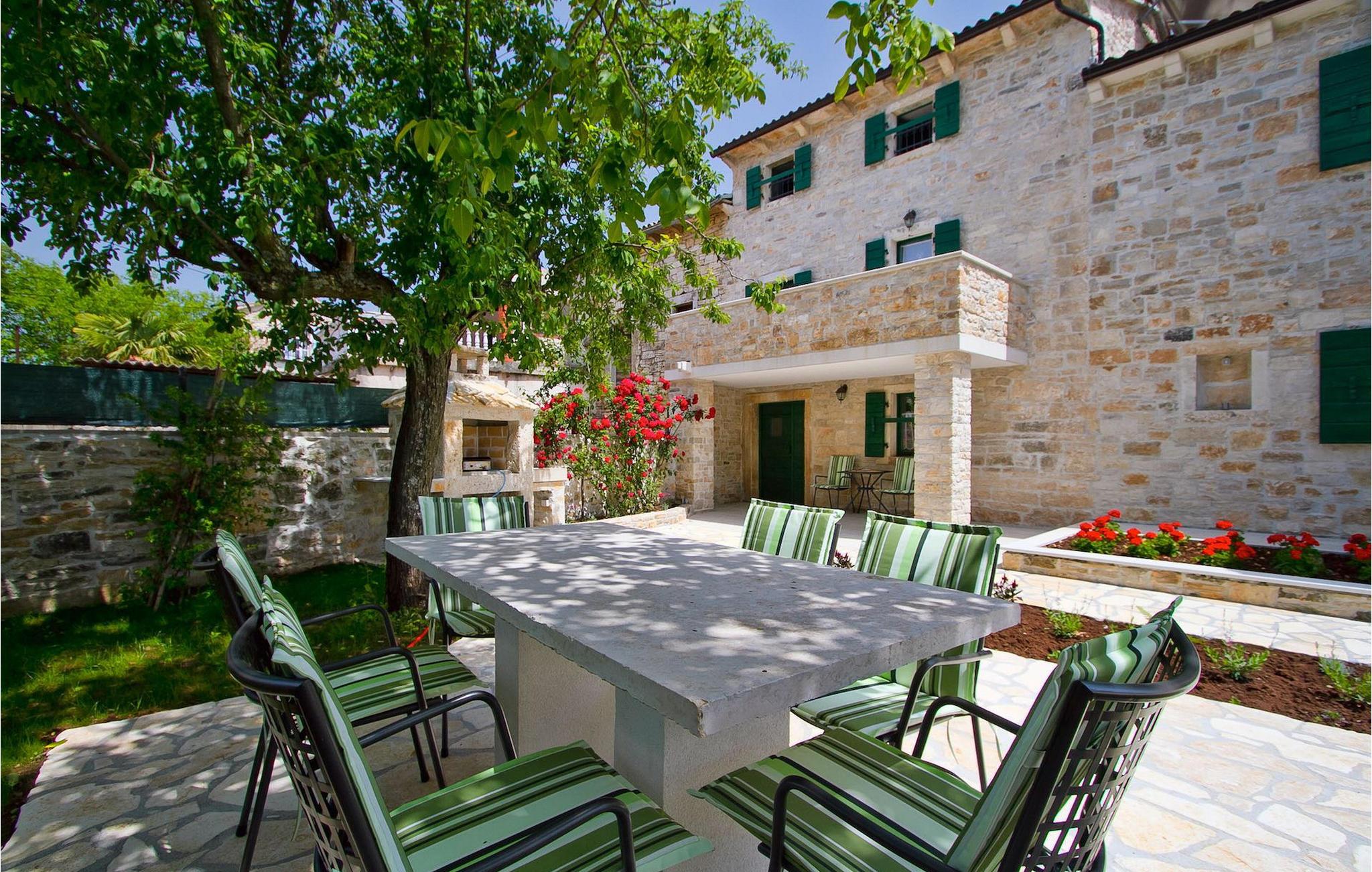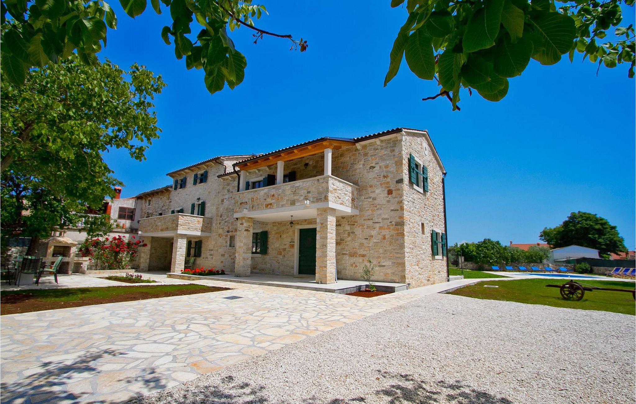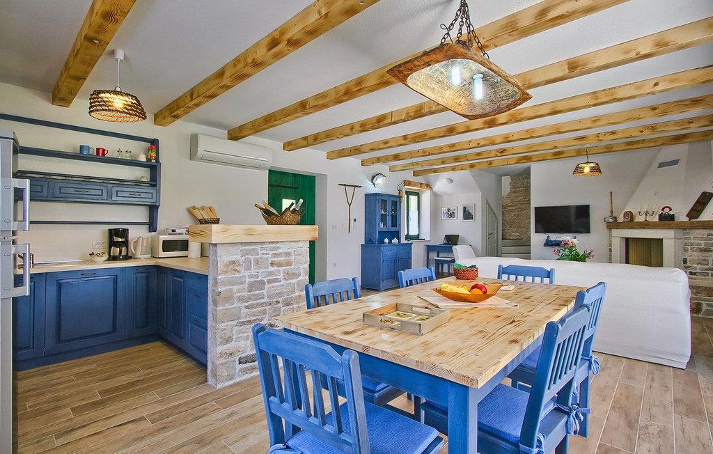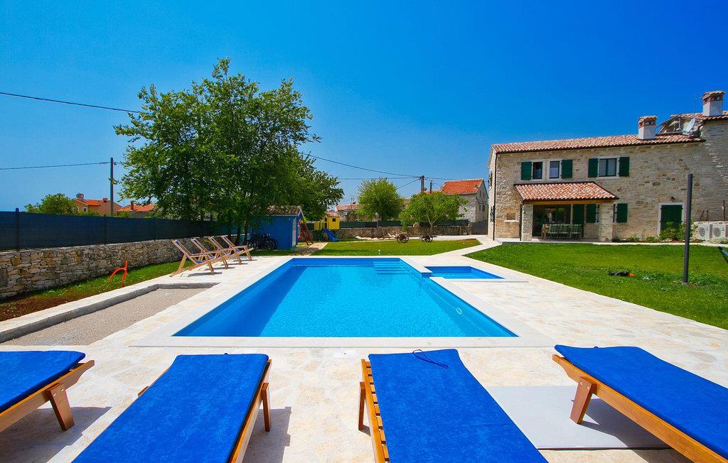 Die Villa Soricevi Dvori besteht aus zwei Doppelhaushälften, die zusammen vermietet werden. Das Haus befindet sich auf einem 1000 m2 großen Grundstück und bietet Platz für bis zu 12 Personen (4+2 pro Haus). Die Villa verfügt über einen großen Garten mit zwei Tischen für 6 Personen, die zum Essen im Freien zusammengestellt werden können, sowie zwei Außenkaminen. Das Highlight des Gartens ist der große private Pool mit Sonnenschirmen und Sonnenliegen - perfekt zum Entspannen! Wenn Sie sportlich aktiv sein möchten, gibt es im Garten ein Volleyball- und Badmintonfeld. Kinder haben ihren eigenen Bereich auf dem Spielplatz mit Schaukeln und Rutsche. Wenn Sie die Umgebung auf zwei Rädern erkunden möchten, stehen Ihnen 8 Fahrräder zur Verfügung. Es gibt auch ein separates Gebäude im Garten, wo sich der Wellnessbereich befindet. Es besteht aus einem schönen Innenjacuzzi, einer Dusche, Liegestühlen und einer Finnischen Sauna. Was den Innenraum betrifft, so sind alle Zimmer klimatisiert, mit Möbeln im Shabby-Chic-Stil eingerichtet und mit allen Haushaltsgeräten ausgestattet. Im Erdgeschoss verfügt jedes der Doppelhaushälften über eine Küche, ein Esszimmer mit einem Tisch für 6 Personen und ein schönes Wohnzimmer mit Kamin. Es gibt auch eine separate Toilette in jedem Teil. Im ersten Haus führt die Innentreppe in den ersten und zweiten Stock, wo sich zwei Schlafzimmer befinden. Im ersten Stock finden Sie ein Schlafzimmer mit schöner privater Terrasse. Die Innentreppe im zweiten Haus führt in den ersten Stock, wo sich zwei Schlafzimmer befinden. Vom Korridor im ersten Stock haben Sie Zugang zur überdachten Terrasse. Alle 4 Schlafzimmer verfügen über ein eigenes Badezimmer mit Dusche, einen Komfort, den Gäste gerne genießen. Wenn Sie von einem idyllischen Familienurlaub in Istrien träumen, sind Sie hier genau richtig.Villa Soricevi Dvori befindet sich in Barat, einem Dorf an den Hängen des Lim-Tals und nahe Kanafanar. Umgeben von Feldern, Olivenhainen, Weinbergen auf der typischen roten Erde, und Eichenwäldern. Barat ist der ideale Ort für einen Urlaub. Auf einer Höhe von 290 m, fernab von geschäftigem Treiben, bietet es saubere Luft und Ruhe. Barat liegt auf der südwestlichen Seite der Halbinsel, in der Nähe der istrischen Y Autobahn, auf der Sie in weniger als einer halben Stunde alle wichtigen Ziele in Istrien erreichen- Pula, Rovinj, Porec und andere Städte. Nahe Barat liegt Dvigrad, die Ruine einer verlassenen mittelalterlichen Stadt.