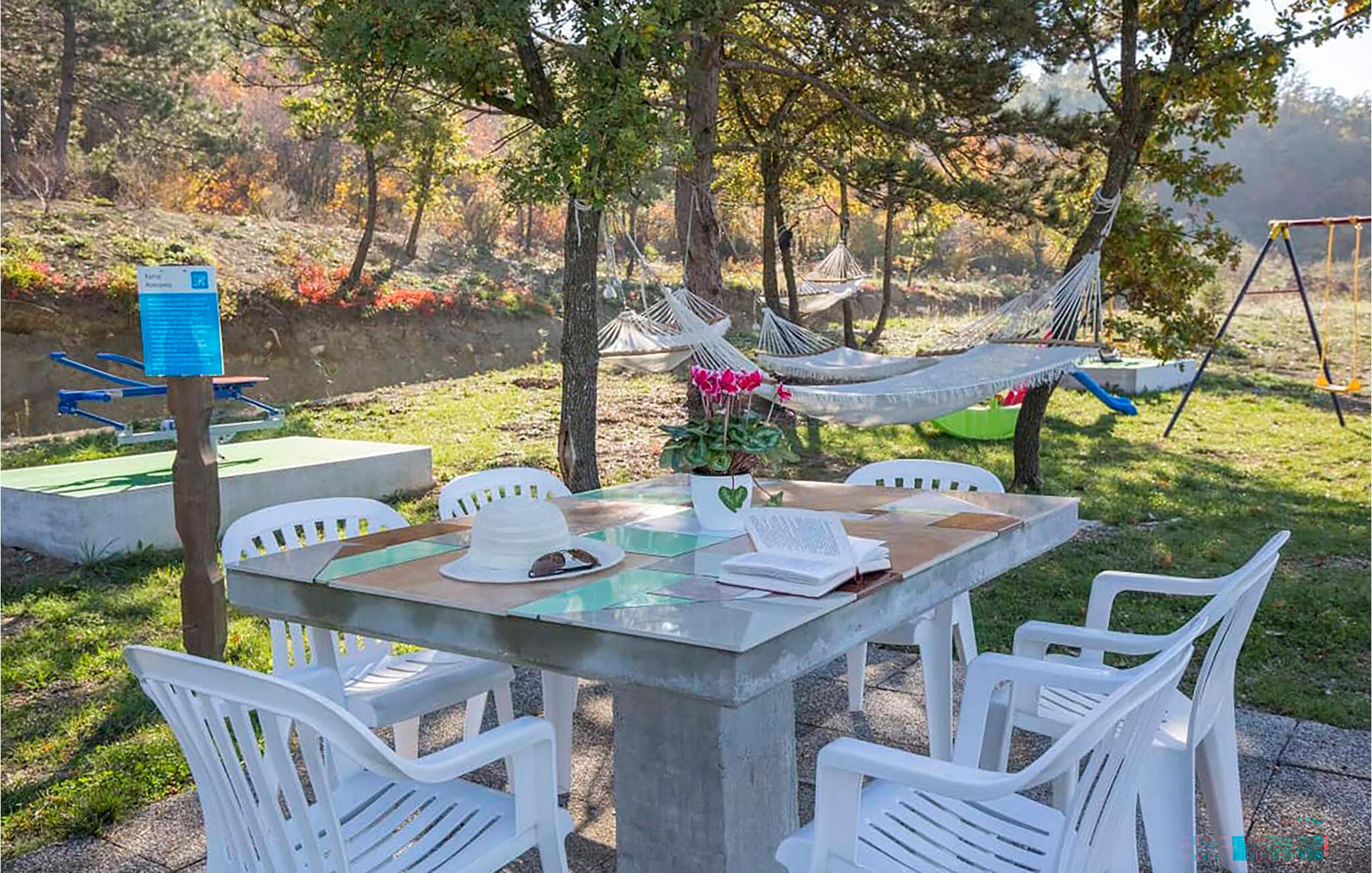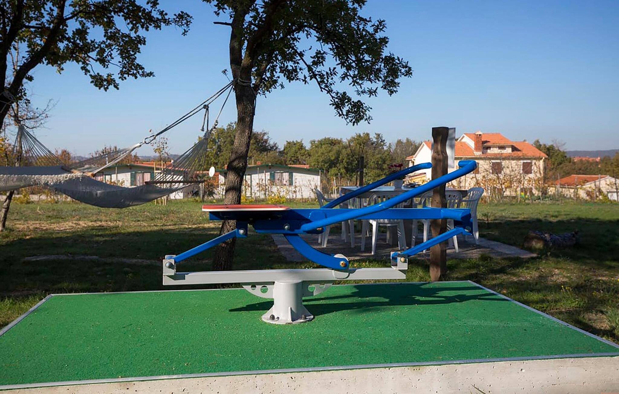 Den skyggefulde terrasse er det perfekte sted til en afslappet morgenmad eller en afslappende aften med et glas vin. Om dagen er den fælles pool ideel til solbadning. Lad op på liggestolene eller i hængekøjen, mens børnene nyder de forskellige udendørs legemuligheder.