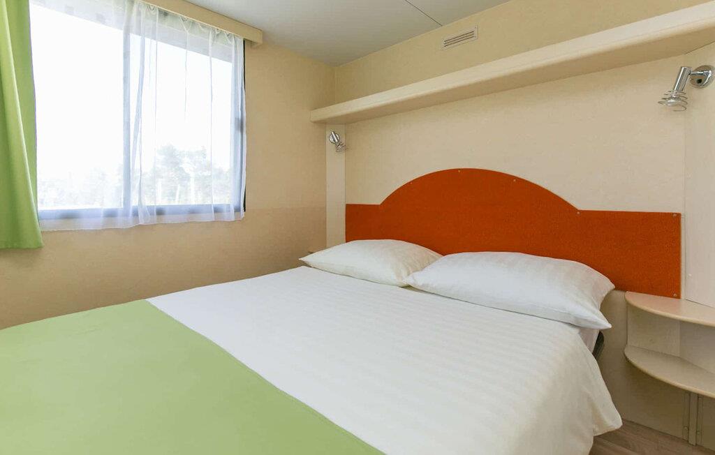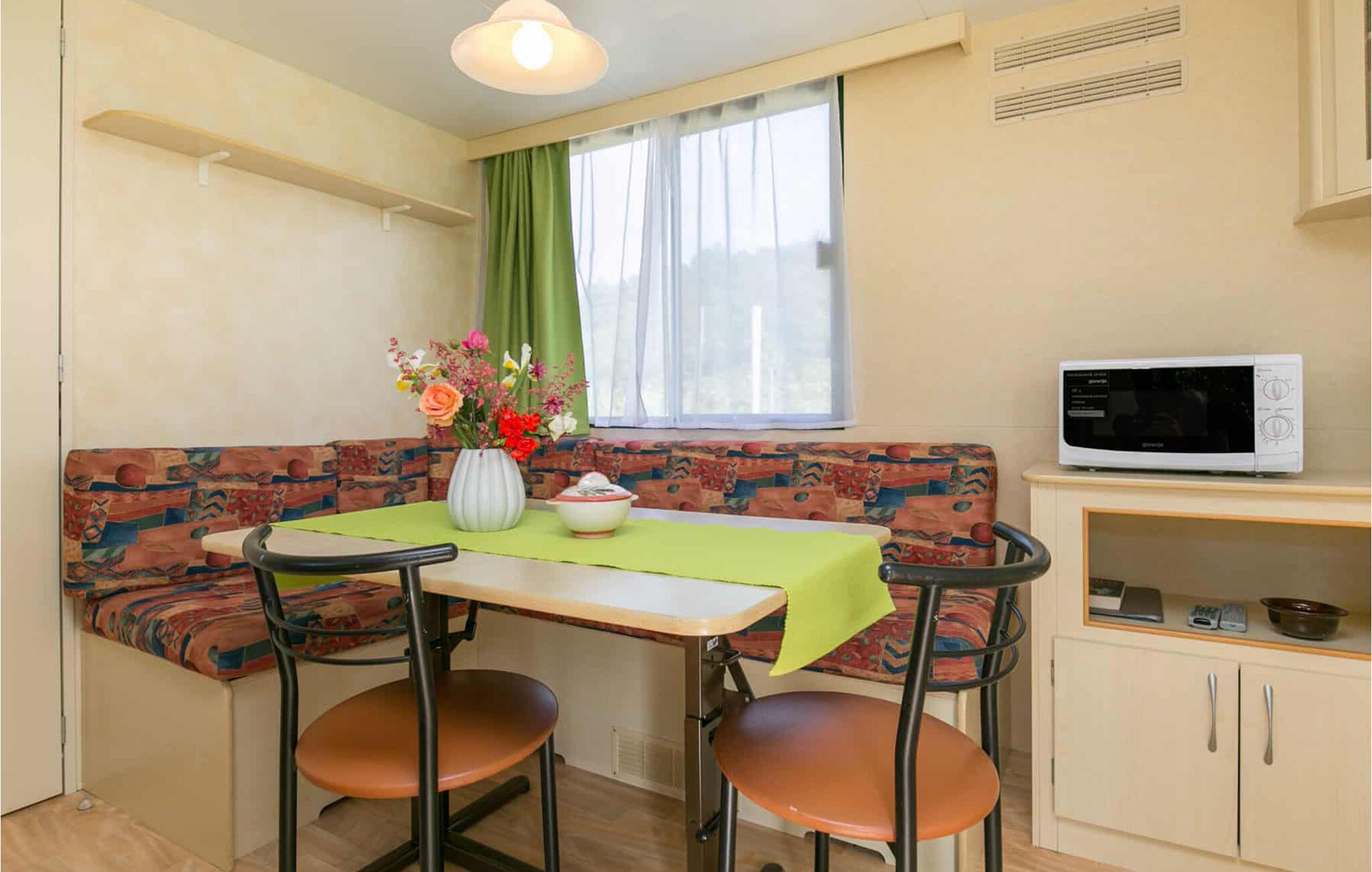 Dette charmerende mobilehome tilbyder komfortabel indkvartering til hele familien, så I kan sætte den travle hverdag på pause. Planlæg jeres aktiviteter med fælles måltider i det indbydende siddeområde. Efter en lang dag kan I slappe af her til sjove spilleaftener.
