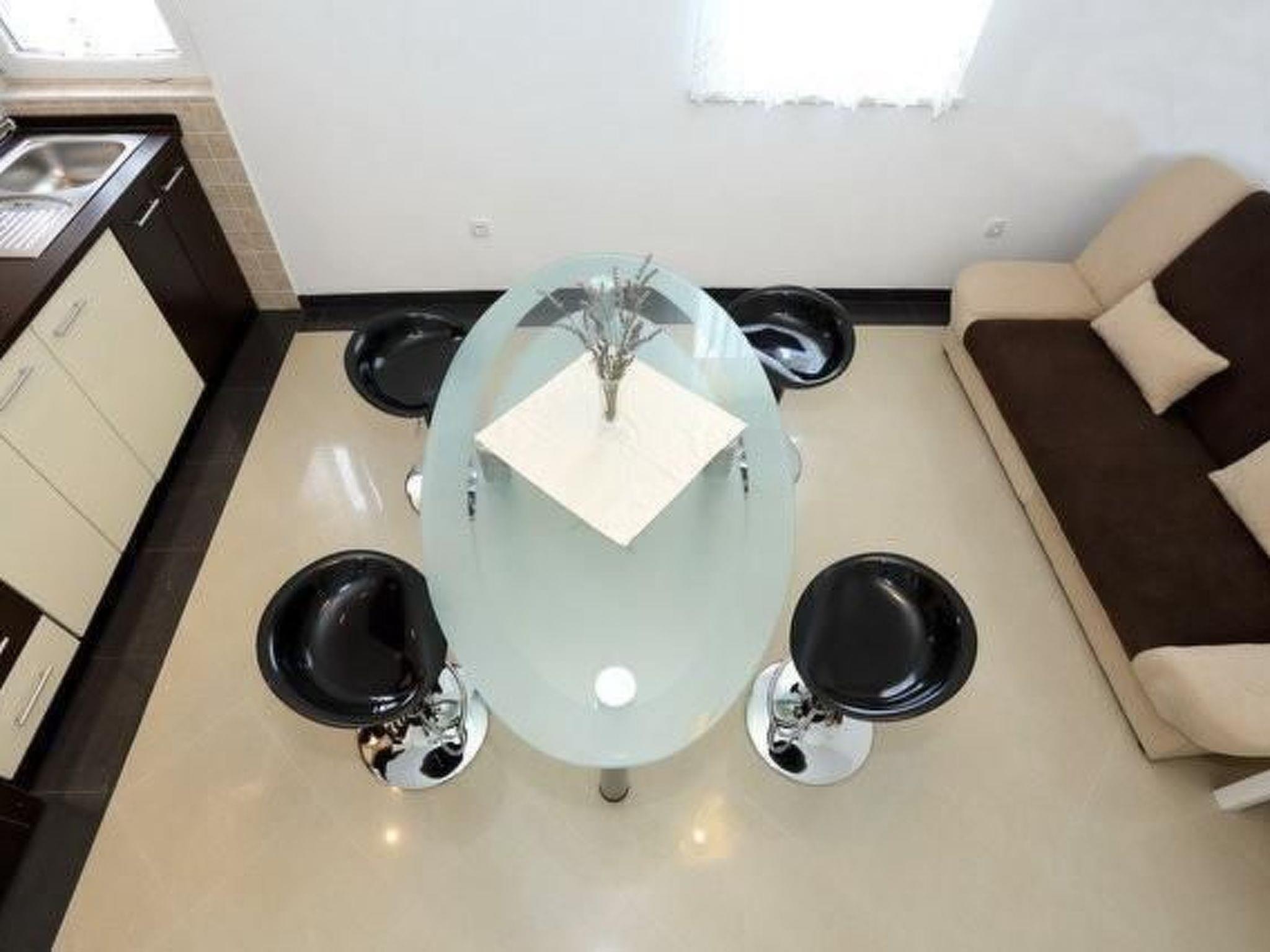 The 40m² apartment has a separate entrance and can accommodate five people. It has a bathroom with a shower, washbasin, toilet and bidet. The bedroom has a big double bed (180 x 200cm) and an armchair bed for one person (90 x 200cm). It also has a wardrobe and a flatscreen TV. Next to the bedroom there is a spacious living room with a cooking and sitting area. The kitchen unit is equipped with a hob, fridge with freezer compartment, microwave and kettle. The adjoining dining space has an oval glass table and four modern stools. Behind it there is also a sofa bed for two people (180 x 200cm).