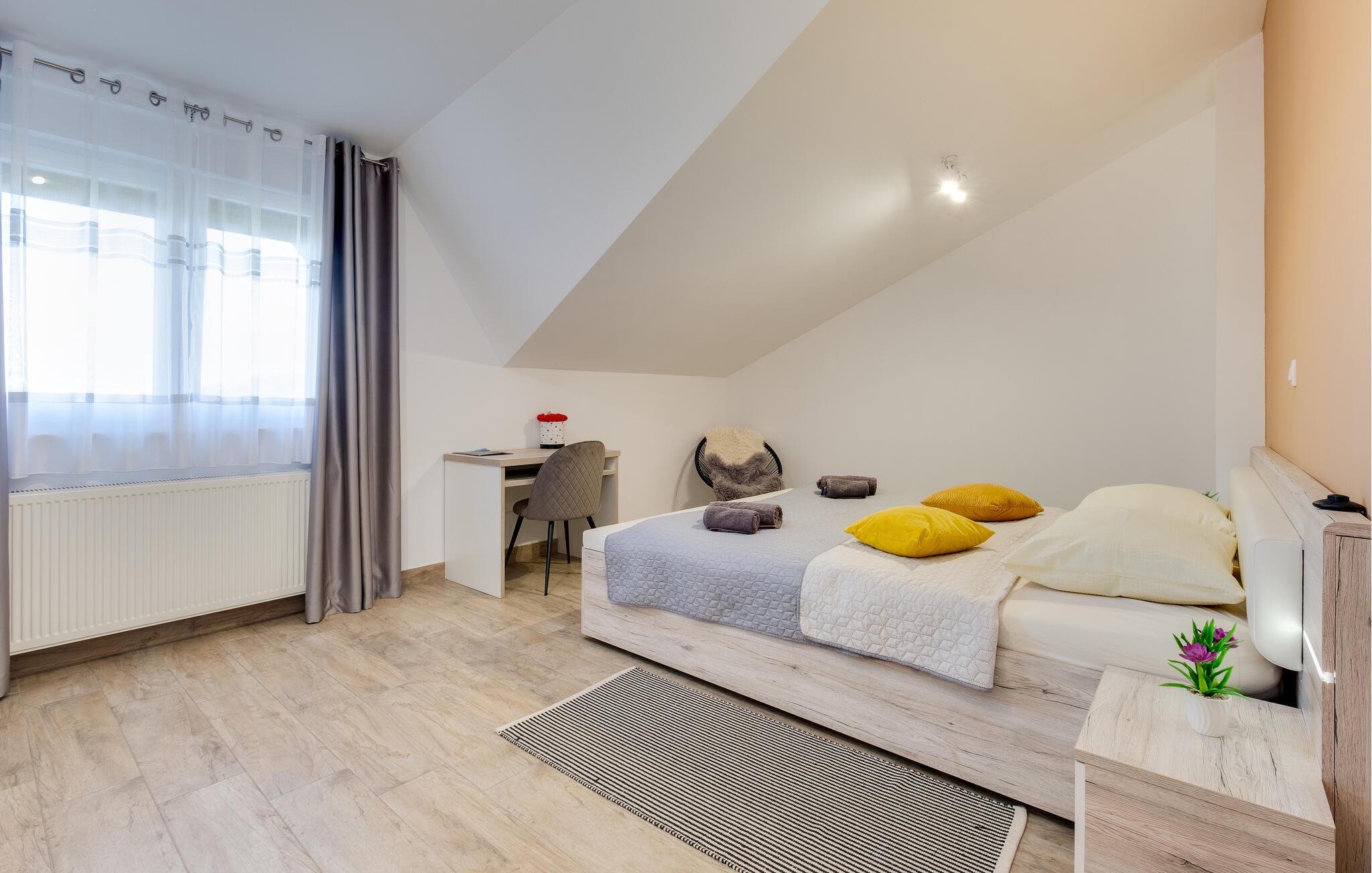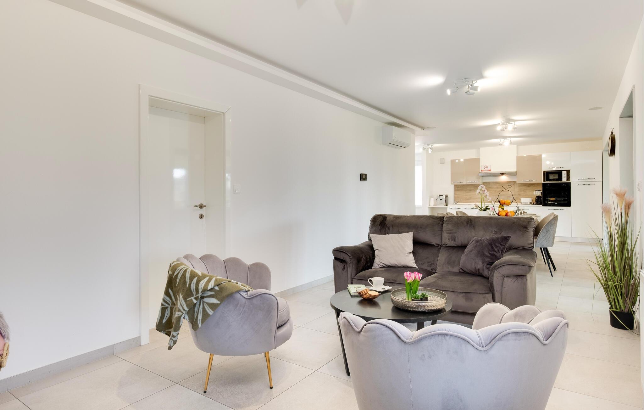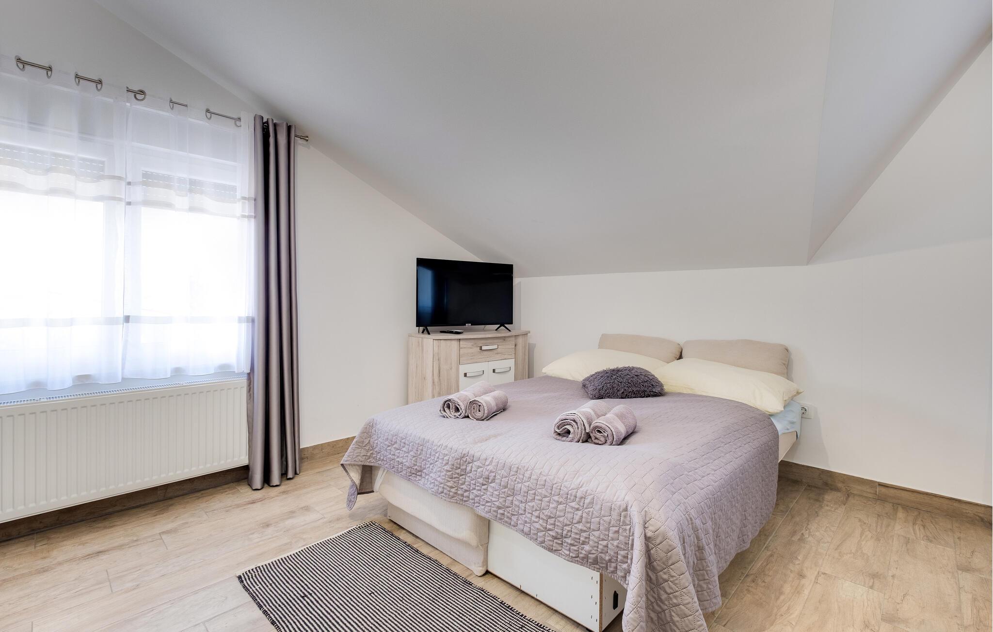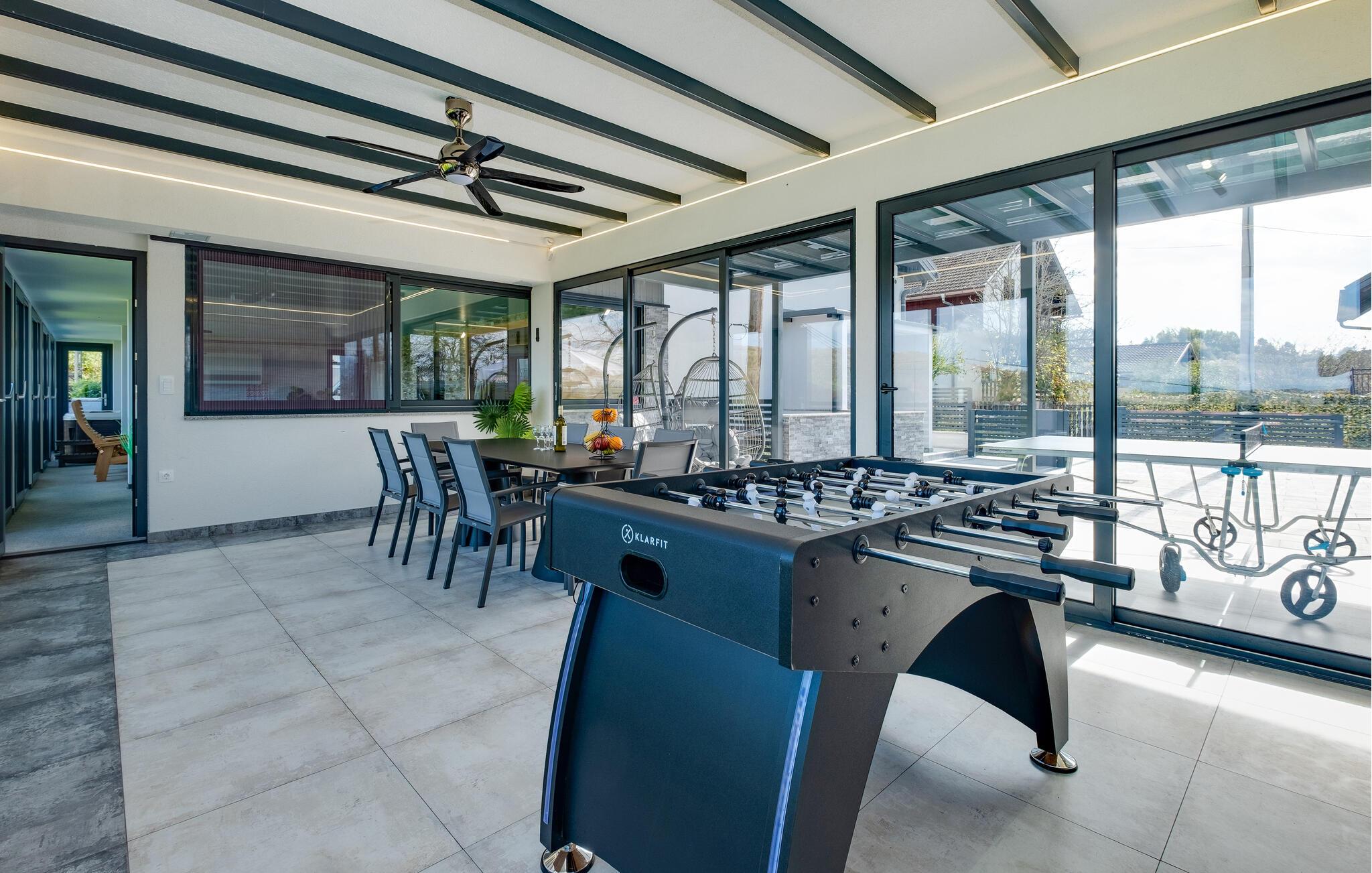 Dette rummelige, moderne feriehus i Tusilovic tilbyder alt, hvad du behøver for en afslappende ferie. De lyse og komfortabelt indrettede rum skaber en indbydende atmosfære, hvor du straks vil føle dig hjemme. Indendørs finder du en swimmingpool og en sauna – ideelle rammer for afslappende stunder. I sommerens udekøkken kan du fornøje dig med et spil bordfodbold, og den store terrasse inviterer dig til at opleve udsigten over de maleriske omgivelser.