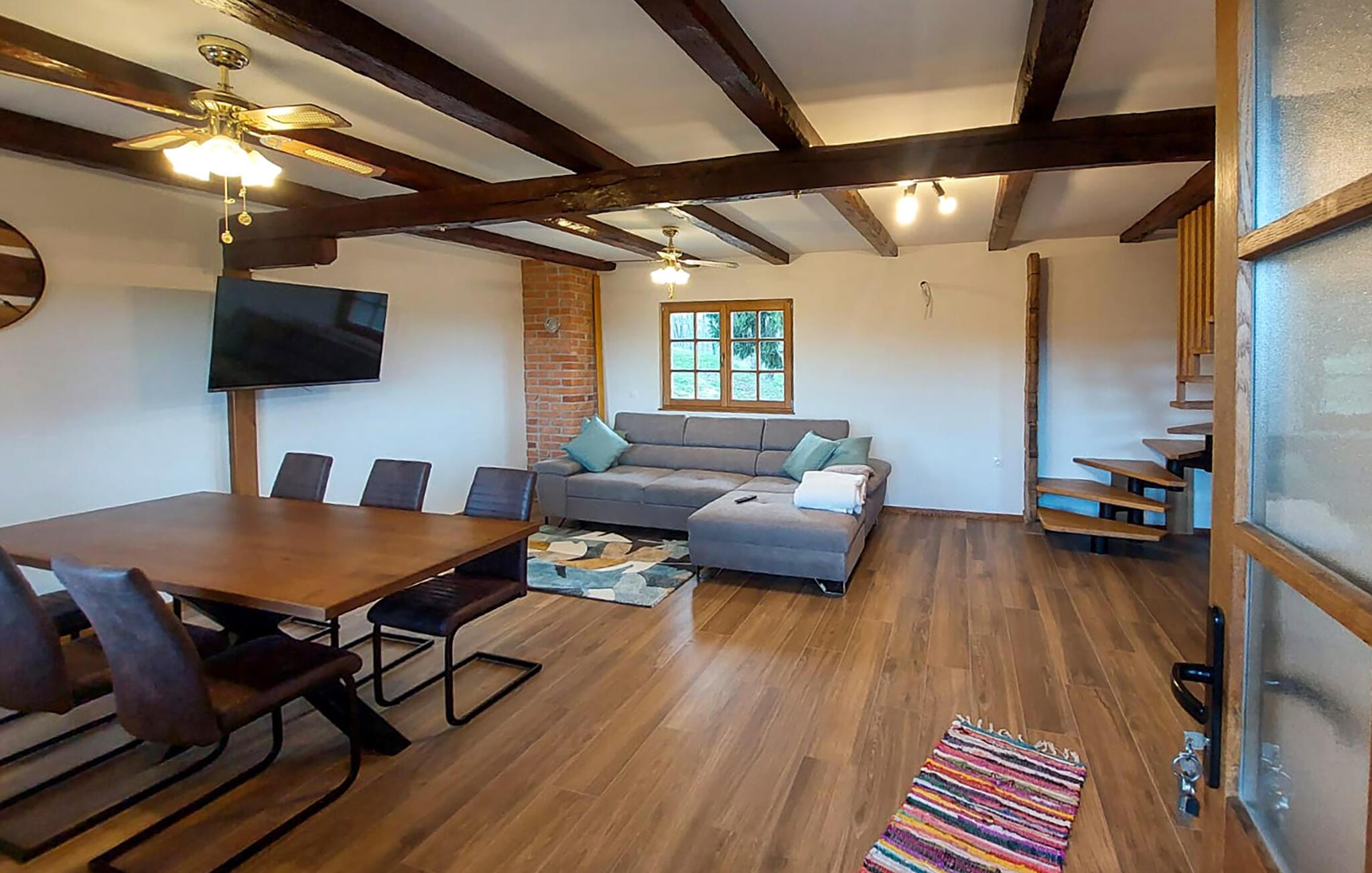 Det rummelige hus byder jer velkommen med en venlig og indbydende atmosfære. Varme trædetaljer, synlige loftsbjælker og rustikke møbler skaber en hyggelig atmosfære, hvor I hurtigt kan falde i ferietilstand. Lyt til jeres yndlingsmusik eller en interessant podcast eller tilbring en sjov aften med at spille kort.