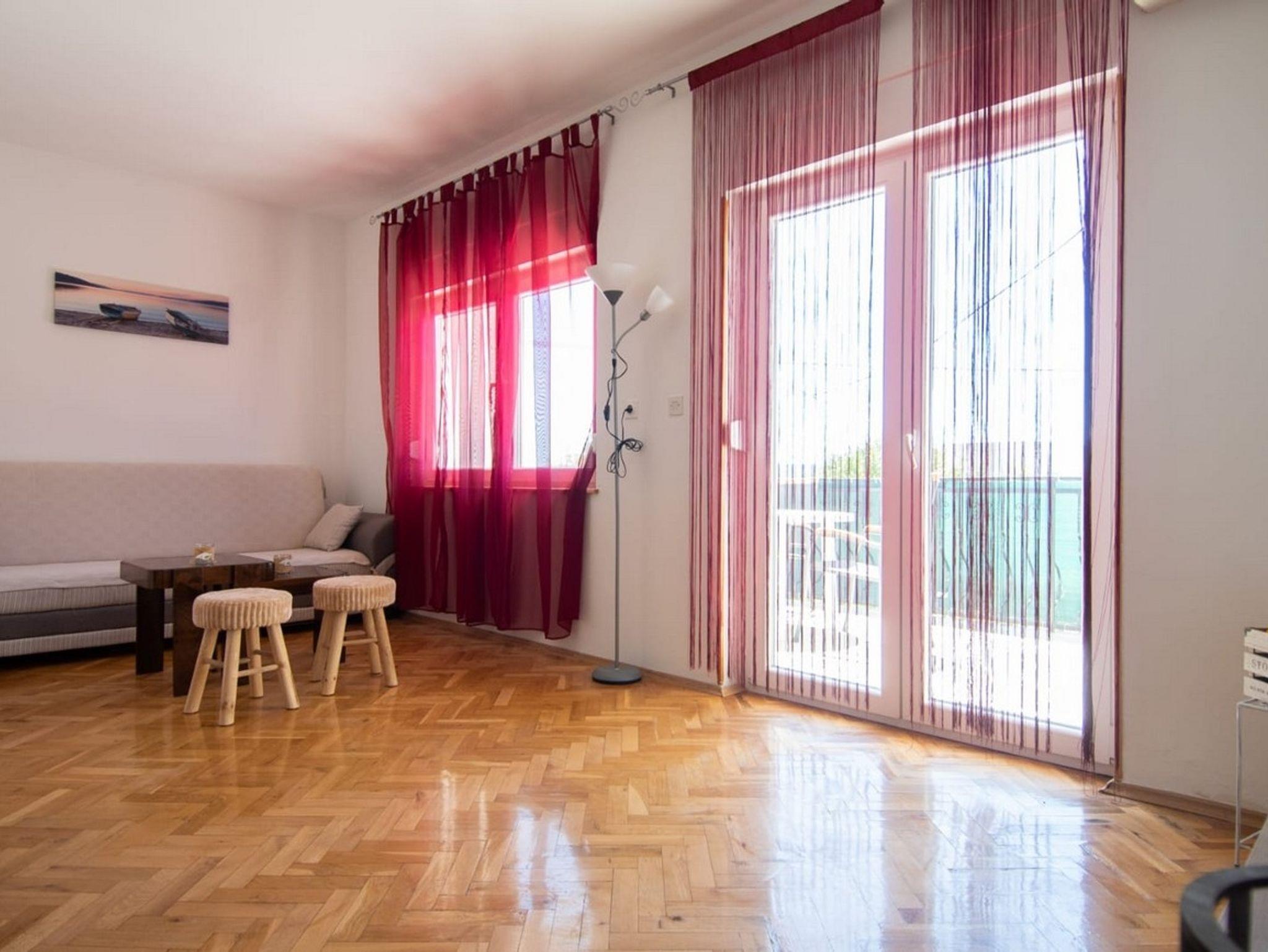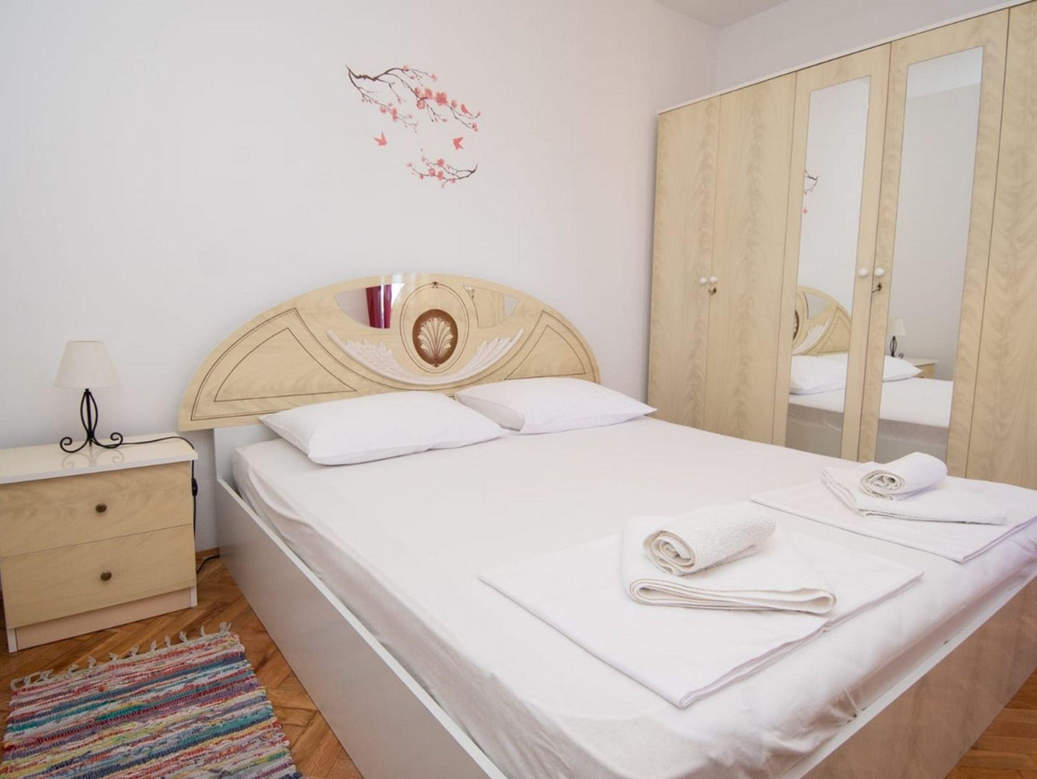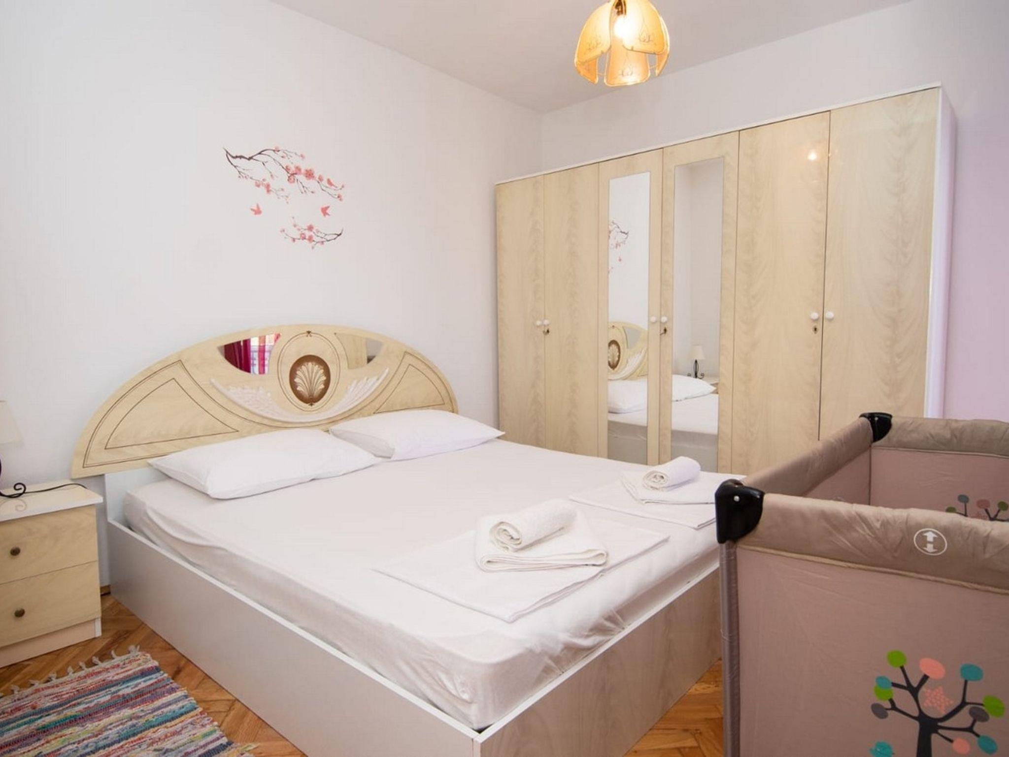 Ferienwohnung bietet Platz für 5 Gäste. Die Betten sind in Schlafzimmern, die es 2 gibt, und in Wohnzimmer, innerhalb einer Gesamtfläche von 60m2, angeordnet. Die Gäste haben einen eigenen Balkon zur Verfügung, auf der sie in warmen Sommernächten genießen können. Es ist erlaubt, Speisen auf dem Gemeinschafts-Grill vorzubereiten. IM PREIS INBEGRIFFEN: Kurtaxe, Endreinigung, Klimatisierung, Parkplatz, Internet, Kinderbett, Bügeleisen, Bügelbrett, Föhn. VERBINDLICHE ZUSÄTZLICHE KOSTEN: Aufzahlung für Kurzaufenthalte (prozentualer Zuschlag pro Nächtigungsanzahl: 30% - 1, 20% - 2, 10% - 3). Die Verfügbarkeit zusätzlicher Dienstleistungen in Ihrem reservierten Termin und die Preise derselben (falls nicht aufgeführt) müssen im Voraus überprüft werden. Zusätzliche Dienstleistungen die in der Zahlungsaufforderung nicht aufgeführt sind werden direkt beim Vermieter bezahlt, angenommen der Gast nutzt auch diese.