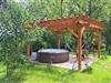 Der er fire træbygninger på ejendommen: et hovedhus, en udbygning med et moderne sommerkøkken og badeværelse samt et lysthus med grill og spabad. Slap af i spabadet, mens børnene leger i haven og på gyngerne.