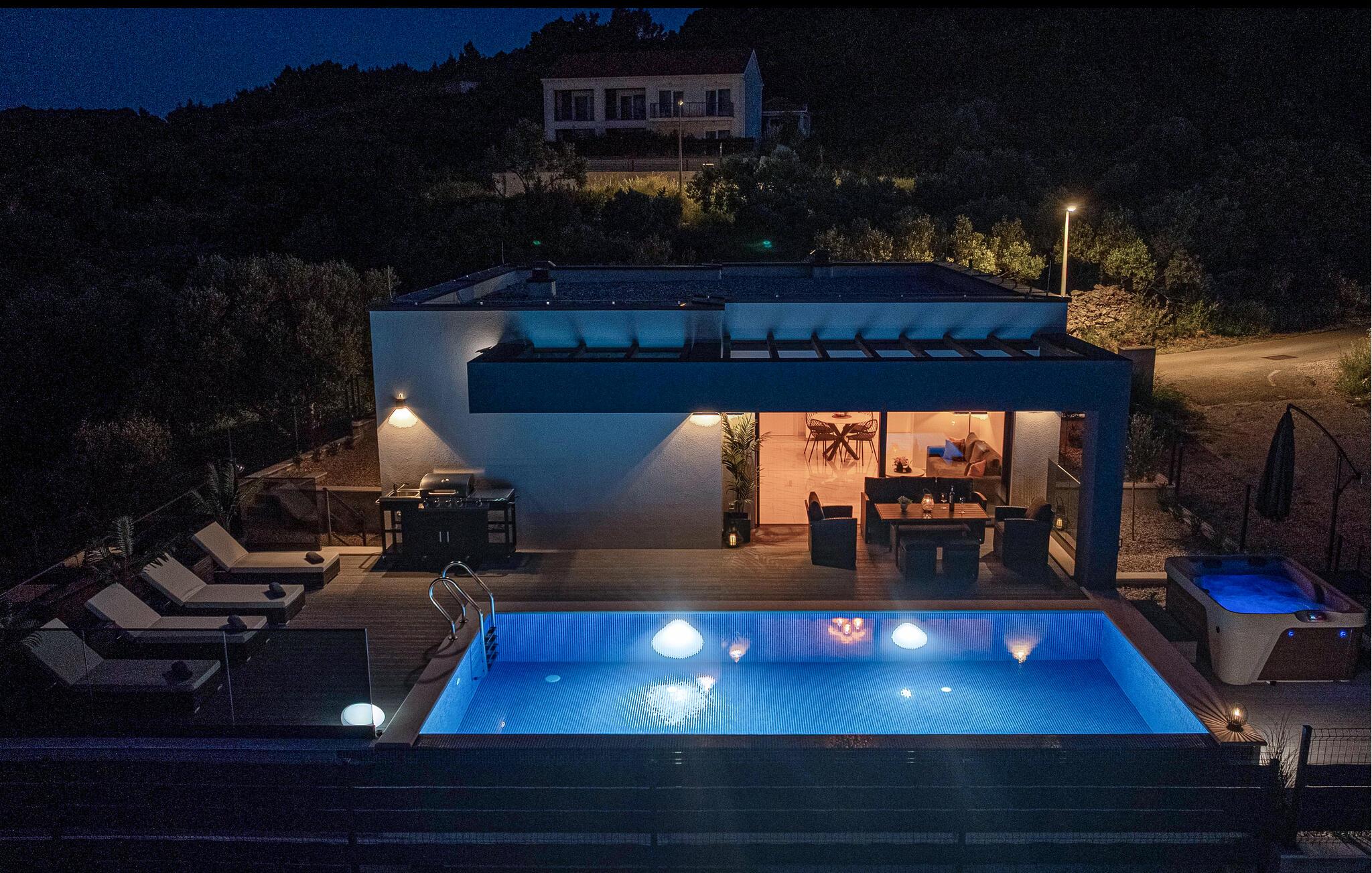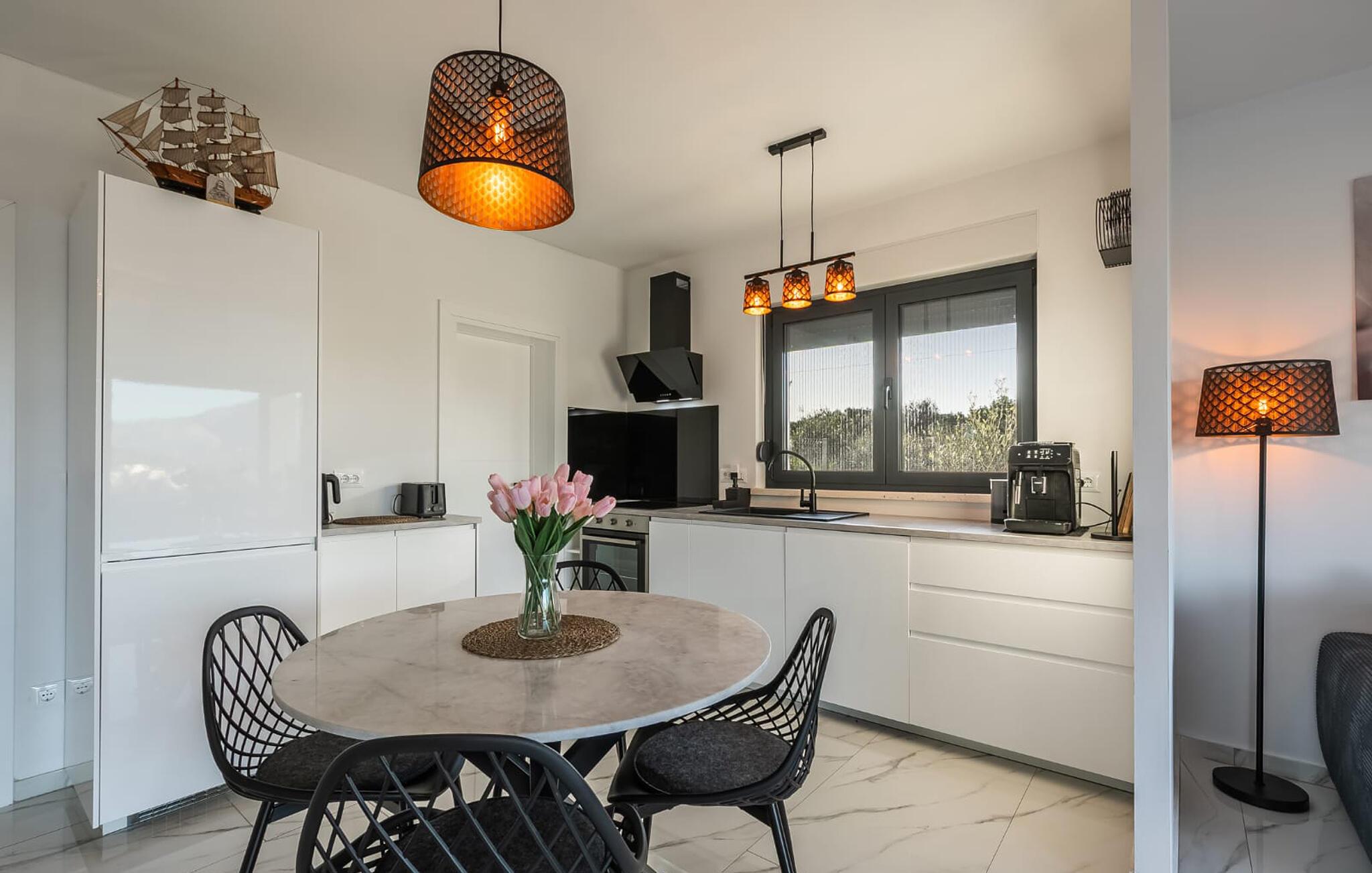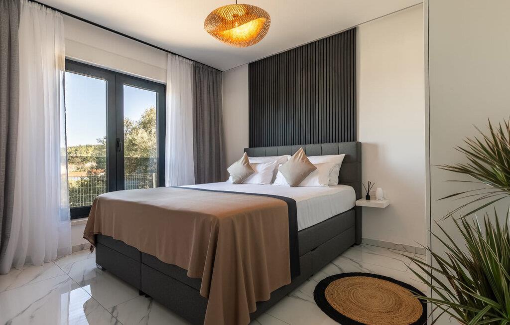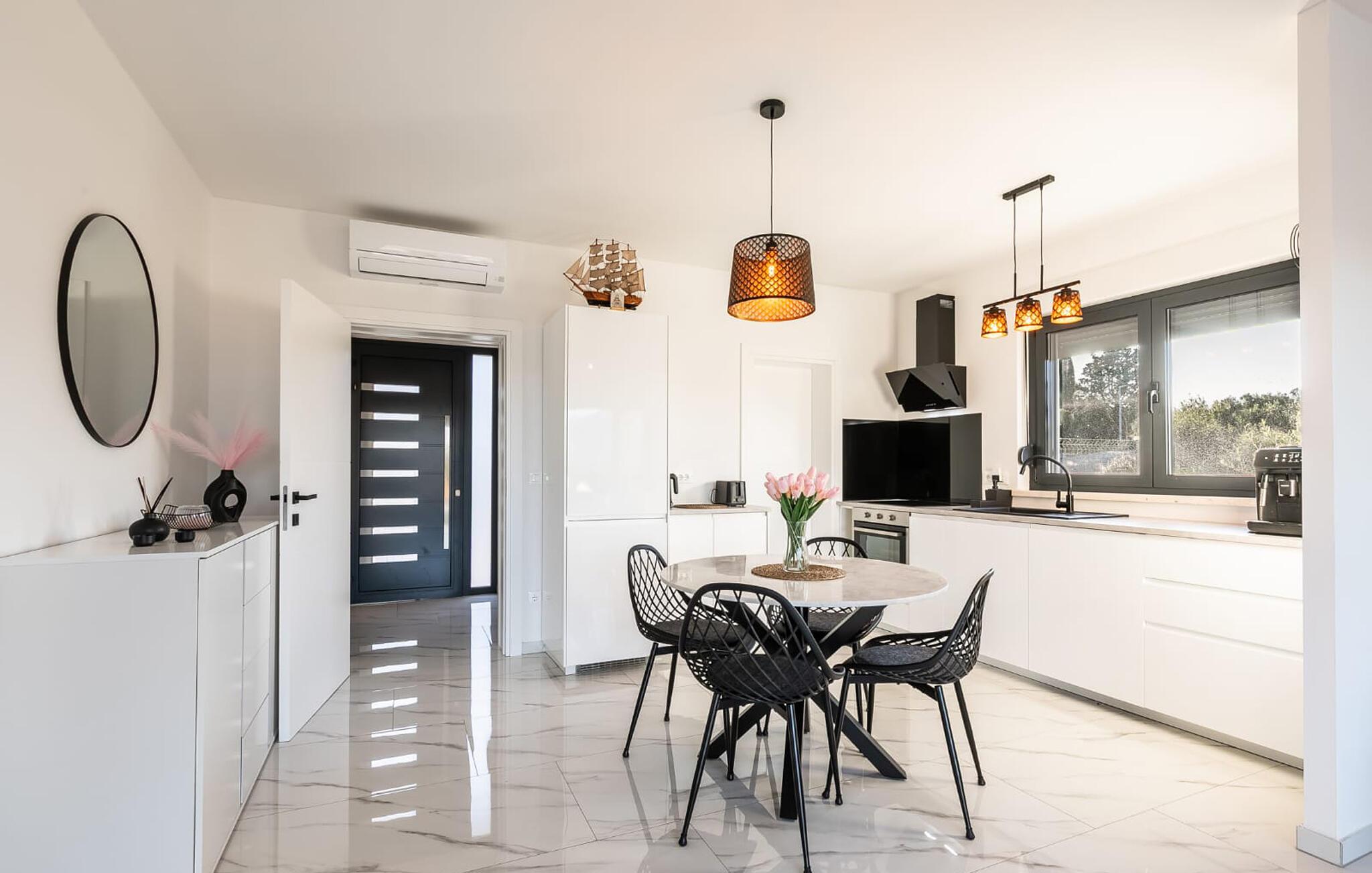Dette komfortable feriehus vil forkæle jer med et stilfuldt designet interiør, moderne faciliteter og smuk panoramaudsigt over landskabet og havet. Fremtryll kulinariske lækkerier i det åbne køkken, lad den behagelige brise strømme gennem værelserne, mens I nyder middelhavsretter, og sæt jer til rette til en filmaften i den behagelige sofa.
