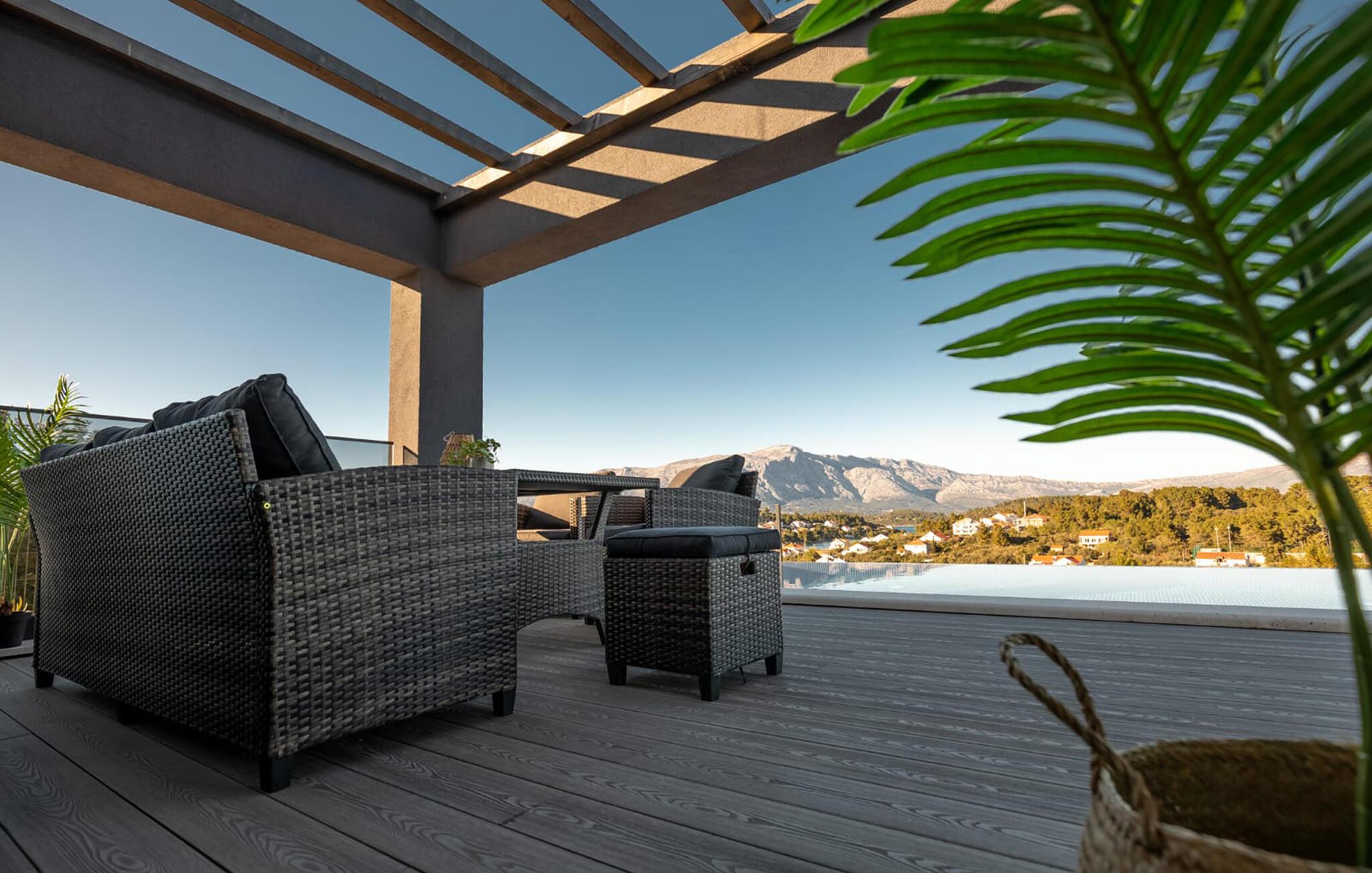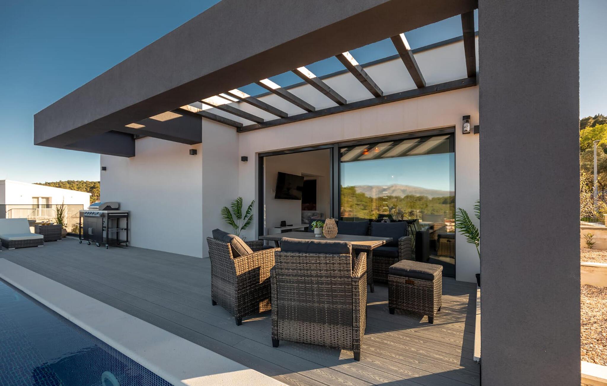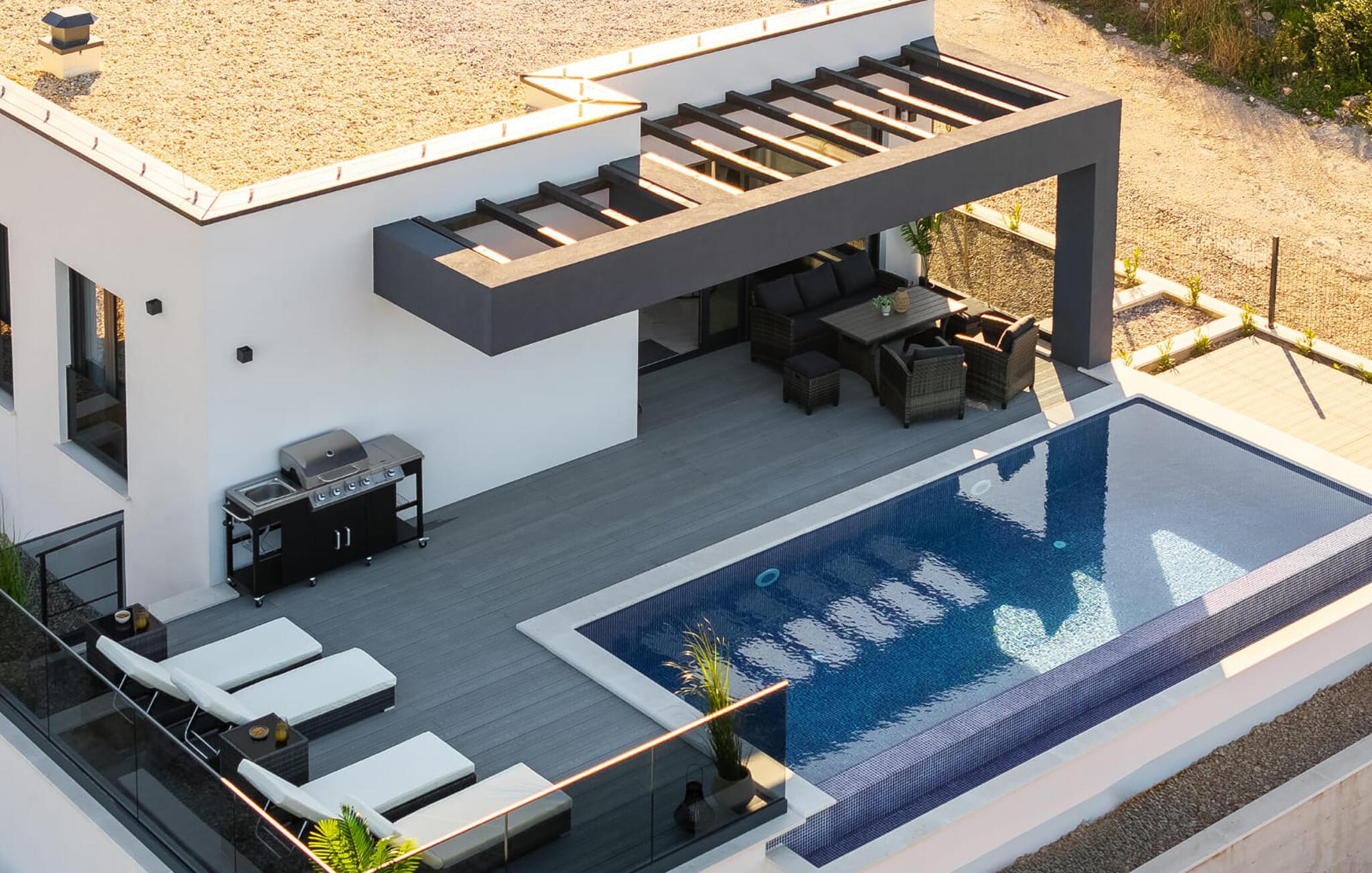 Træd gennem de brede skydedøre ud på jeres storslåede terrasse og Begynd dagene med morgenmad eller en forfriskende dukkert i infinity-poolen. nyd varme sommeraftener med lækre grillretter og snak natten lang over vin og stearinlys.
