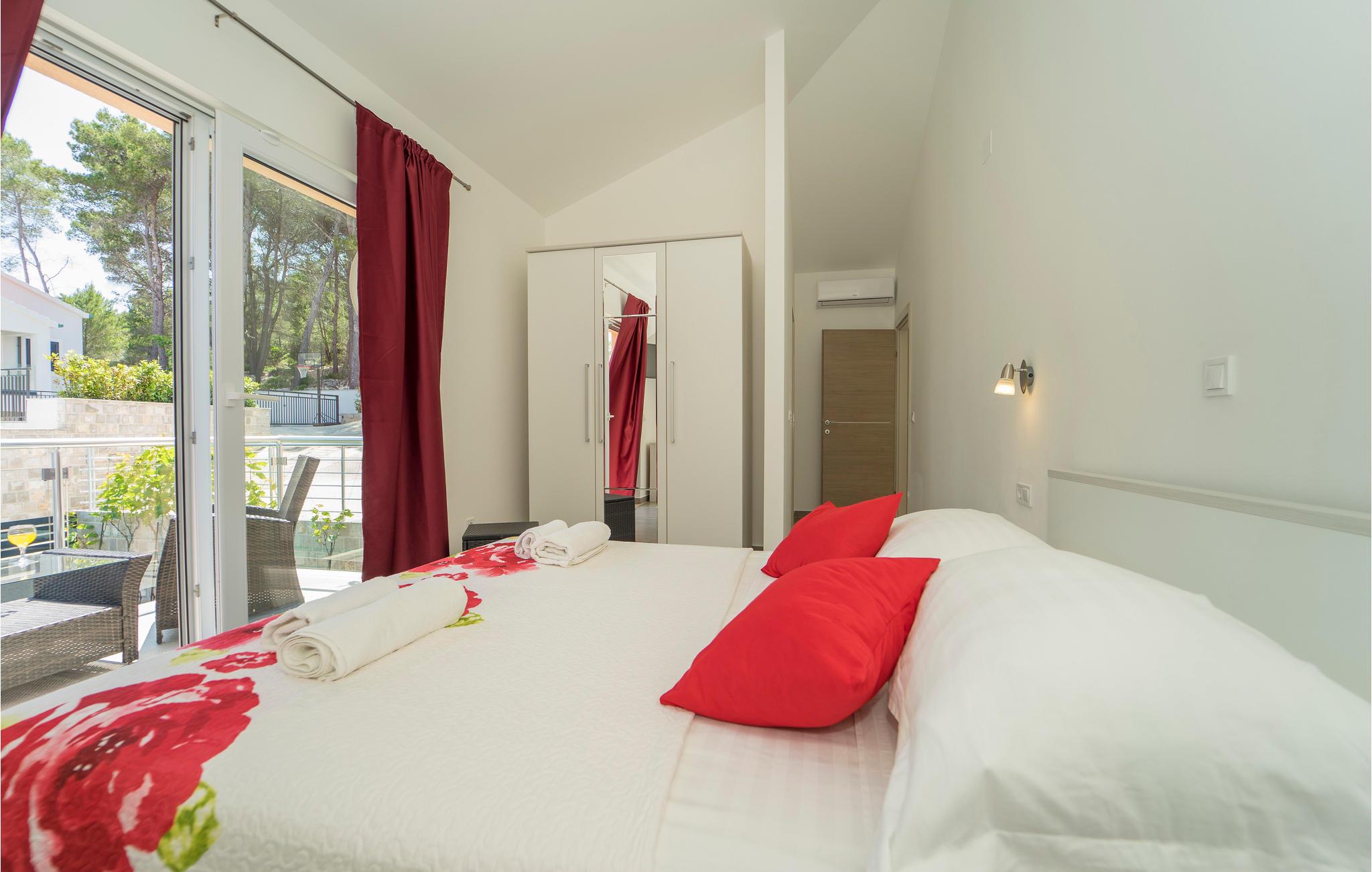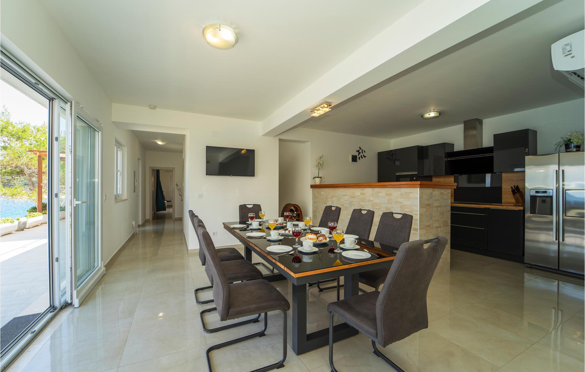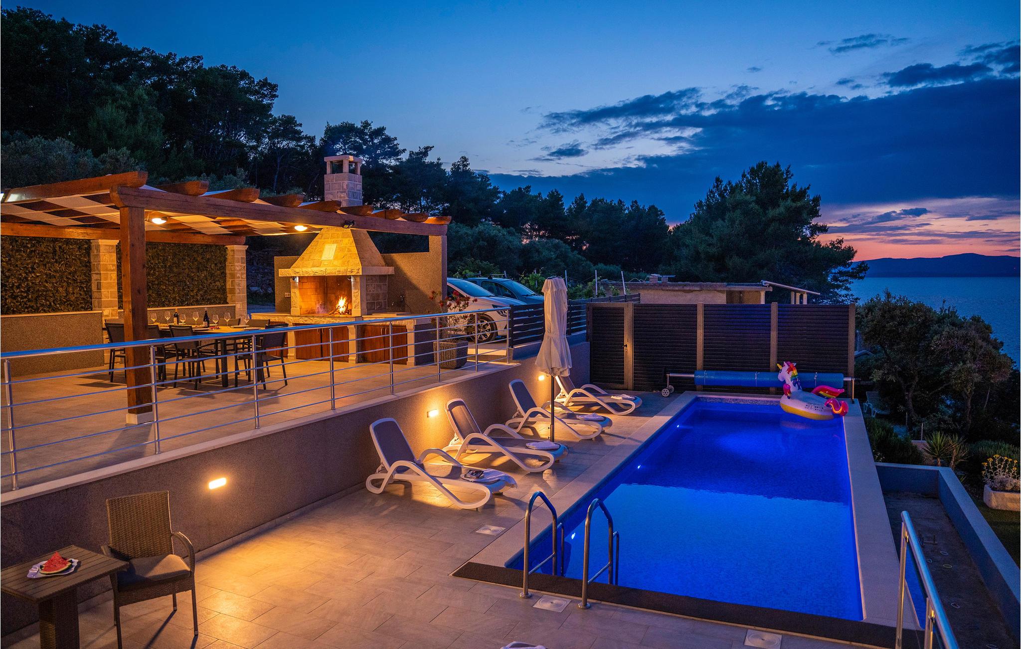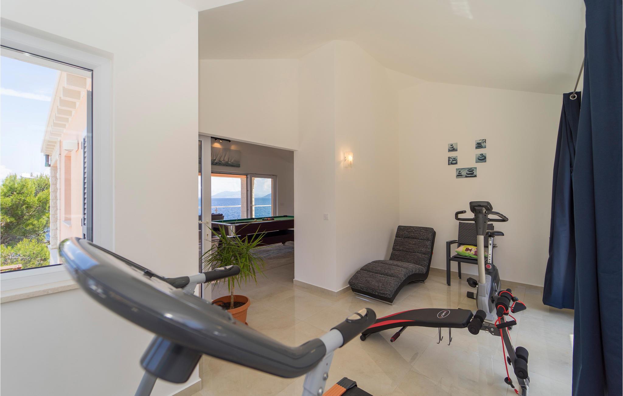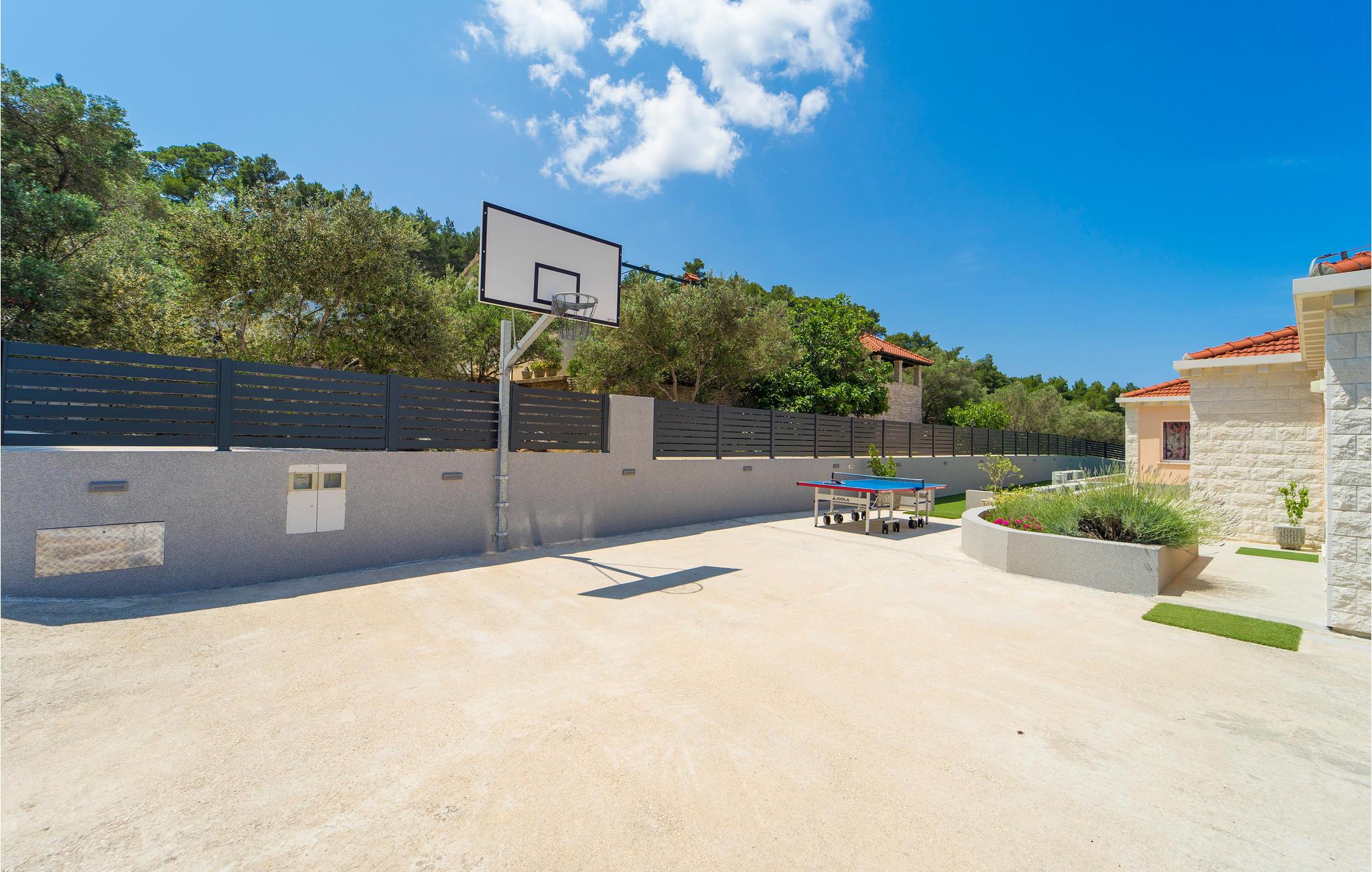 Tilbring jeres ferie i Middeldalmatien, på den fabelagtige ø Korcula, som I kan nå fra fastlandet fra færgehavnene i f.eks. Split eller Dubrovnik. Dette moderne feriehus med fantastisk beliggenhed ved havet, er jeres chance for en helt unik oplevelse. De rummelige værelser er stilfuldt indrettet og med al udstyr for en hyggelig ferie. Huset byder komfort med 4 soveværelser, en åben opholdsstue og 4 badeværelser. Der er et rum med videospil og der er også et fitnessrum til rådighed. Nud den dejlige panoramaudsigt, mens I bader i poolen, eller forbereder en romantisk middag på terassen med grill. Feriehuset er børnevenligt og perfekt egnet til en ferie med hele familien. Til de mindste er der en stor sandkasse, en rutsjebane og en gynge. Vi er sikker på, at I vil tage mange dejlige billeder med hjem herfra, af selskaber ved poolen eller ved grillen, dage ved havet, konkurrencerne i bordtennis eller billard og måske frisk fanget fisk. Udenfor denne oase er øen Korcula det perfekte sted for at gå på opdagelse i naturen, restauranterne og nattelivet. Betagende landskab med skøn natur og det behagelige mediterrane klima venter jer her og gør, at I virkelig kan slappe af. Oplev duften af pinjeskoven og nyd den mediterrane atmosfære. Besøg også de andre byer på øen, såsom Blato, Vela Luka eller den lille by Prigradica. Byen Korpula er den verdenskendte opdagelsesrejsende og sømand Marco Polos fødested, derfor er der et Marco Polo museum i byen. 300 m grusvej fører til huset.