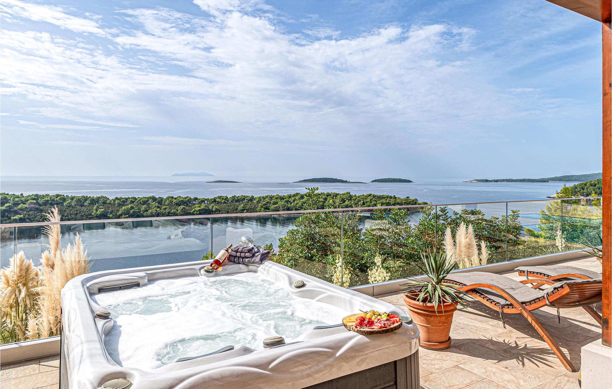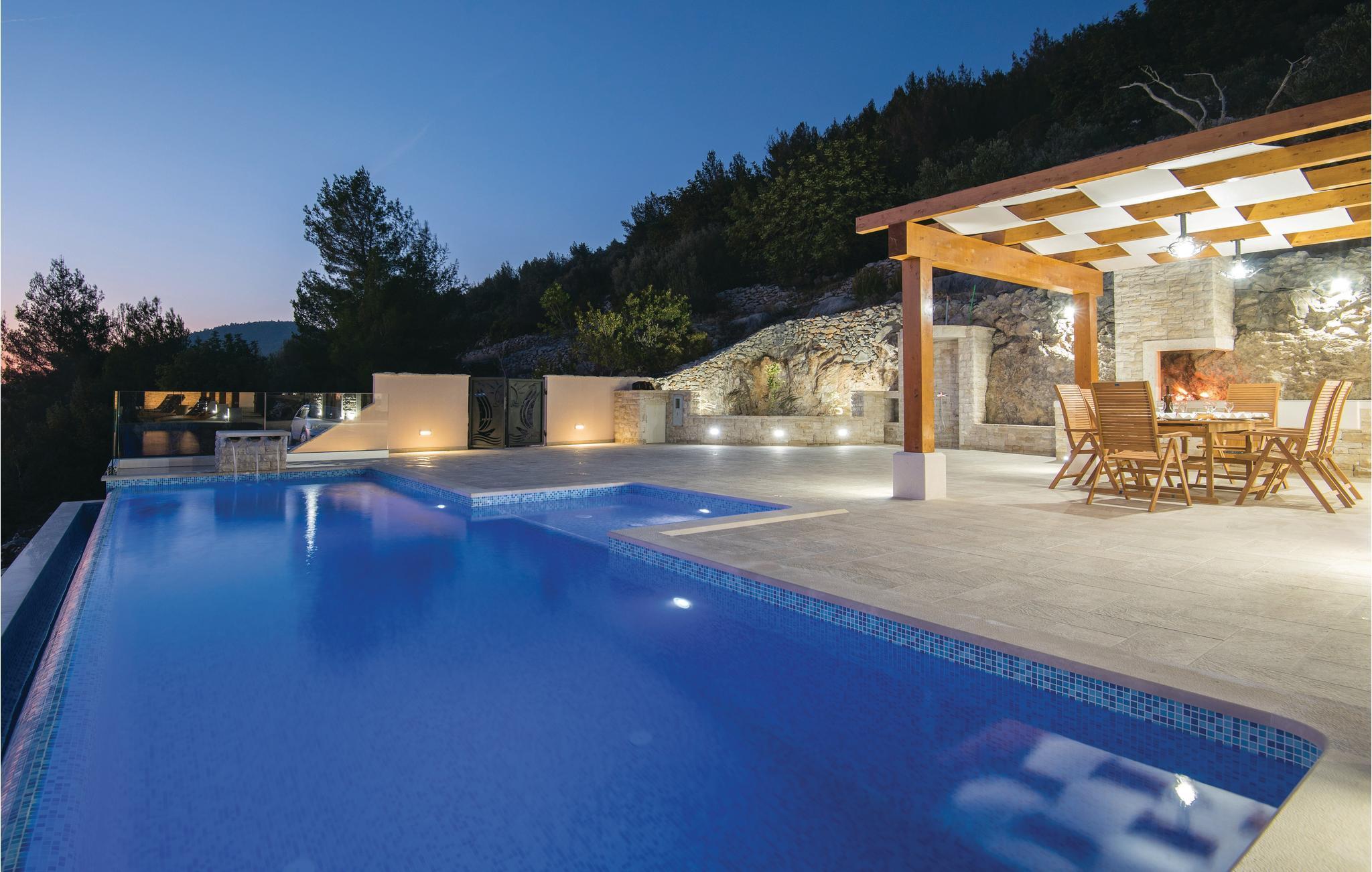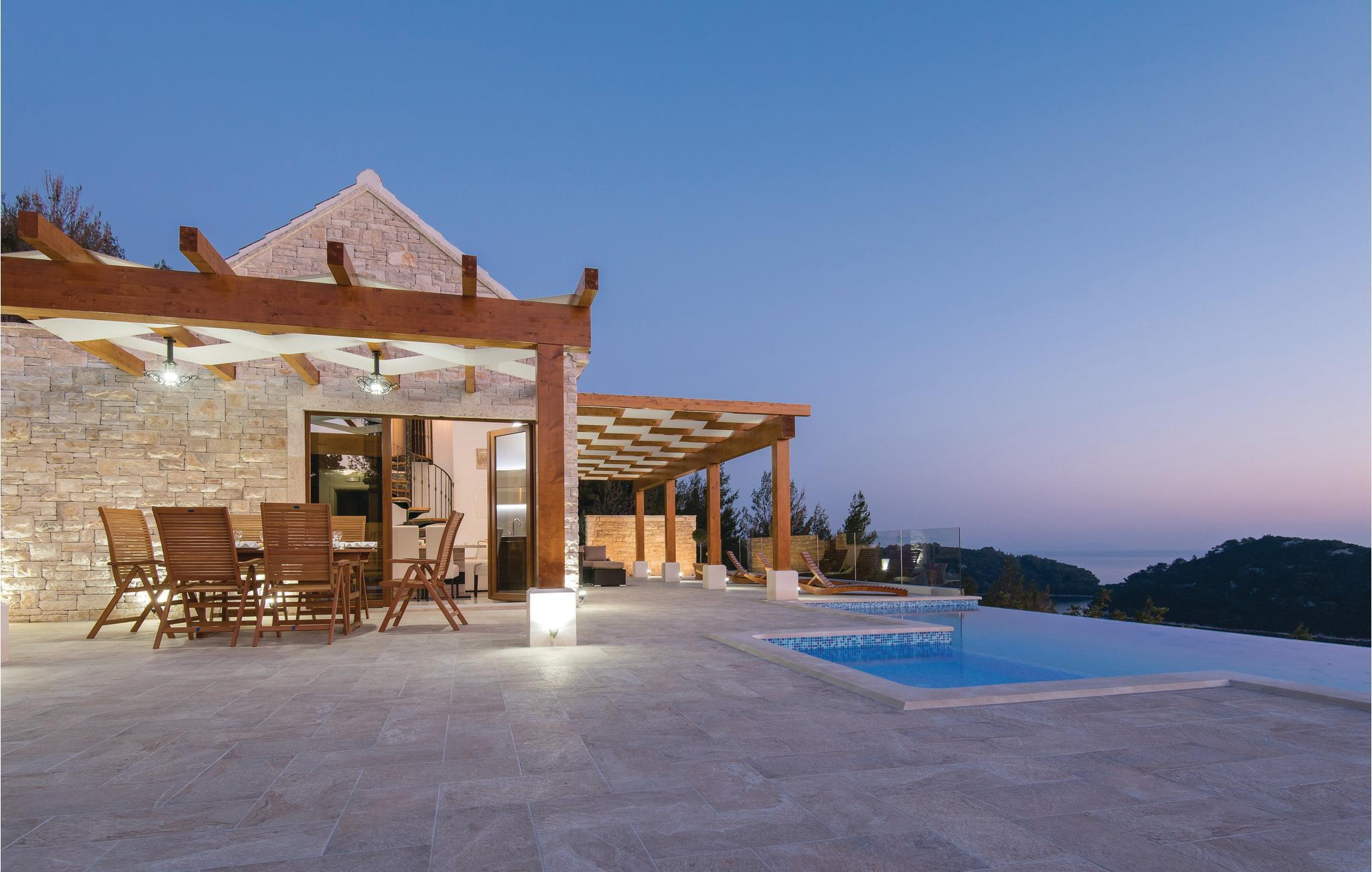 På en bakketop over den skønne Karbunibugt ligger dette feriehus. Det er omgivet af en skøn og uberørt natur og herfra er der en skøn panoramaudsigt over havet og naboøerne. Huset er indrettet meget moderne og rustikt i en charmerende blanding. I stueplan ligger køkkenet i åben forbindelse med køkkenet og et soveværelse med badeværelse en suite. Der er også et soveværelse og et badeværelse i et galleri, som I kommer op til ad en vindeltrappe. I haven ligger den rummelige terrasse og en pool med en børneafdeling. Udforsk byen på dagsture til de nærliggende byer Vela Luka, Blato og Prigradica hvor I kan lære de lokale skikke at kende og lære mere om området interessante kultur og historie. De sidste 500 m op til huset er en grusvej, der ikke er egnet til lave biler. De sidste 150 meter er med fliser.