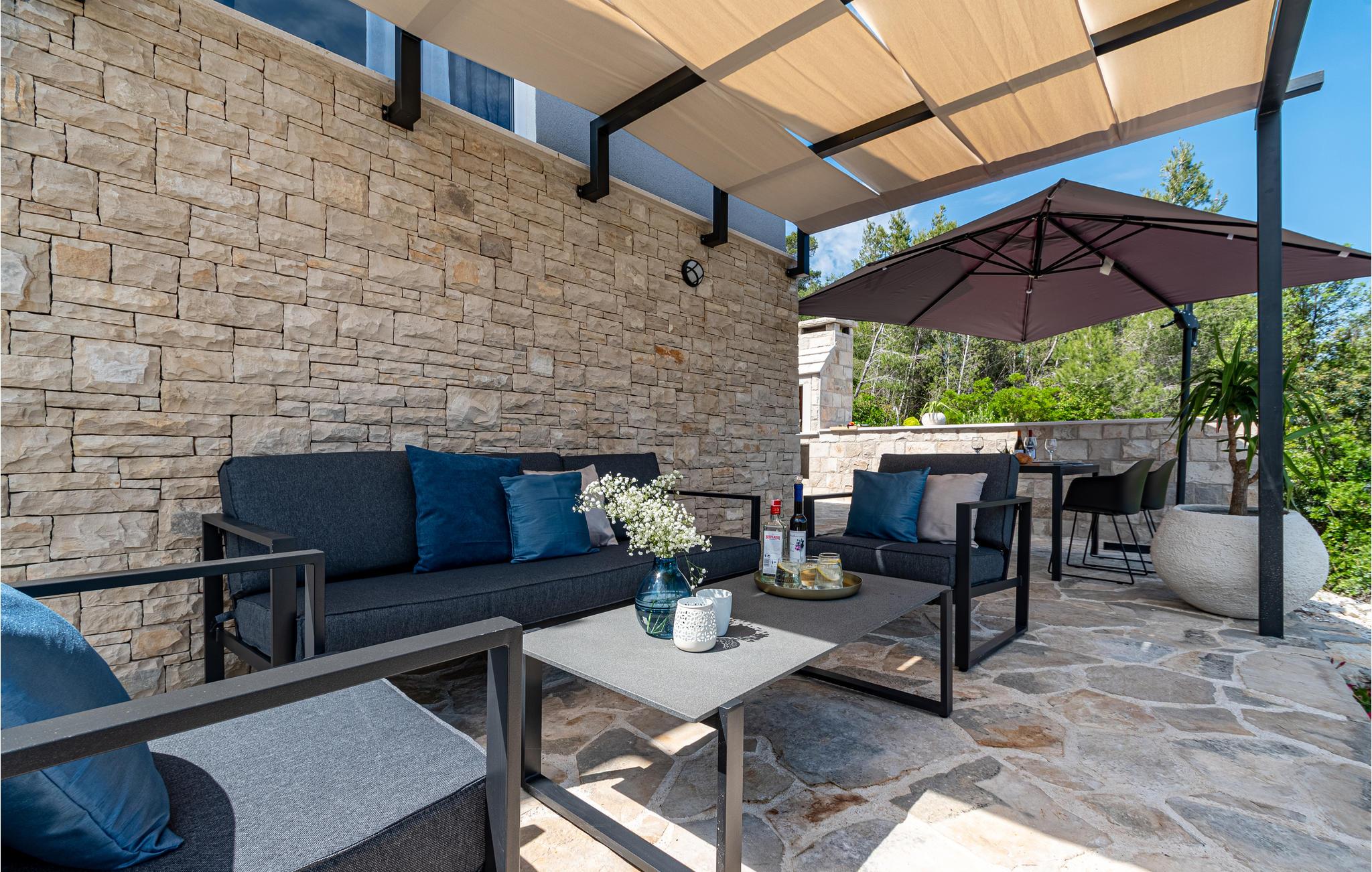 Alt er klar i sommerhuset til en behagelig udendørs tid. Vælg mellem to åbne og overdækkede terrasser, tilbered et lækkert måltid på stengrillen og slap af i behagelige liggestole.
