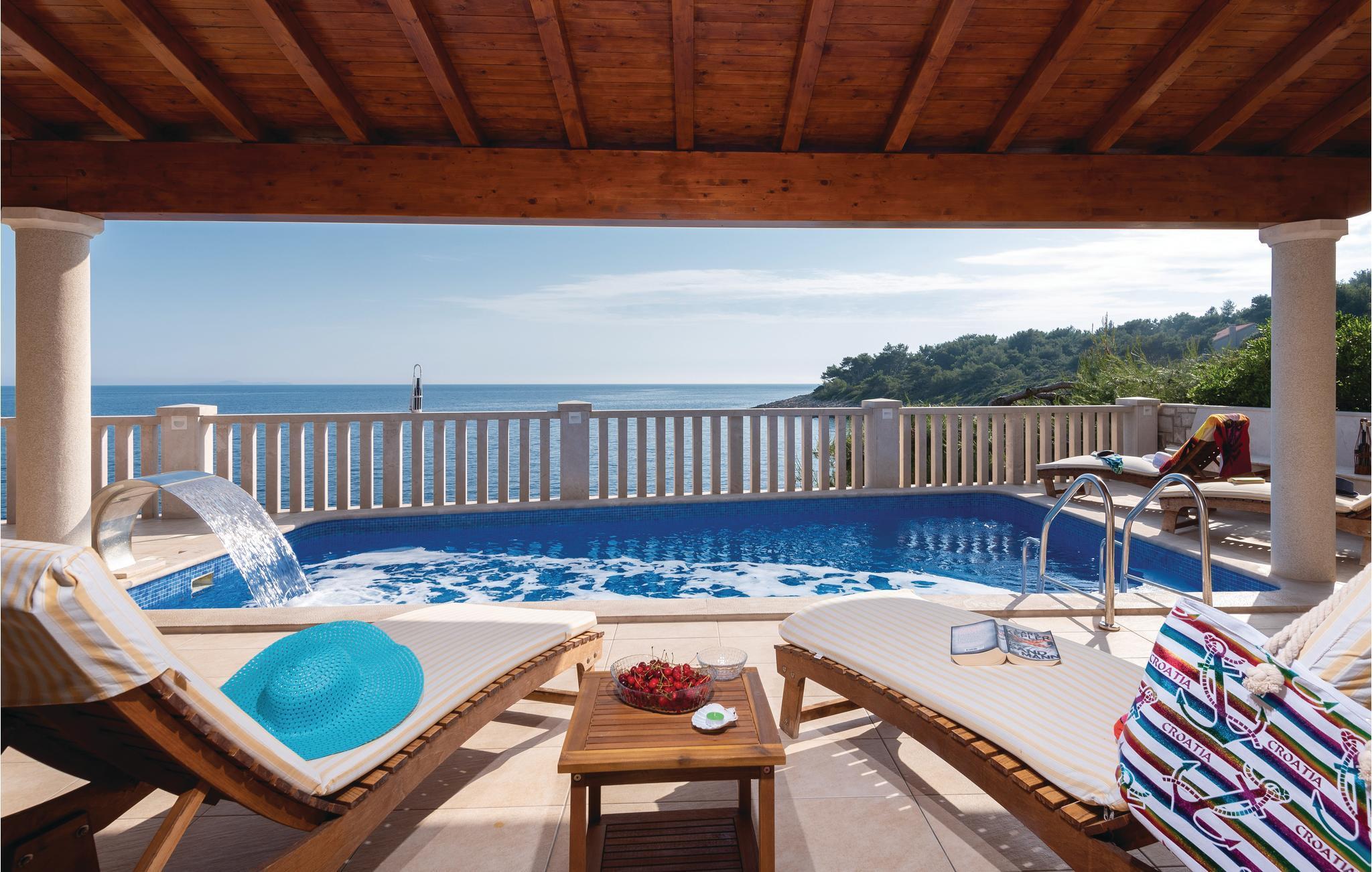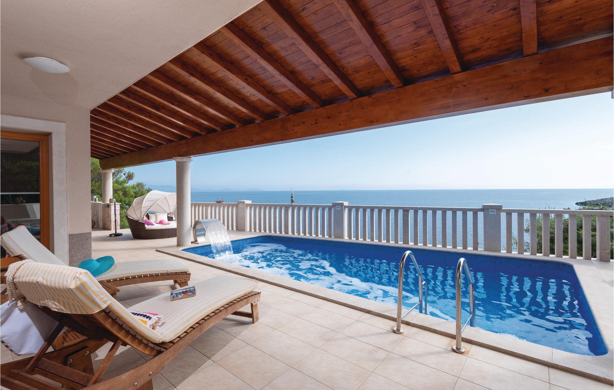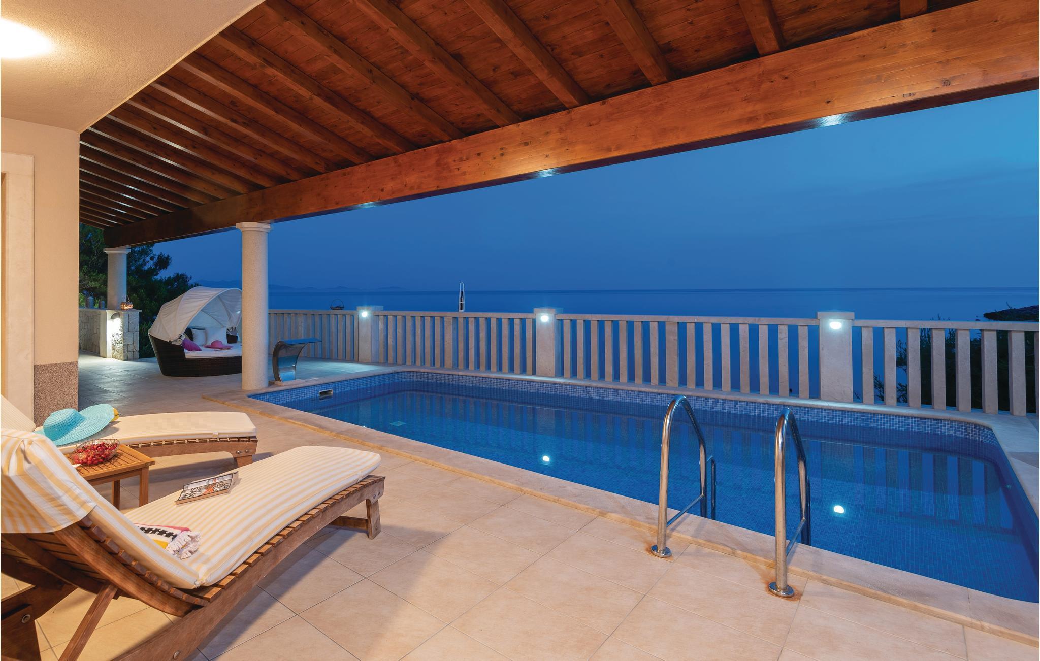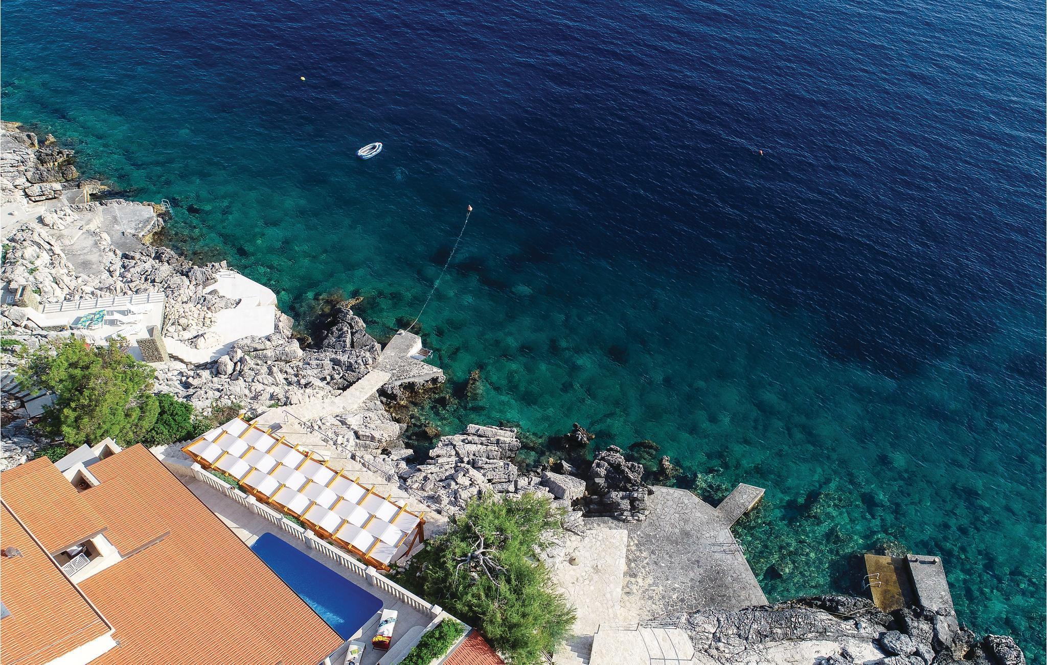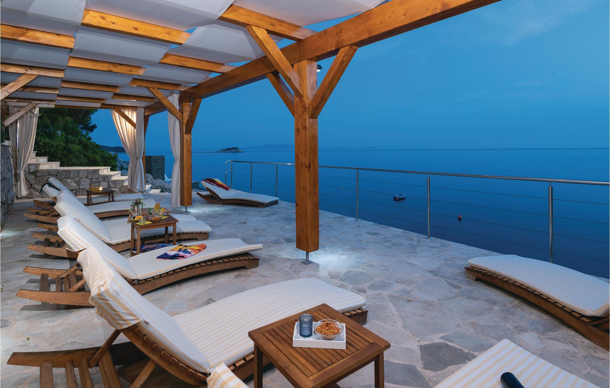 Et par trapper fører fra havet op til den skønne stenterrasse med parasoller og liggestole, hvorfra der er panoramaudsigt til et af de skønneste øhav i Adriaterhavet. Andre trapper fører jer til terrassen med saltvandspool, hvor I sandsynligvis vil tilbringe mest tid for at flygte for sommerheden. Spillerummet med et billardbord, bordfodbold og to computere med internettilslutning ligger lige i forlængelse af denne terrasse. Ved siden af ligger der et rum med whirlpool, hvor I kan slappe af og simpelt hen nyde den skønne udsigt over havet. Rummet ved siden af spillerummet er velegnet til venner af den aktive ferie, da der her er en finsk sauna og fitnessudstyr. Fra hvert værelse har I en skøn udsigt til havet. Indvendige trapper fører op til 1. sal, hvor der er et rummeligt køkken, spisestue og dagligstue med direkte adgang til den overdækkede terrasse med bord og kamingrill. Her kan I nyde aftenen, mens I nipper til jeres yndlingsdrink og fortæller hinanden om dagen begivenheder. På samme etage ligger der to soveværelser med separate badeværelser. På 2. sal er der tre luksuøse soveværelser til, hvert med eget bad og terrasse. Det helt rigtige til den afslappende ferie. Nyd det!