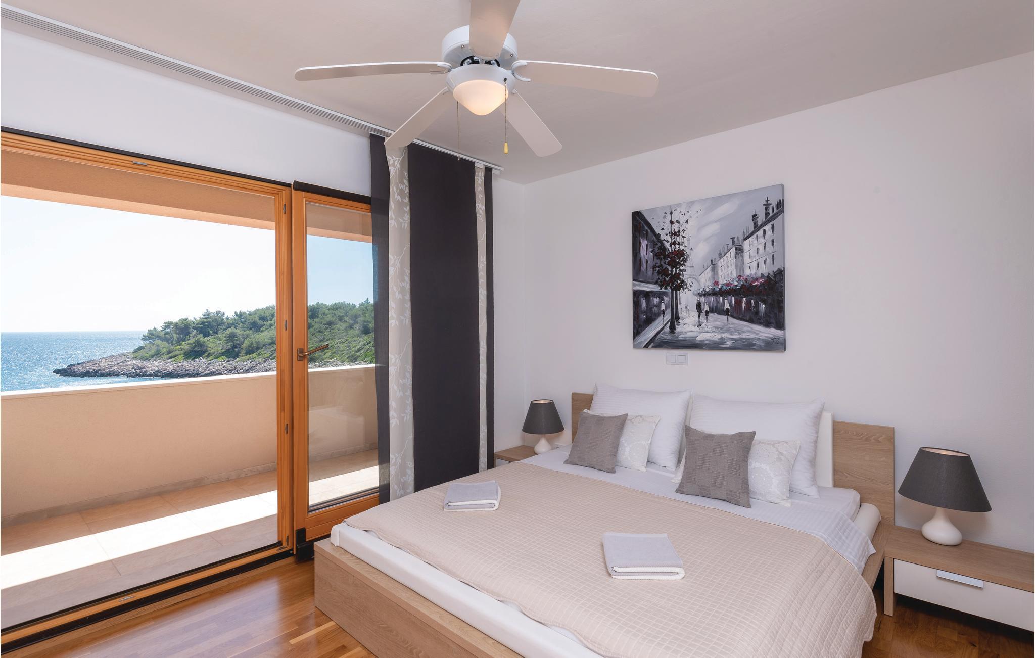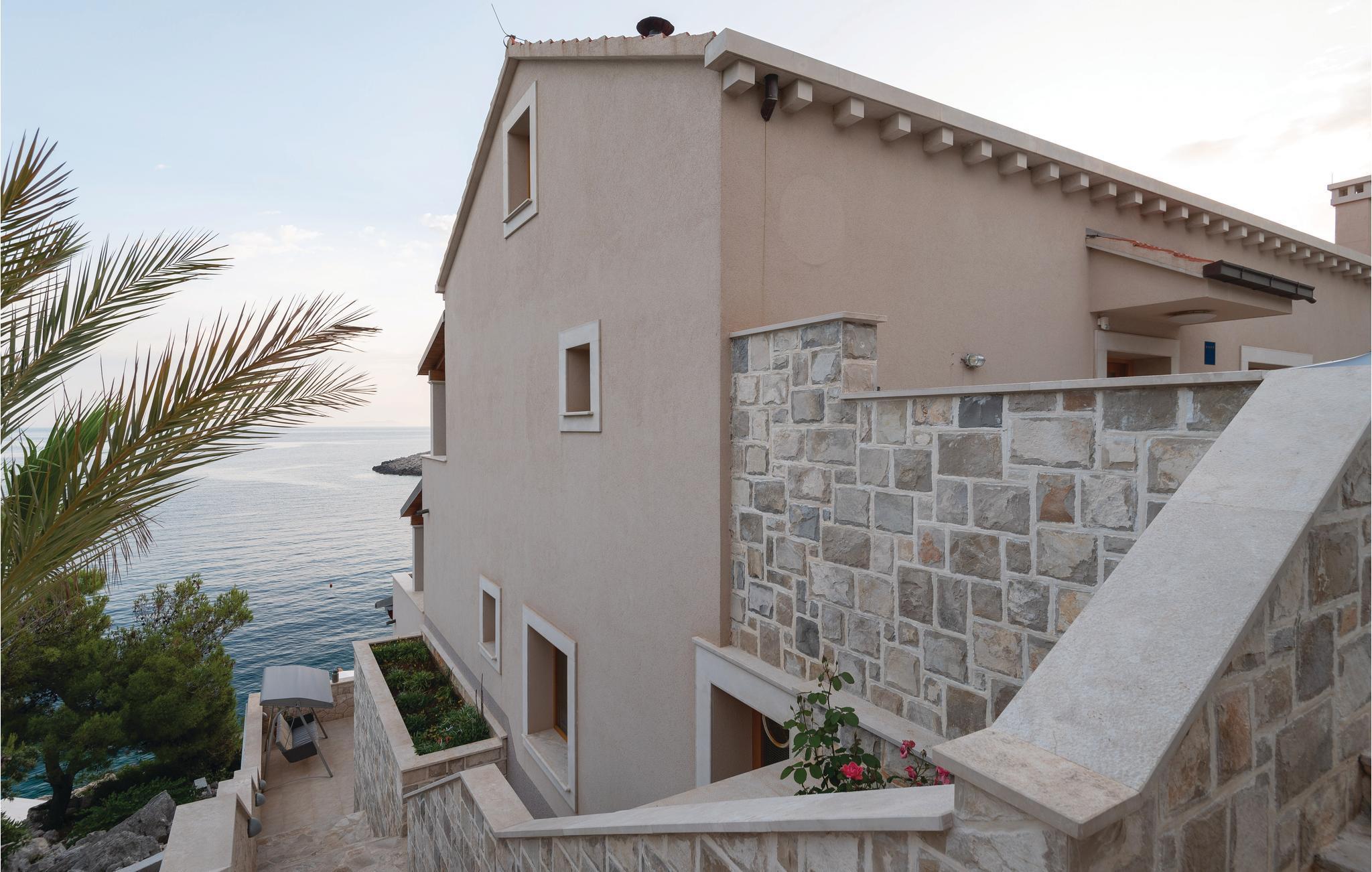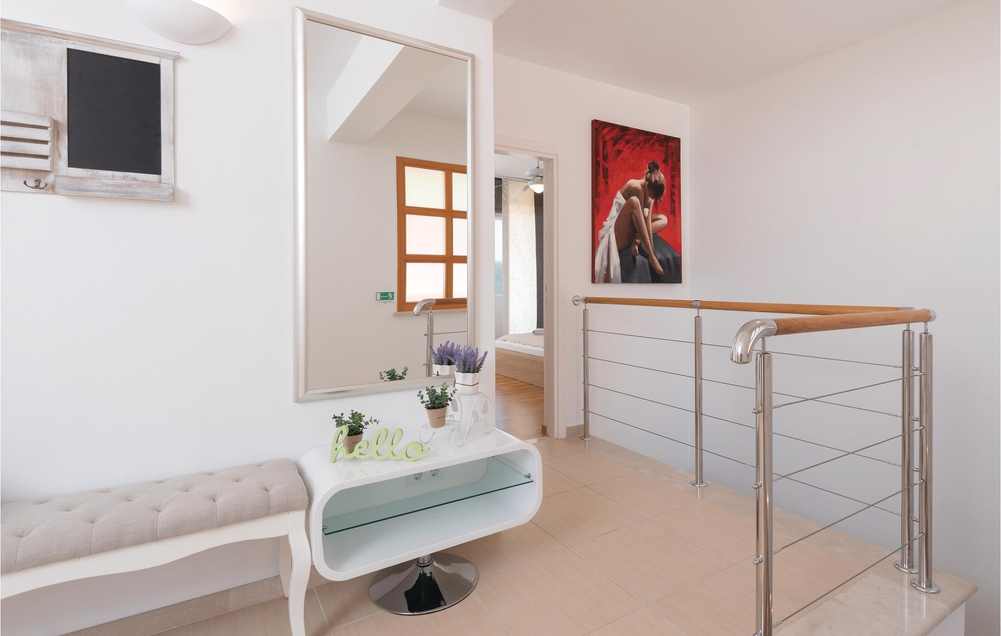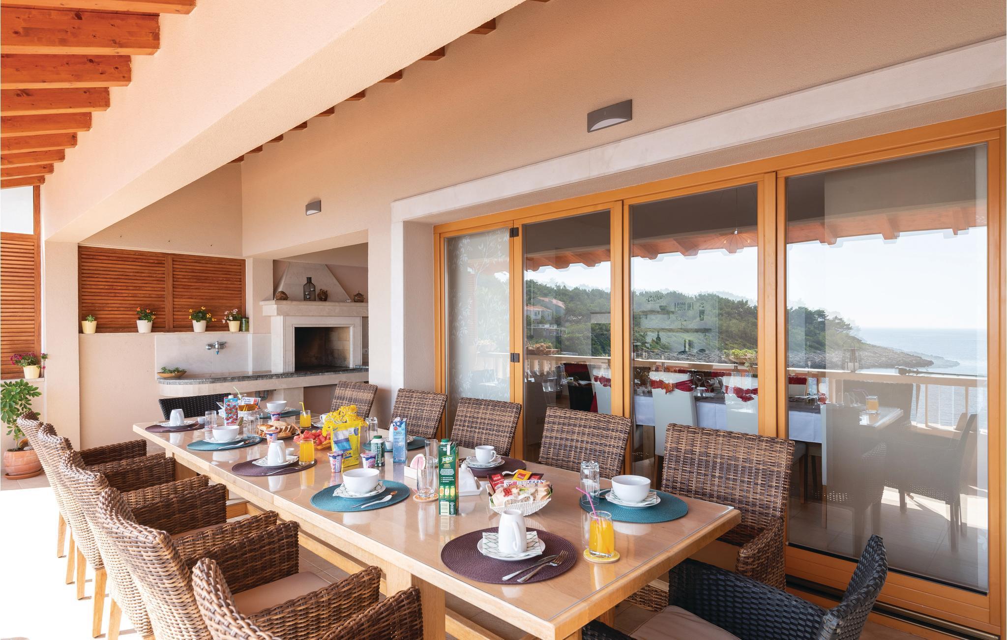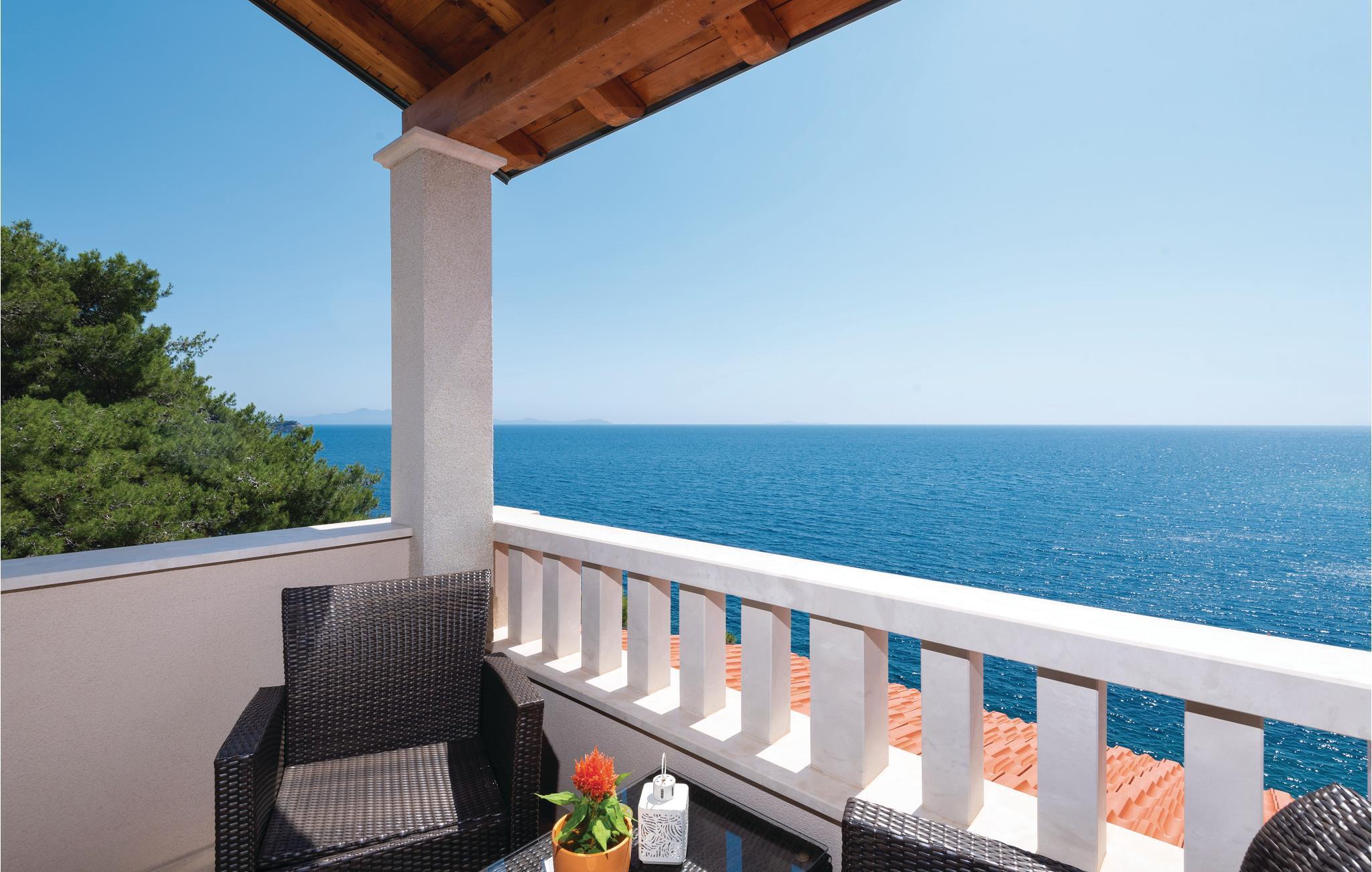 Et par trapper fører fra havet op til den skønne stenterrasse med parasoller og liggestole, hvorfra der er panoramaudsigt til et af de skønneste øhav i Adriaterhavet. Andre trapper fører jer til terrassen med saltvandspool, hvor I sandsynligvis vil tilbringe mest tid for at flygte for sommerheden. Spillerummet med et billardbord, bordfodbold og to computere med internettilslutning ligger lige i forlængelse af denne terrasse. Ved siden af ligger der et rum med whirlpool, hvor I kan slappe af og simpelt hen nyde den skønne udsigt over havet. Rummet ved siden af spillerummet er velegnet til venner af den aktive ferie, da der her er en finsk sauna og fitnessudstyr. Fra hvert værelse har I en skøn udsigt til havet. Indvendige trapper fører op til 1. sal, hvor der er et rummeligt køkken, spisestue og dagligstue med direkte adgang til den overdækkede terrasse med bord og kamingrill. Her kan I nyde aftenen, mens I nipper til jeres yndlingsdrink og fortæller hinanden om dagen begivenheder. På samme etage ligger der to soveværelser med separate badeværelser. På 2. sal er der tre luksuøse soveværelser til, hvert med eget bad og terrasse. Det helt rigtige til den afslappende ferie. Nyd det!