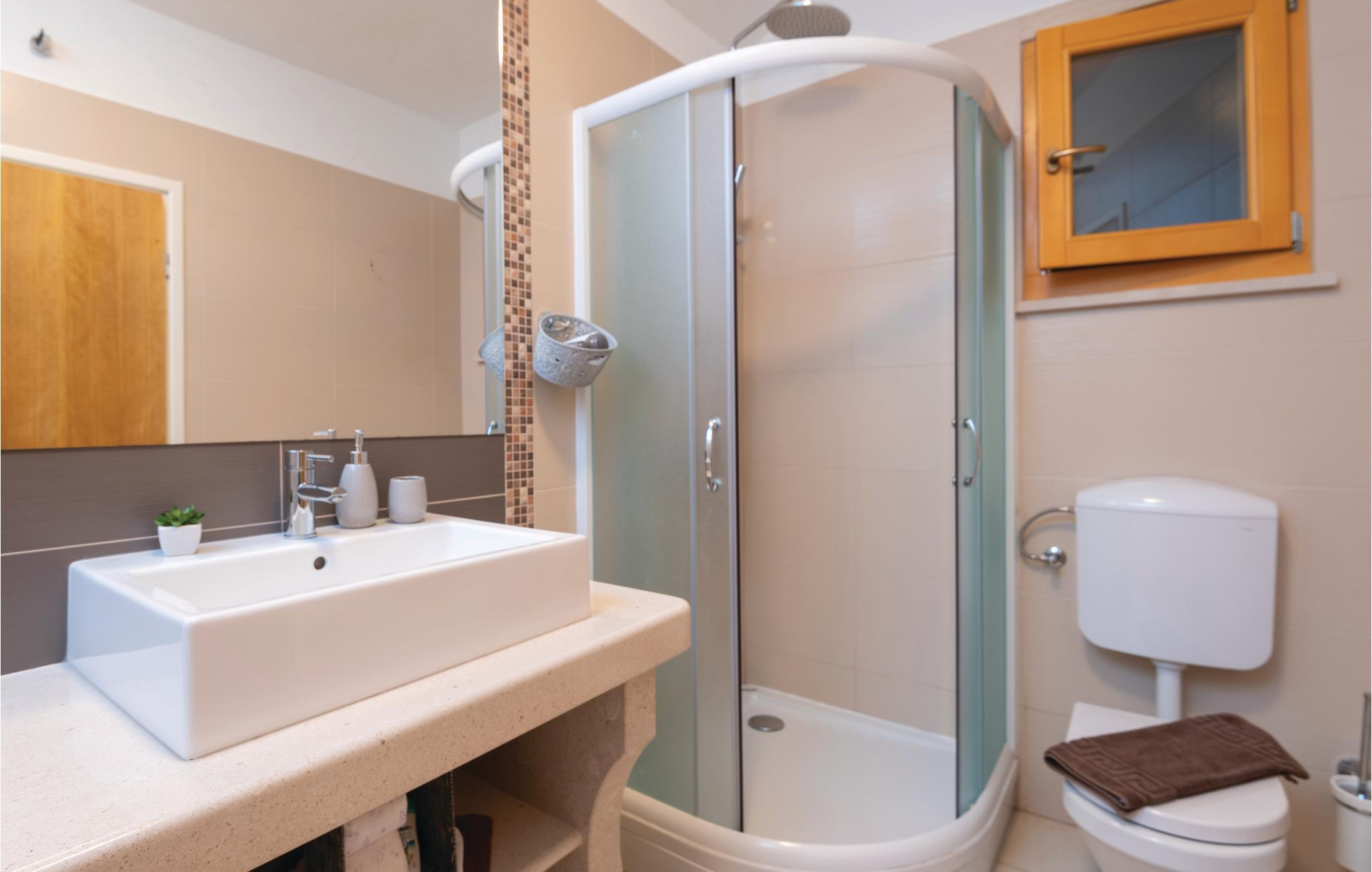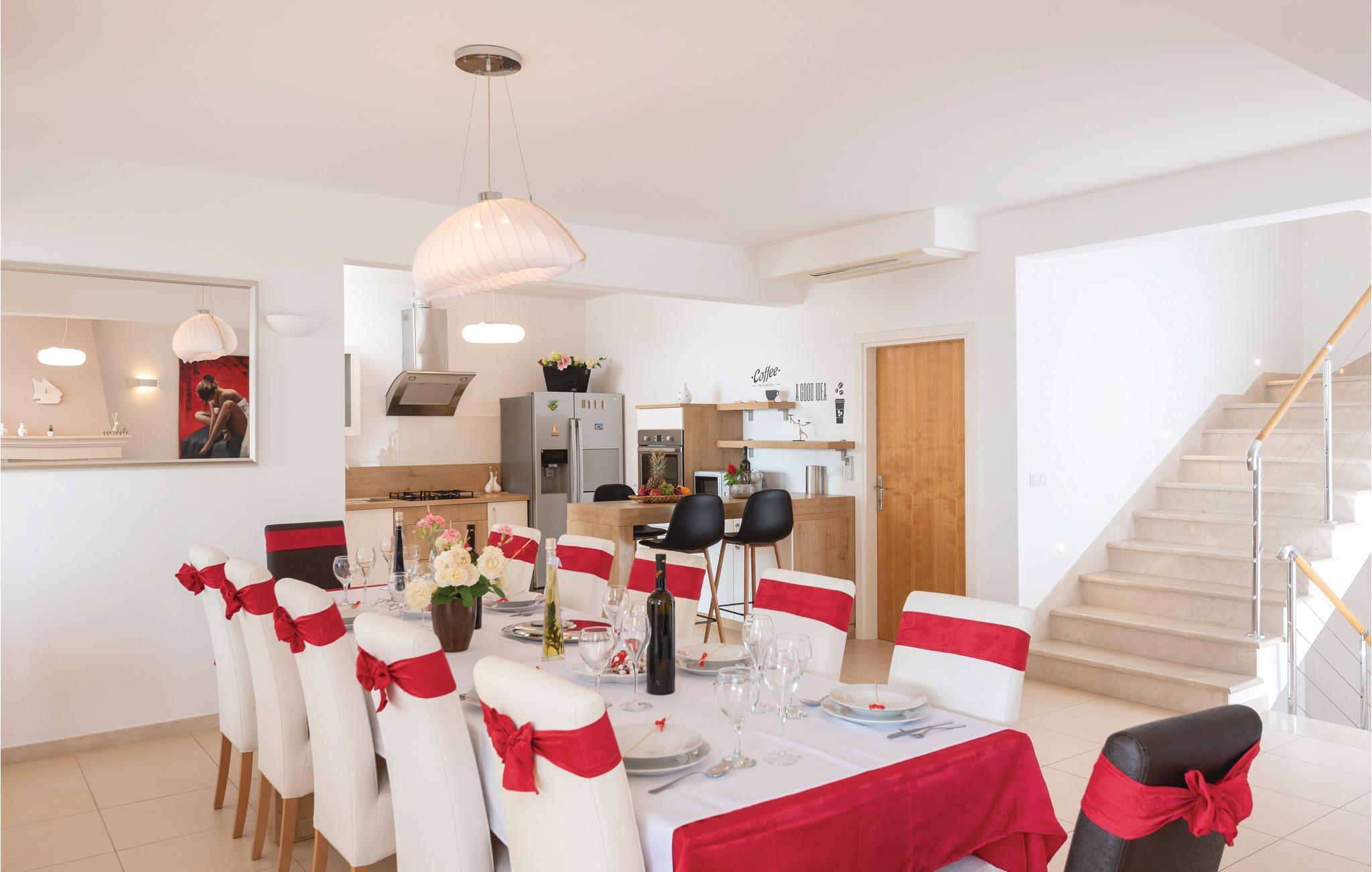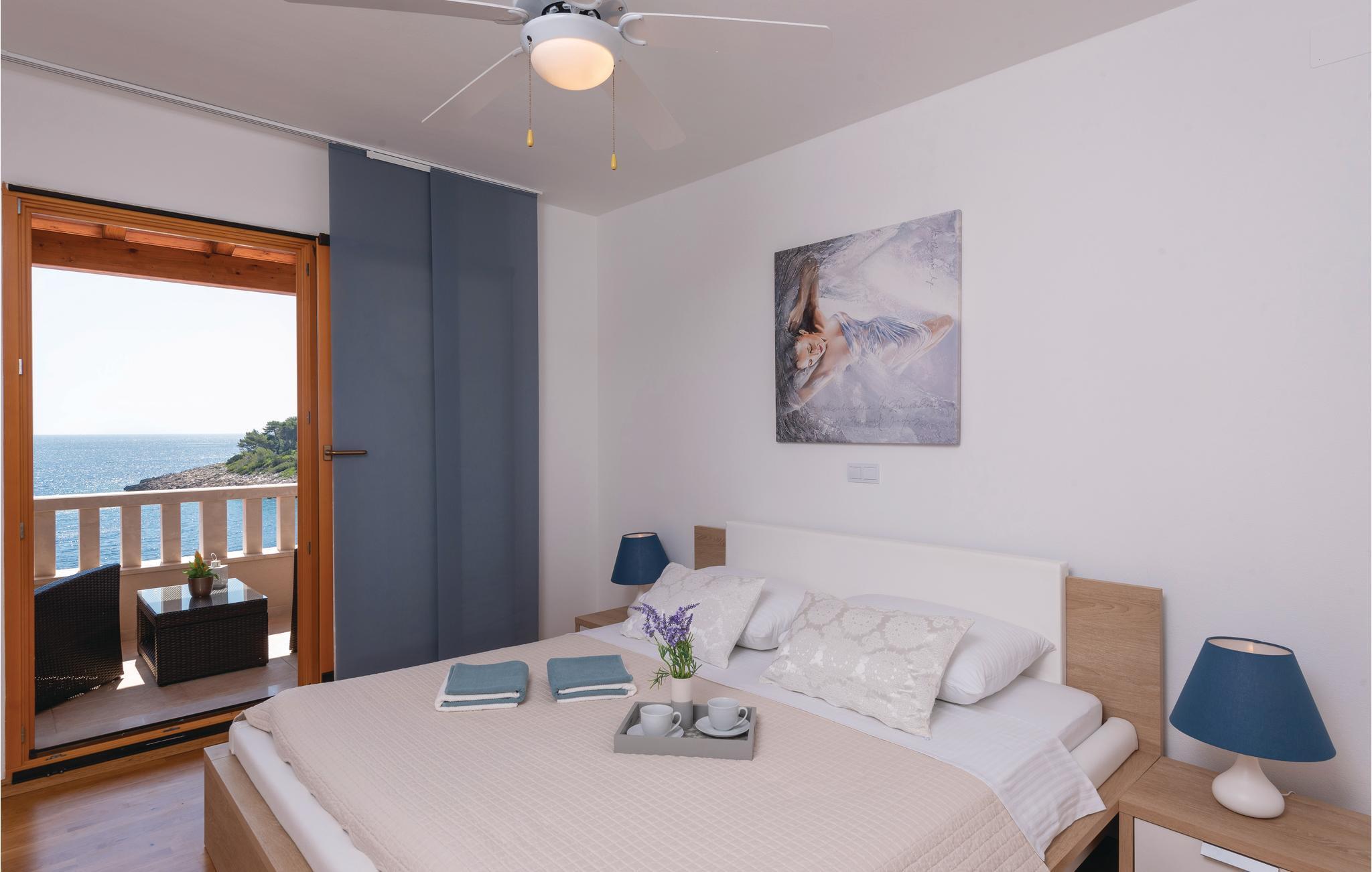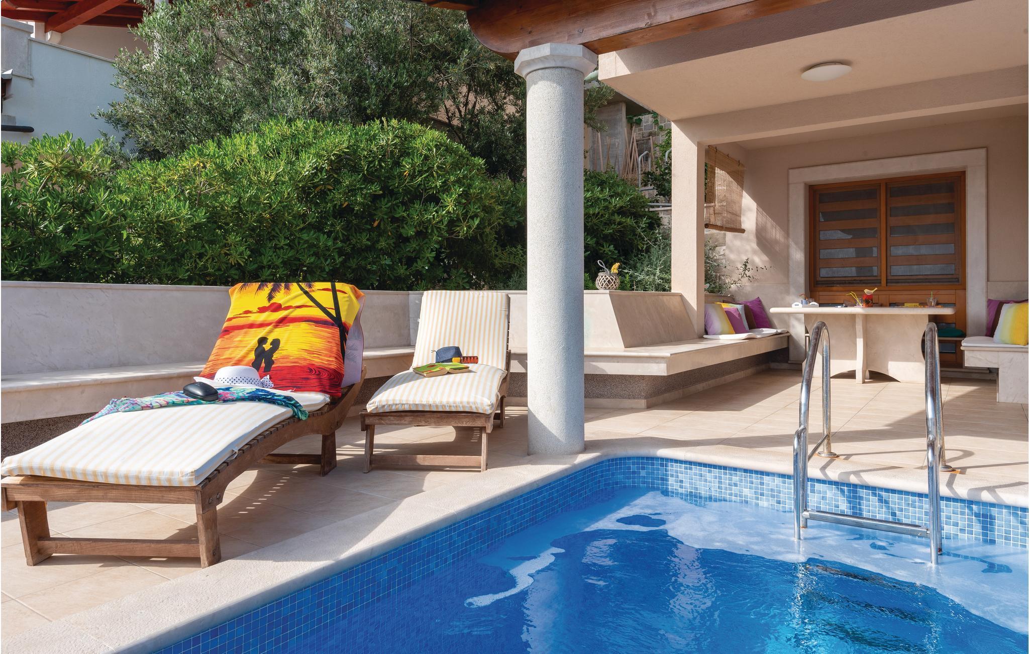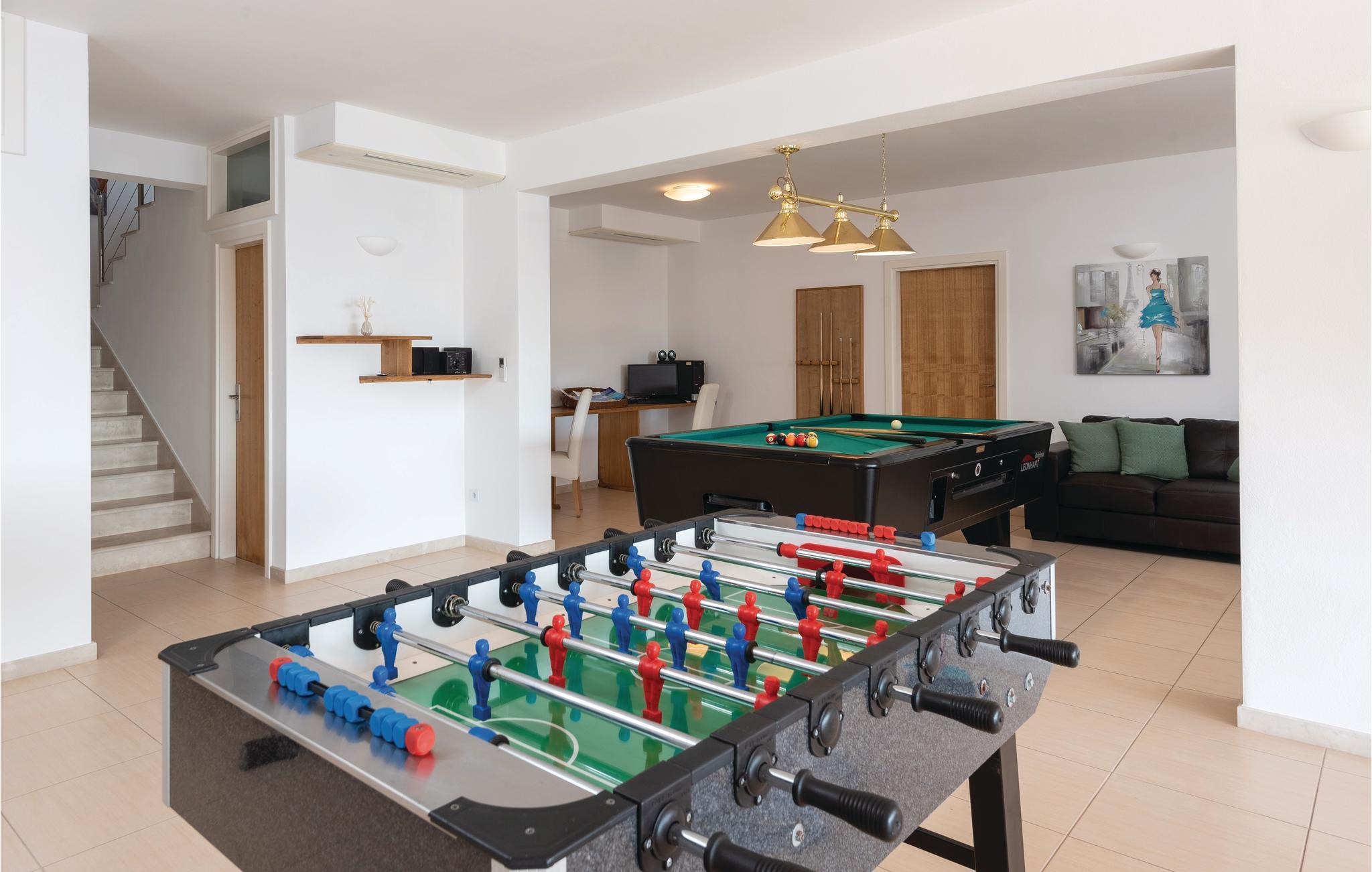 Et par trapper fører fra havet op til den skønne stenterrasse med parasoller og liggestole, hvorfra der er panoramaudsigt til et af de skønneste øhav i Adriaterhavet. Andre trapper fører jer til terrassen med saltvandspool, hvor I sandsynligvis vil tilbringe mest tid for at flygte for sommerheden. Spillerummet med et billardbord, bordfodbold og to computere med internettilslutning ligger lige i forlængelse af denne terrasse. Ved siden af ligger der et rum med whirlpool, hvor I kan slappe af og simpelt hen nyde den skønne udsigt over havet. Rummet ved siden af spillerummet er velegnet til venner af den aktive ferie, da der her er en finsk sauna og fitnessudstyr. Fra hvert værelse har I en skøn udsigt til havet. Indvendige trapper fører op til 1. sal, hvor der er et rummeligt køkken, spisestue og dagligstue med direkte adgang til den overdækkede terrasse med bord og kamingrill. Her kan I nyde aftenen, mens I nipper til jeres yndlingsdrink og fortæller hinanden om dagen begivenheder. På samme etage ligger der to soveværelser med separate badeværelser. På 2. sal er der tre luksuøse soveværelser til, hvert med eget bad og terrasse. Det helt rigtige til den afslappende ferie. Nyd det!