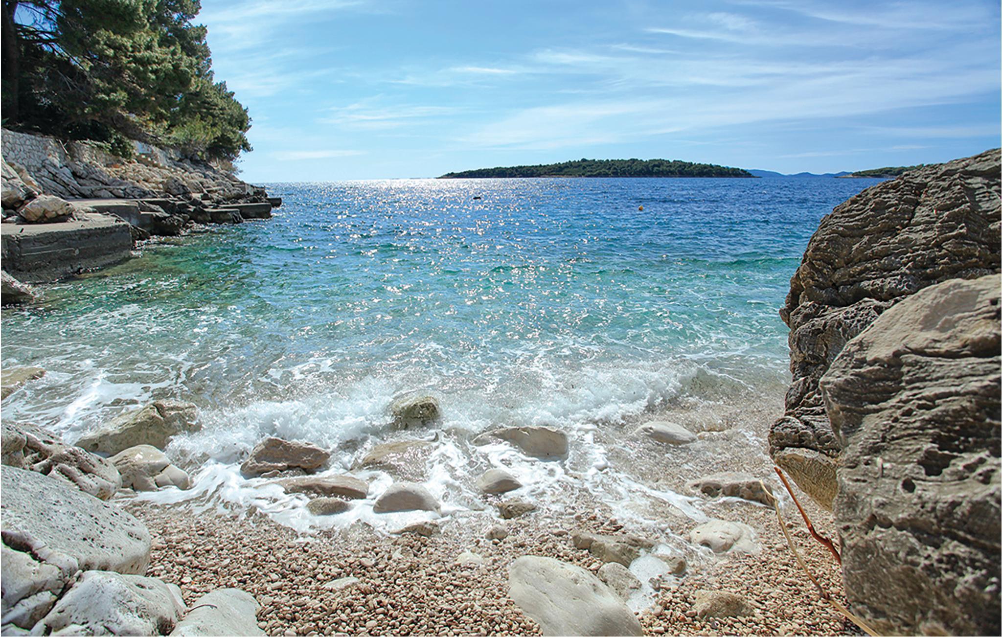 Når I vil have en dukkert i havet skal I blot gå få skridt for at nå over vejen og ned til en lille strand med plateau. Glæd jer til at hoppe i det klare vand og lade jer flyde på bølgerne.