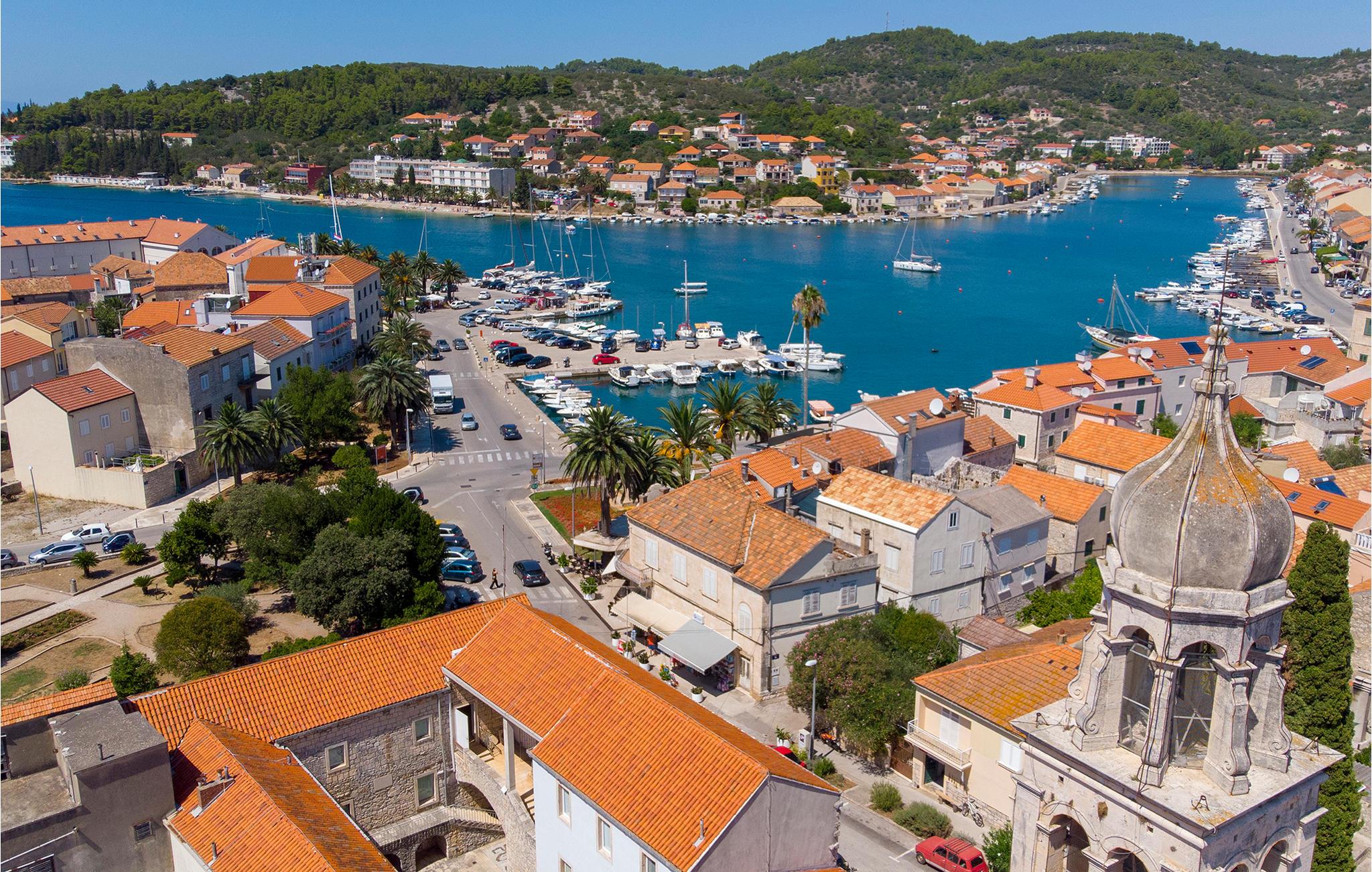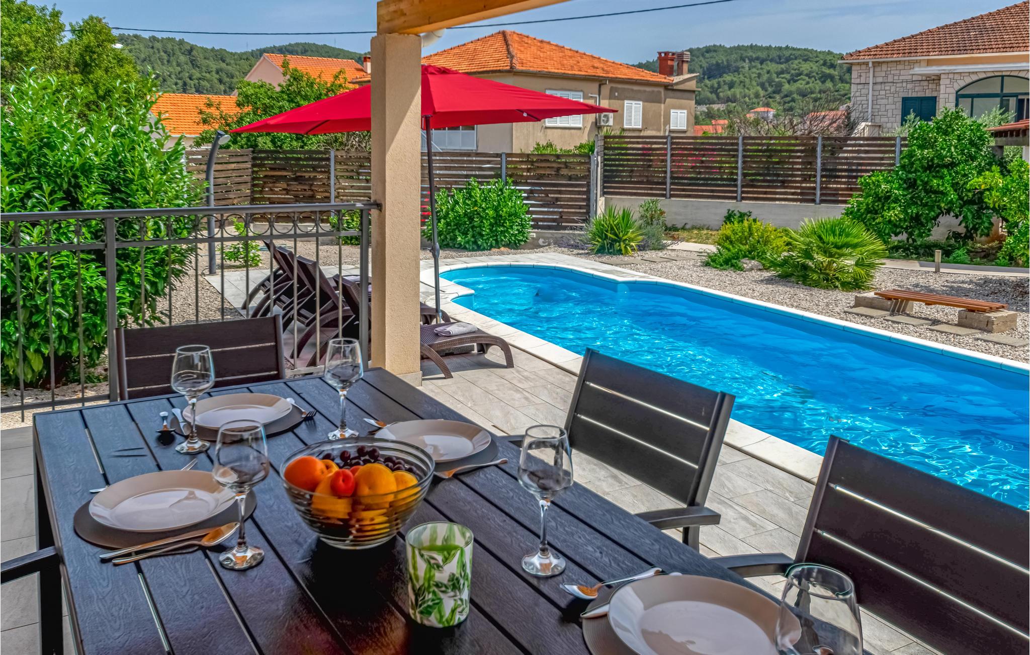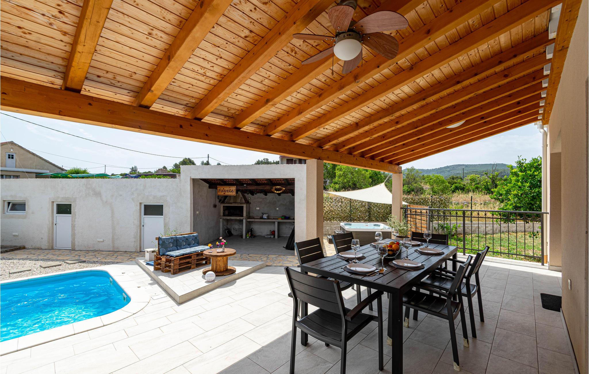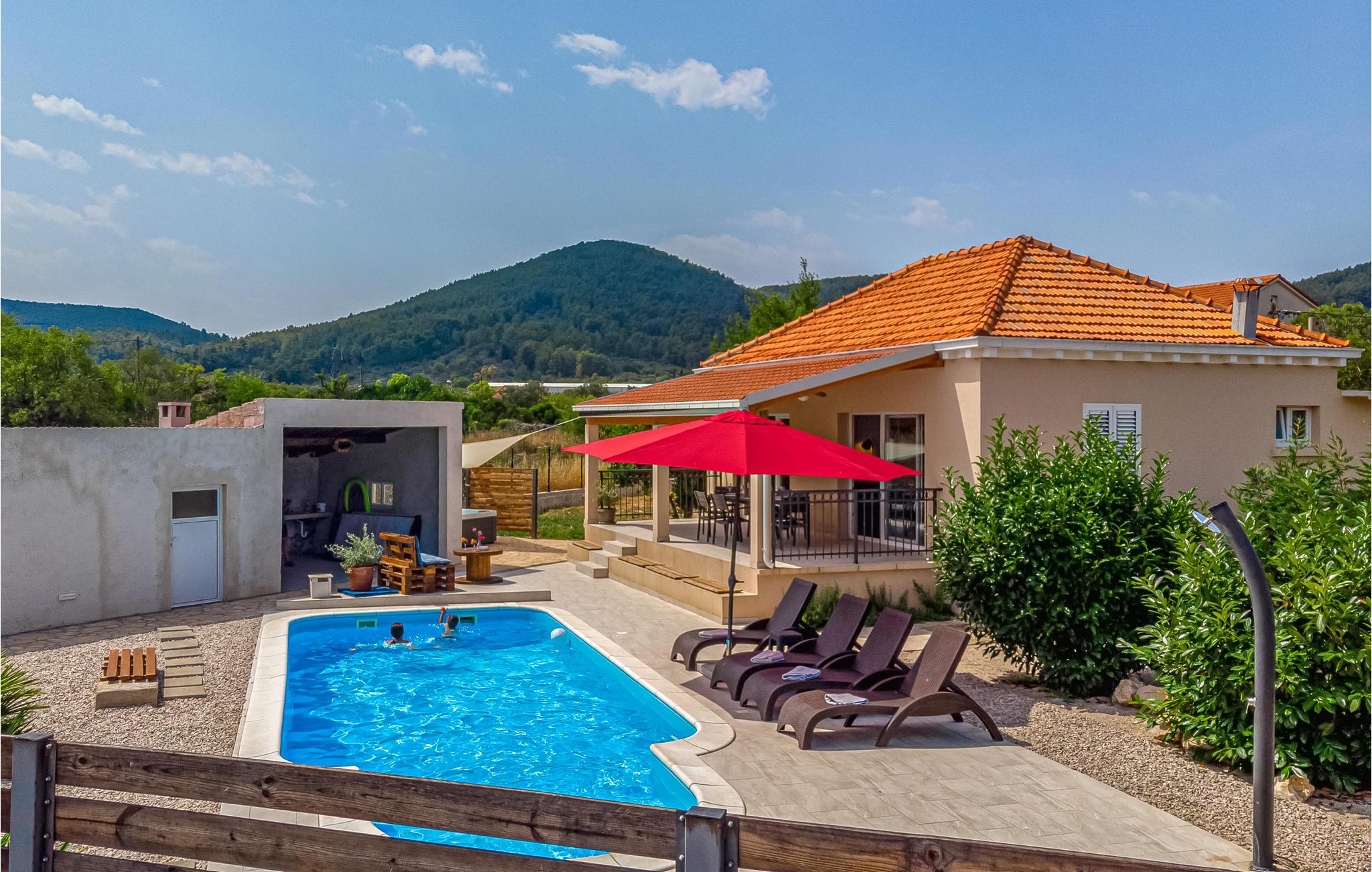 I en rolig bydel i Vela Luka ligger dette renoverede feriehus med pool. Det ligger på en velplejet og indhegnet grund der er velegnet hvis I har mindre børn med. Husets indre er enkelt og praktisk indrettet og lever om til nutidens krav til komfort. Fra stuen med køkken er der dør ud til den overdækkede terrasse, og derfra kun få skridt til afslapningsområde med pool, whirlpool og det udendørs køkken med grill. Der er kun 500 m til Vela Lukas centrum, hvor der er mange former for aktiviteter. I denne region kan I cykle, fiske, vandre og meget andet.