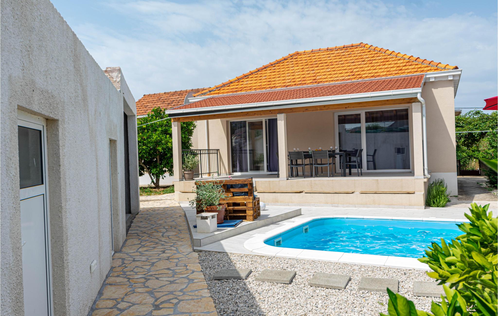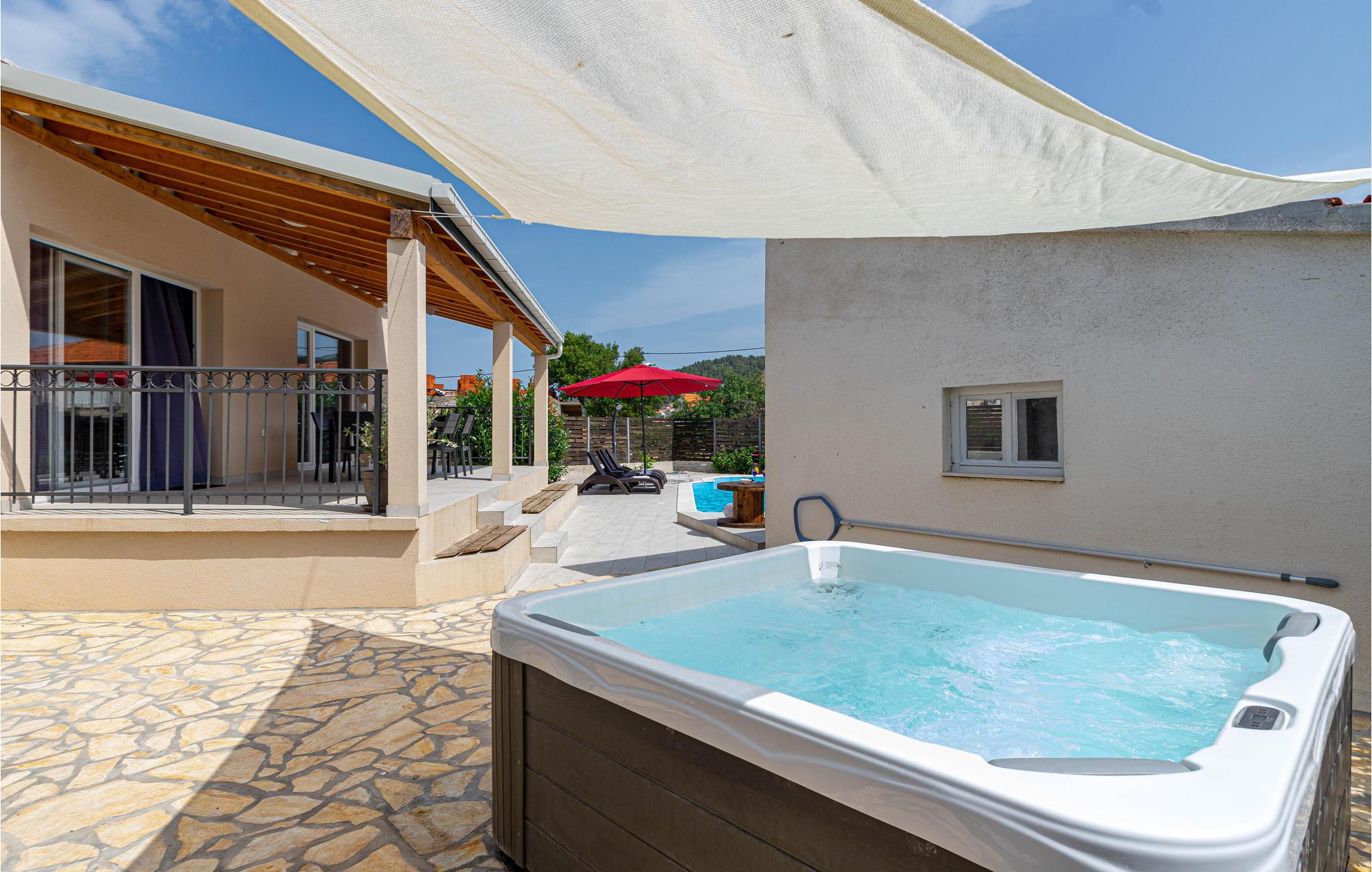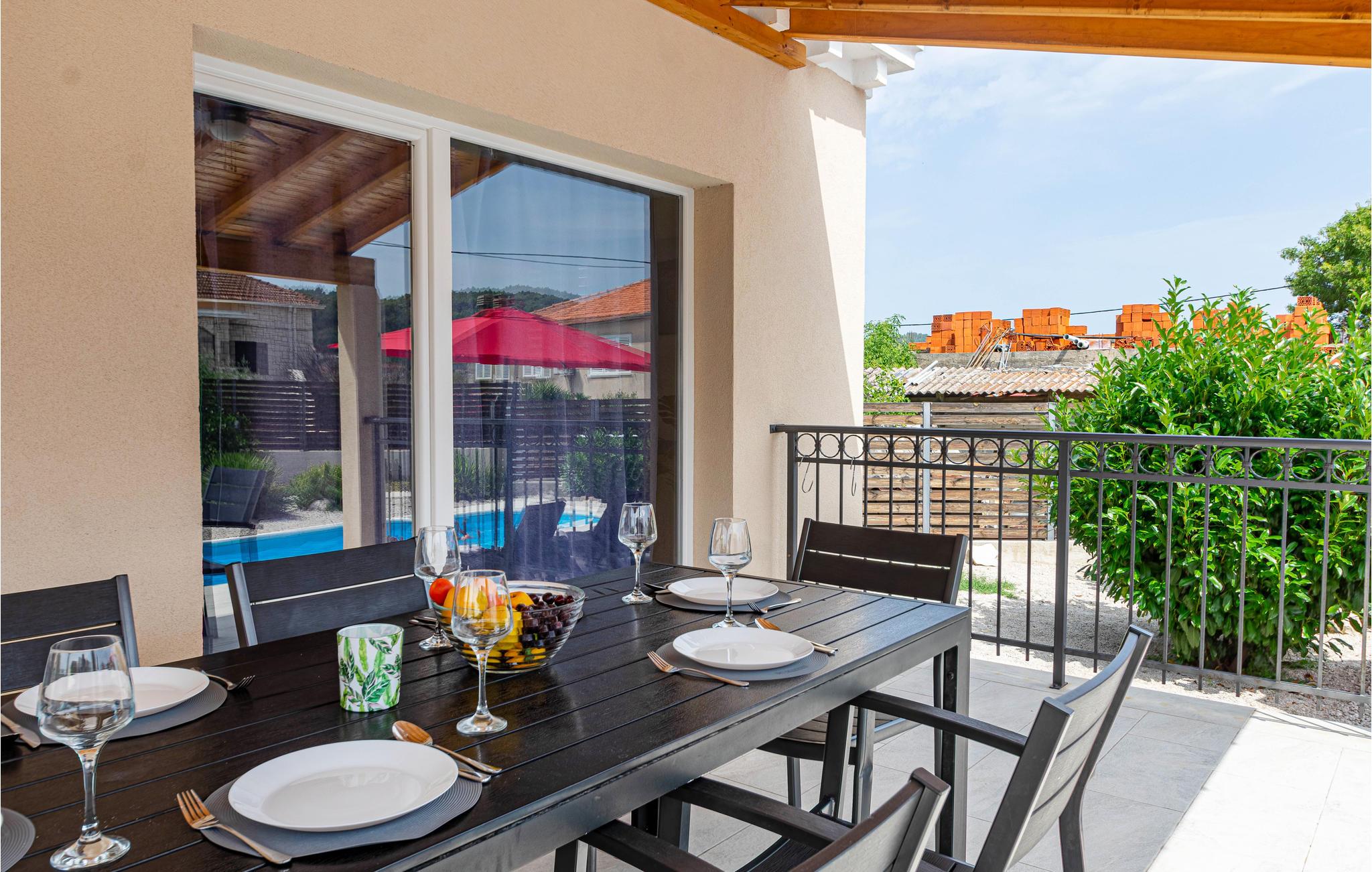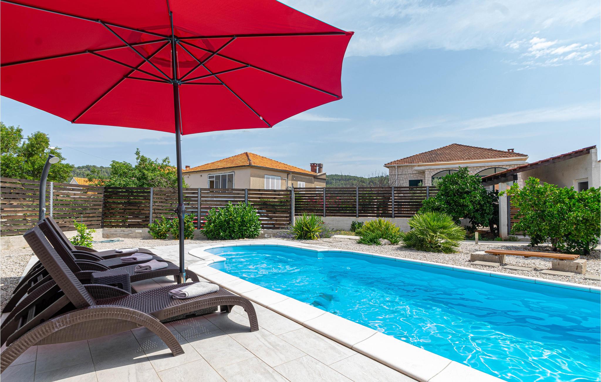 I en rolig bydel i Vela Luka ligger dette renoverede feriehus med pool. Det ligger på en velplejet og indhegnet grund der er velegnet hvis I har mindre børn med. Husets indre er enkelt og praktisk indrettet og lever om til nutidens krav til komfort. Fra stuen med køkken er der dør ud til den overdækkede terrasse, og derfra kun få skridt til afslapningsområde med pool, whirlpool og det udendørs køkken med grill. Der er kun 500 m til Vela Lukas centrum, hvor der er mange former for aktiviteter. I denne region kan I cykle, fiske, vandre og meget andet.