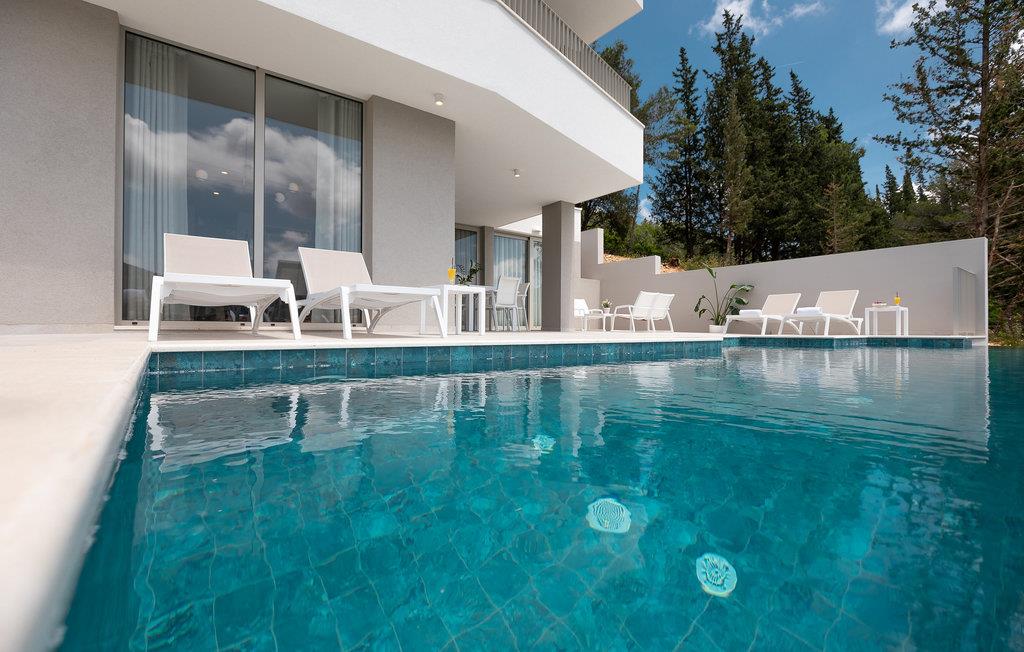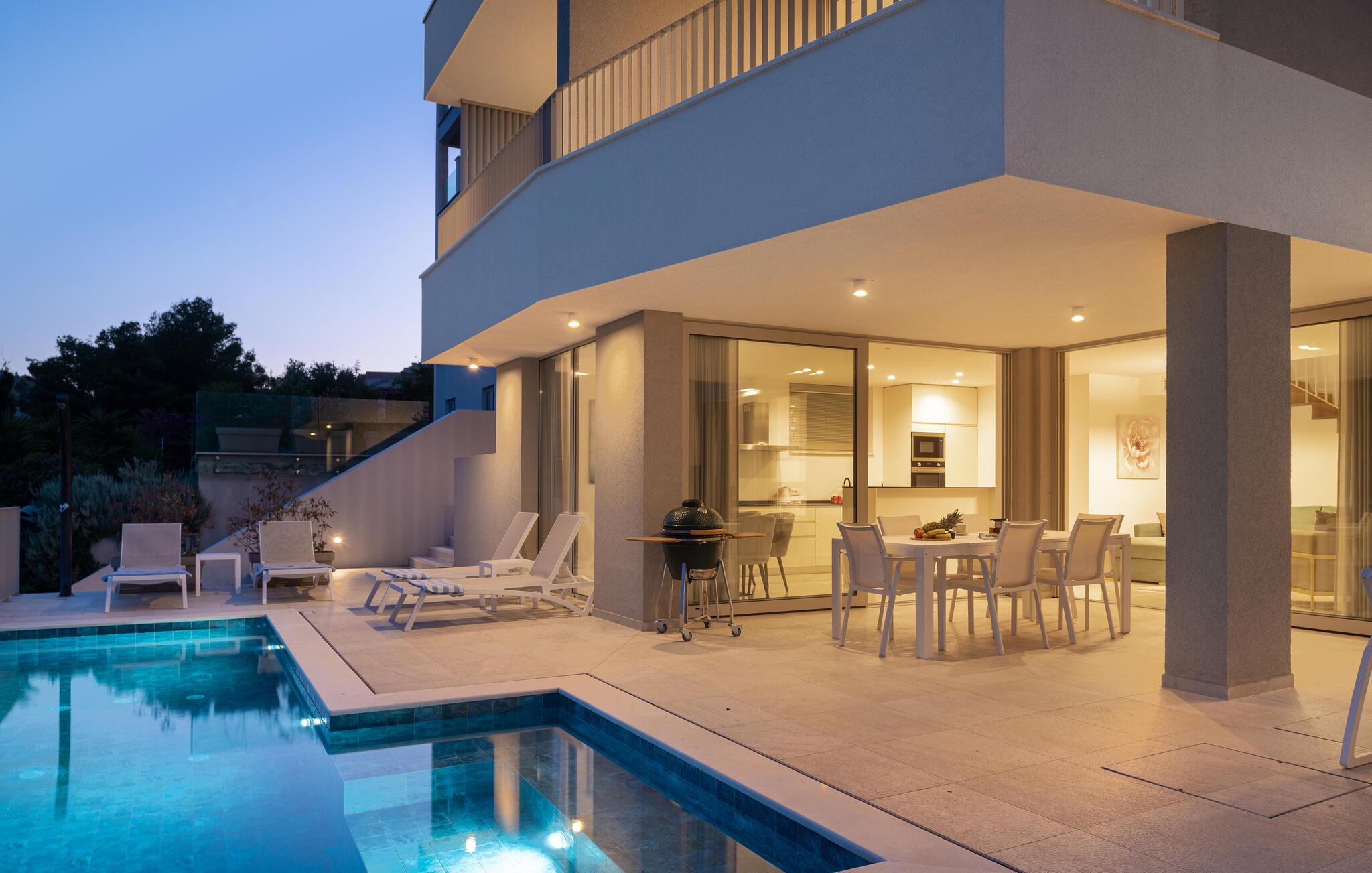 Træd ud på terrassen om morgenen, som åbner harmonisk mod havet, og tag en forfriskende dukkert i poolen. Spis morgenmad på balkonen, slap af på liggestolene med en let drink og afslut dagen med en mindeværdig middag med familie eller venner under stjernerne.