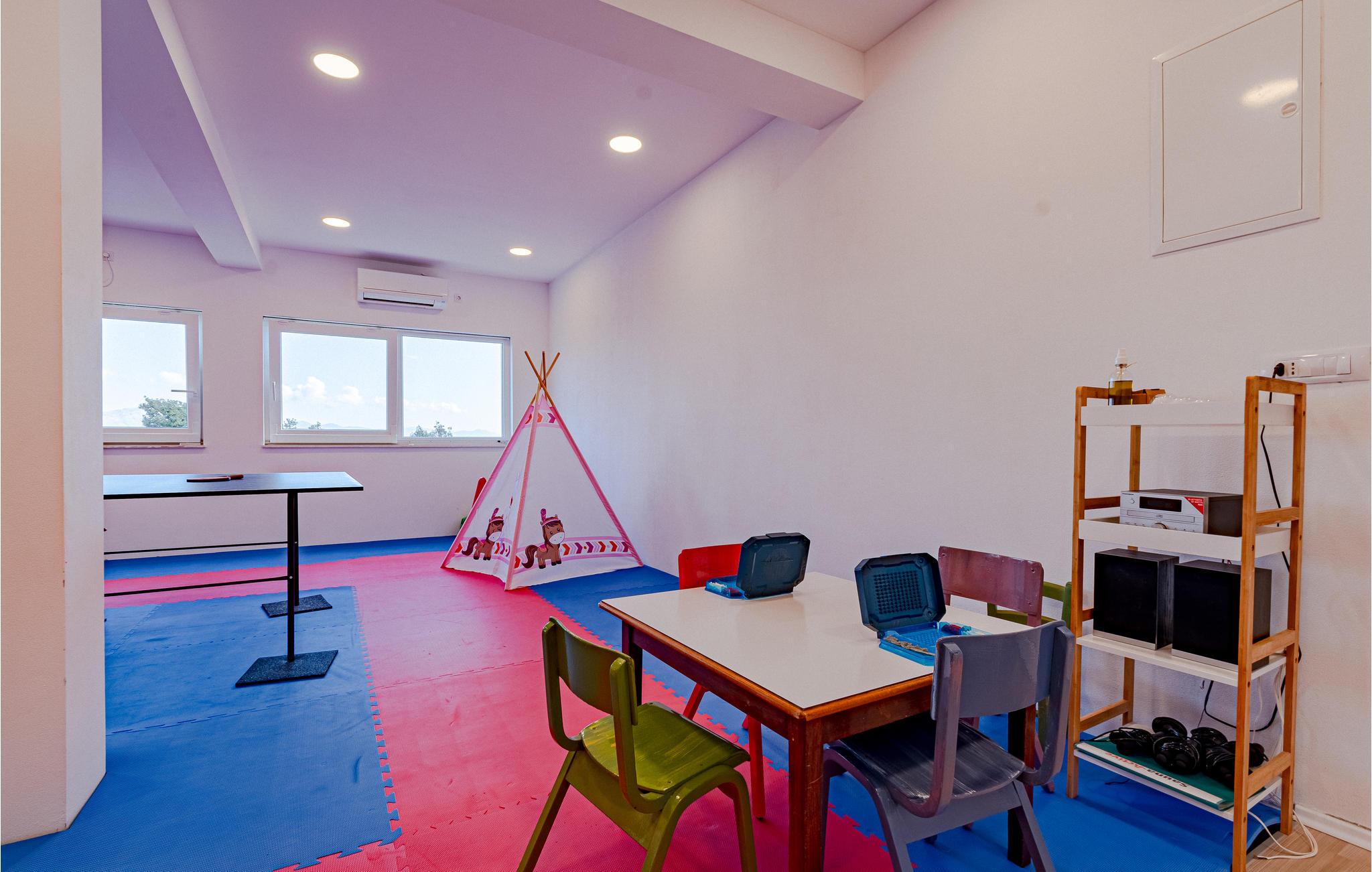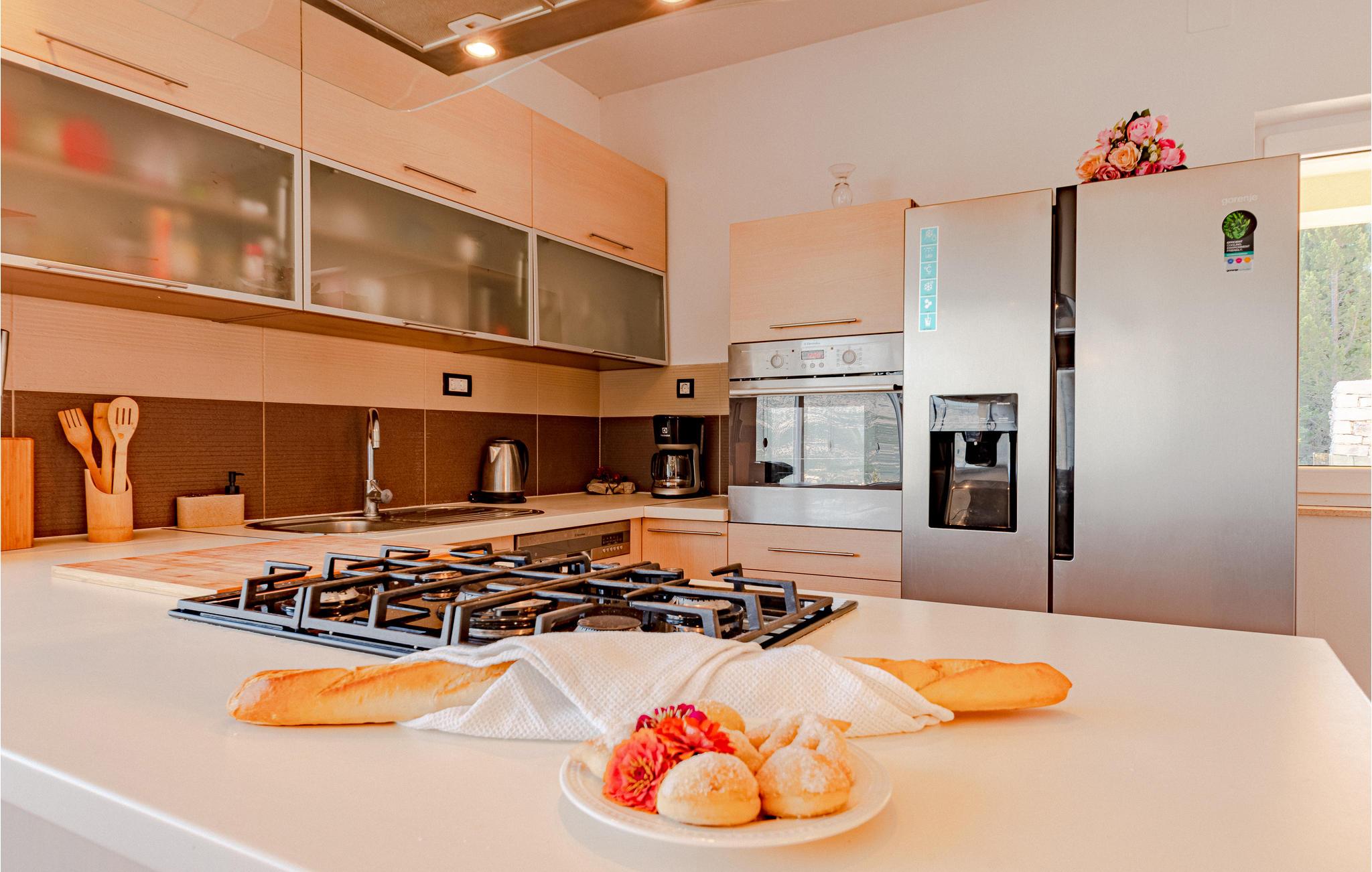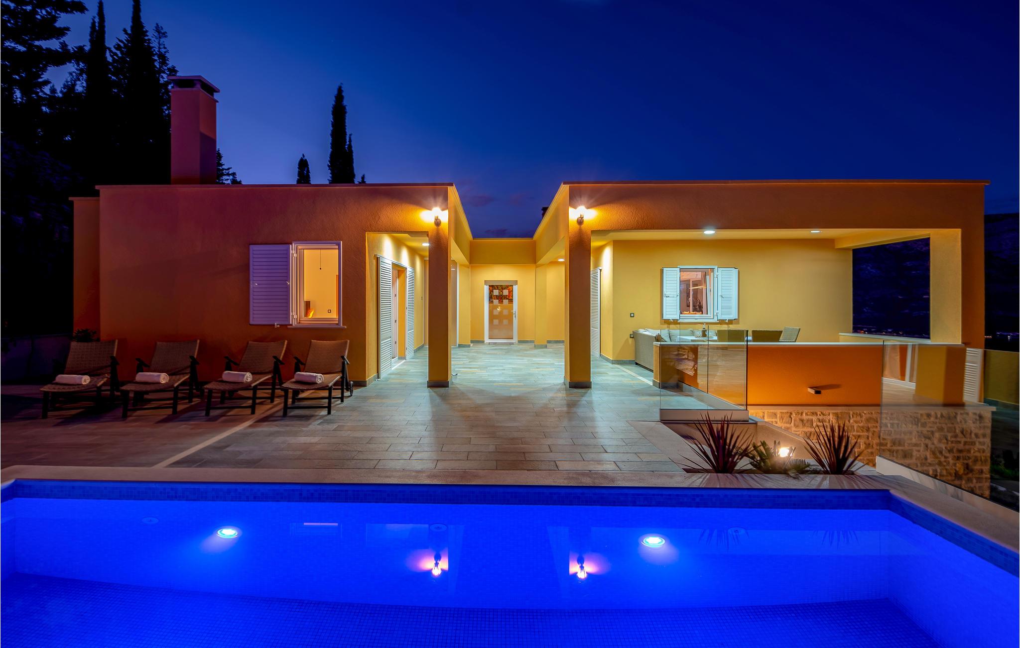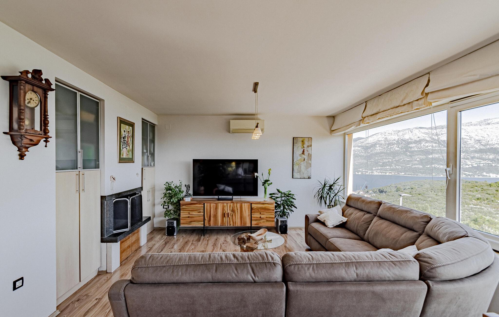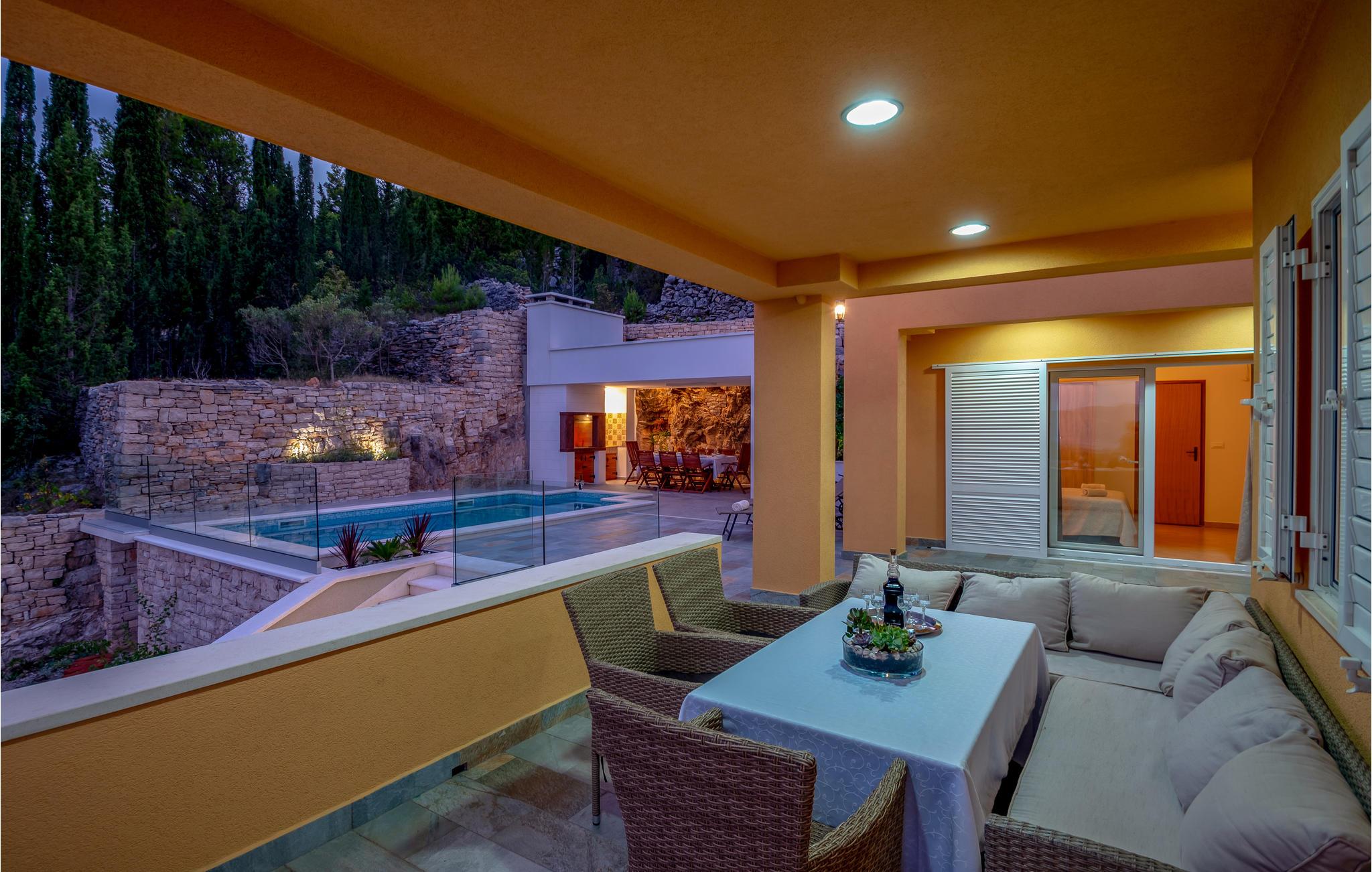 I udkanten af den autentiske lille by Žrnovo og på vej til den maleriske bugt Žrnovska Banja ligger dette familievenlige feriehus. Ved siden af terrassen med pool, grill og spiseafdeling er der en lounge hvor I kan slappe af. På samme etage ligger den moderne stue med unik udsigt ud over Pelješackanalen, et lækkert køkken og fire soveværelser samt tre badeværelser I stueplan er der et fitnessrum, en sauna og en legplads. Her er meget ugenert og I har kun fem minutter i bil til de nærmeste strande, den magiske by Korcula og meget andet.